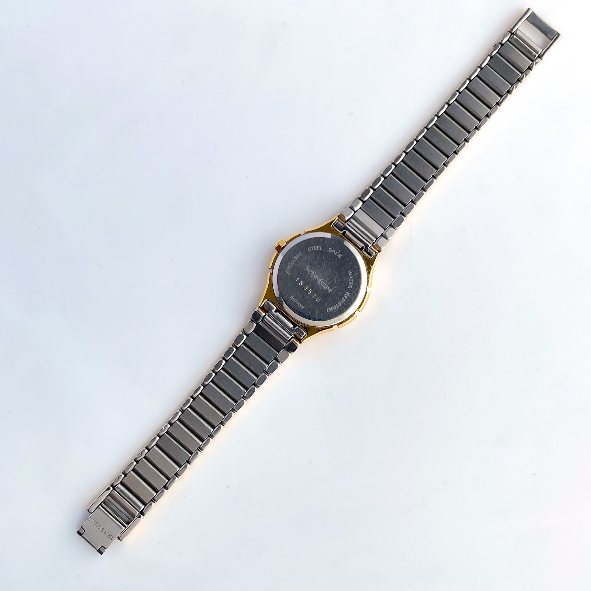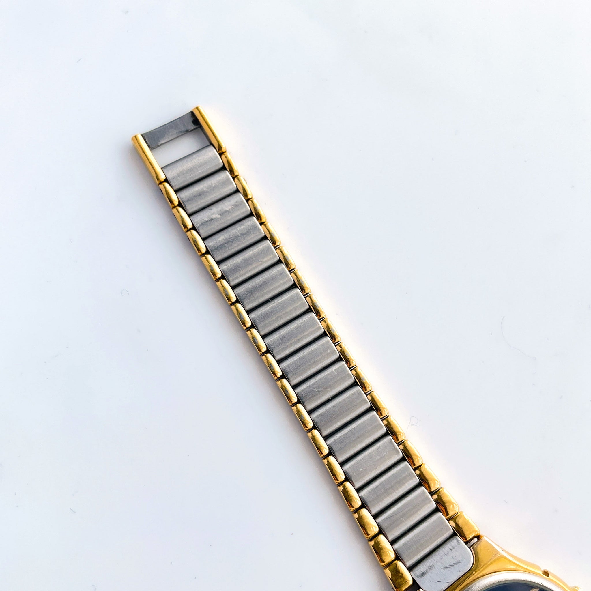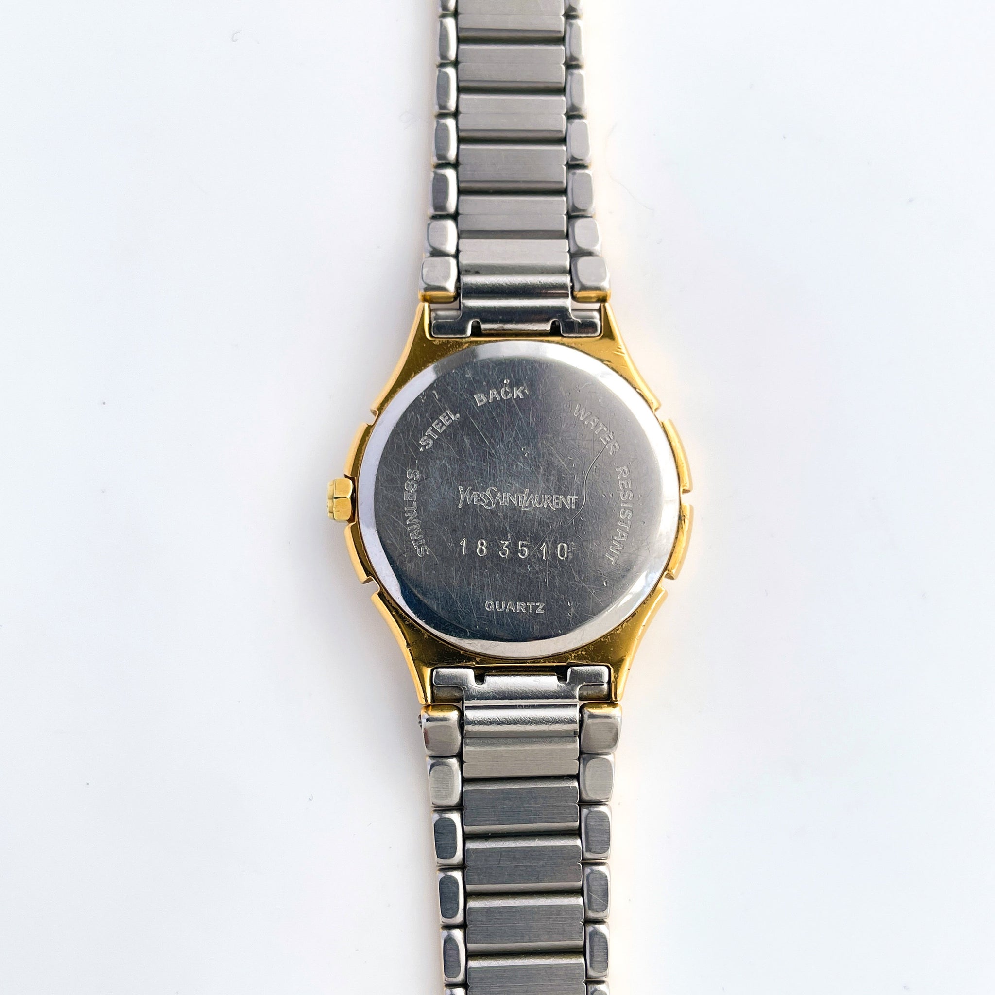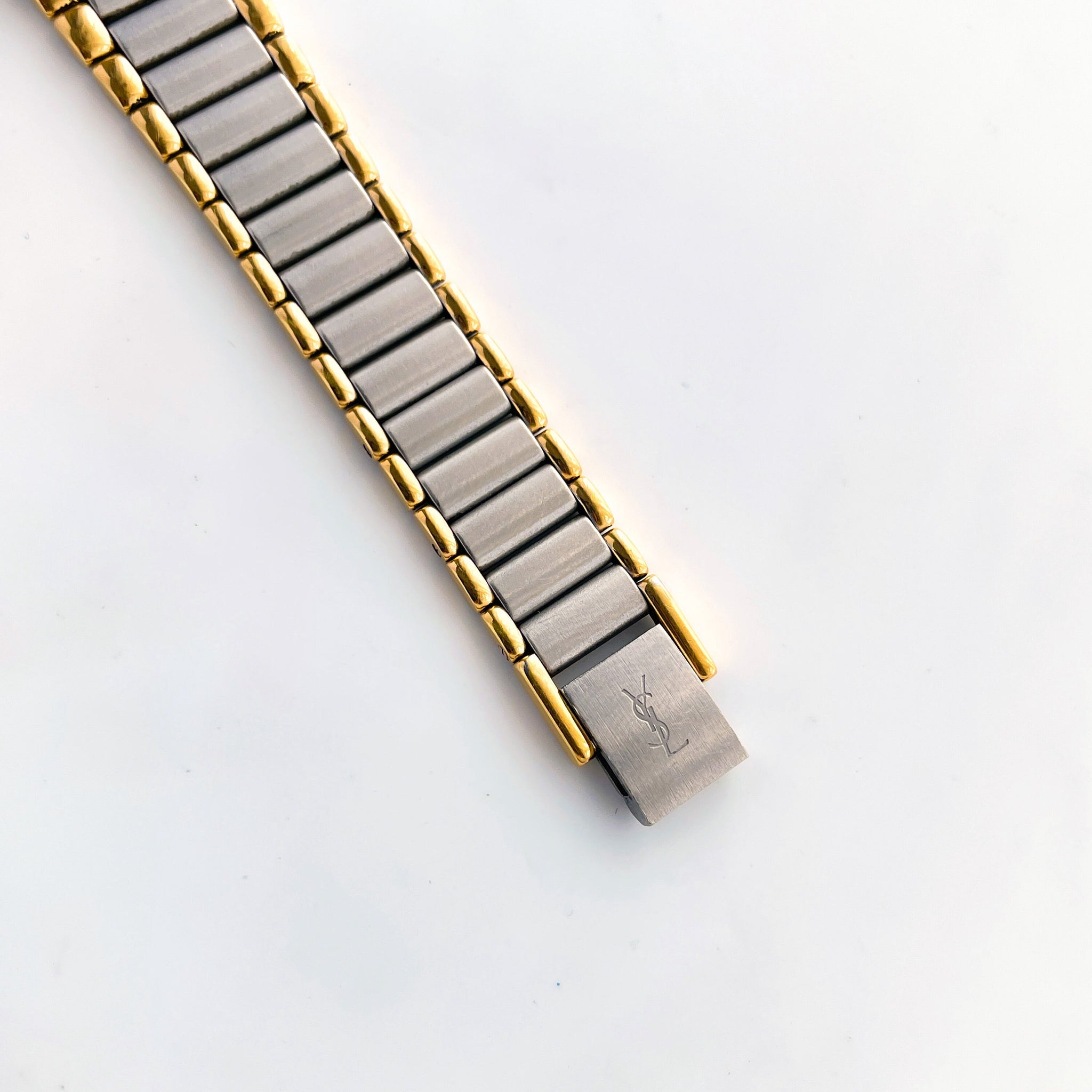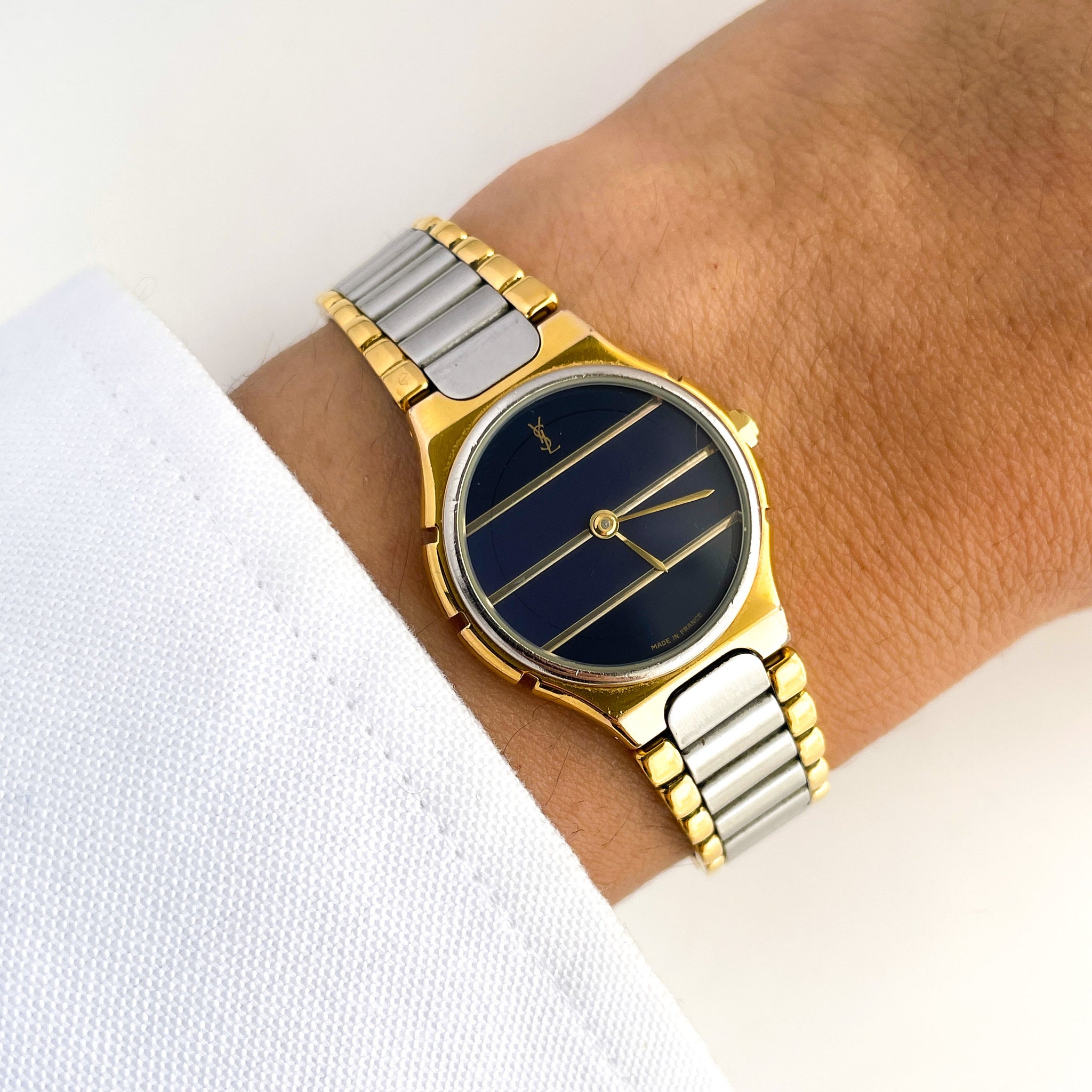 Ladies' Yves Saint Laurent 90s watch with striped dark blue dial and two-tone stainless steel bracelet. A unique and elegant piece from the iconic French designer.
