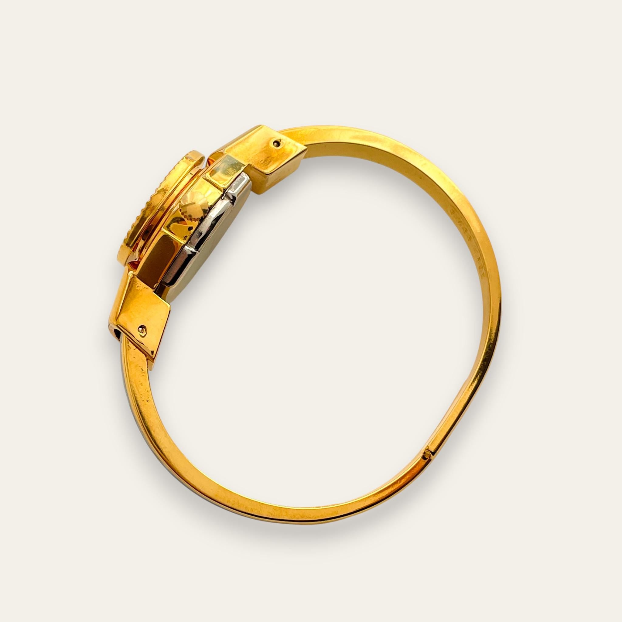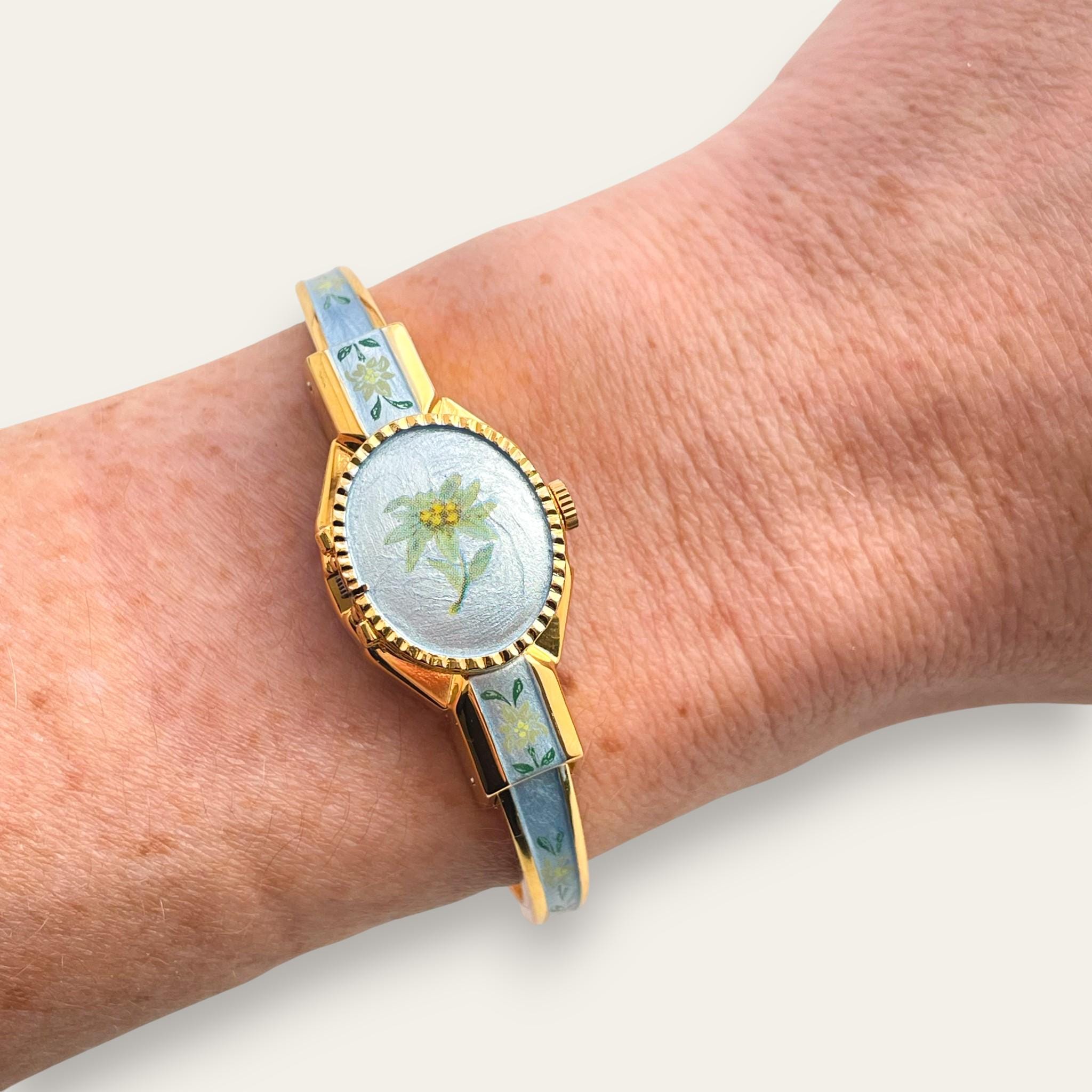 Dainty vintage André Mouche peek-a-boo cocktail watch, with concealed white dial and gold-plated bangle bracelet. Beautiful floral design painted on light blue enamel background. A feminine and elegant piece that combines a typically vintage style with the practicality of a battery-operated quartz movement.