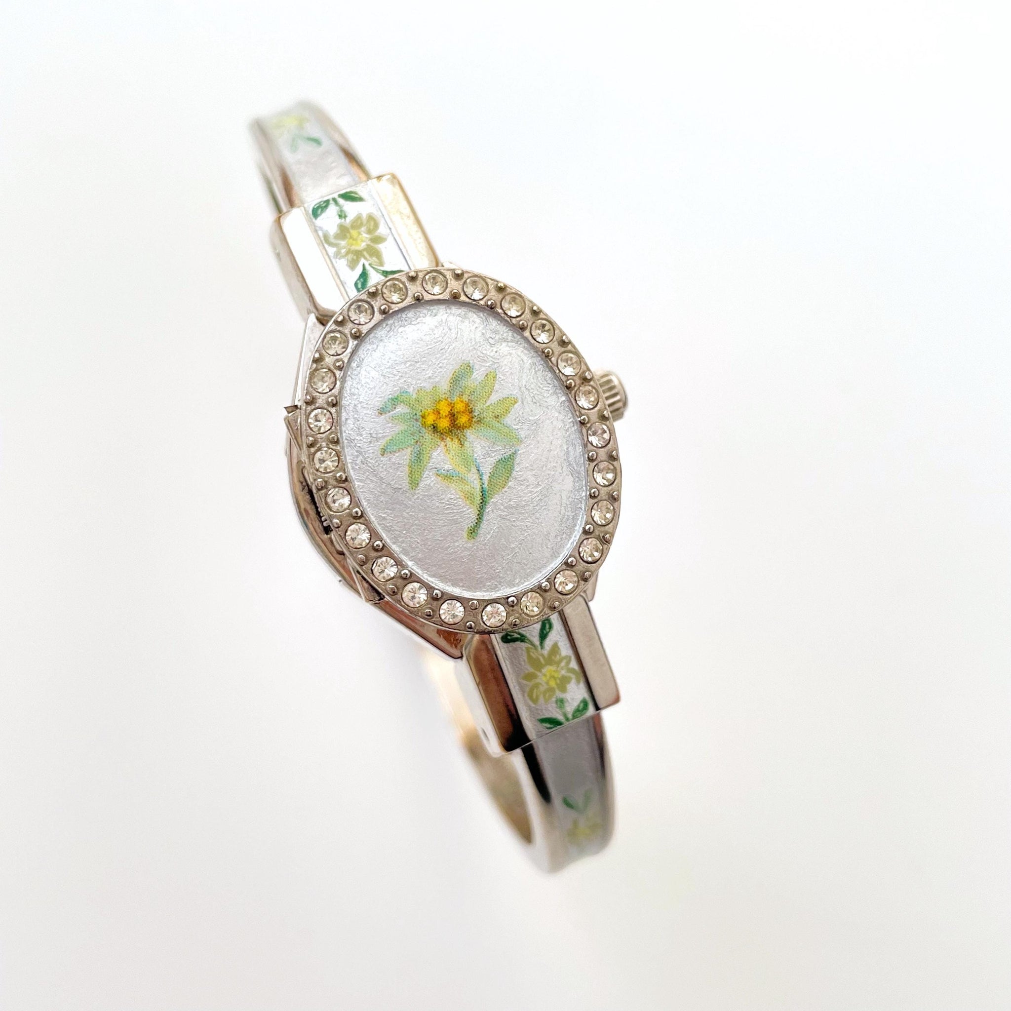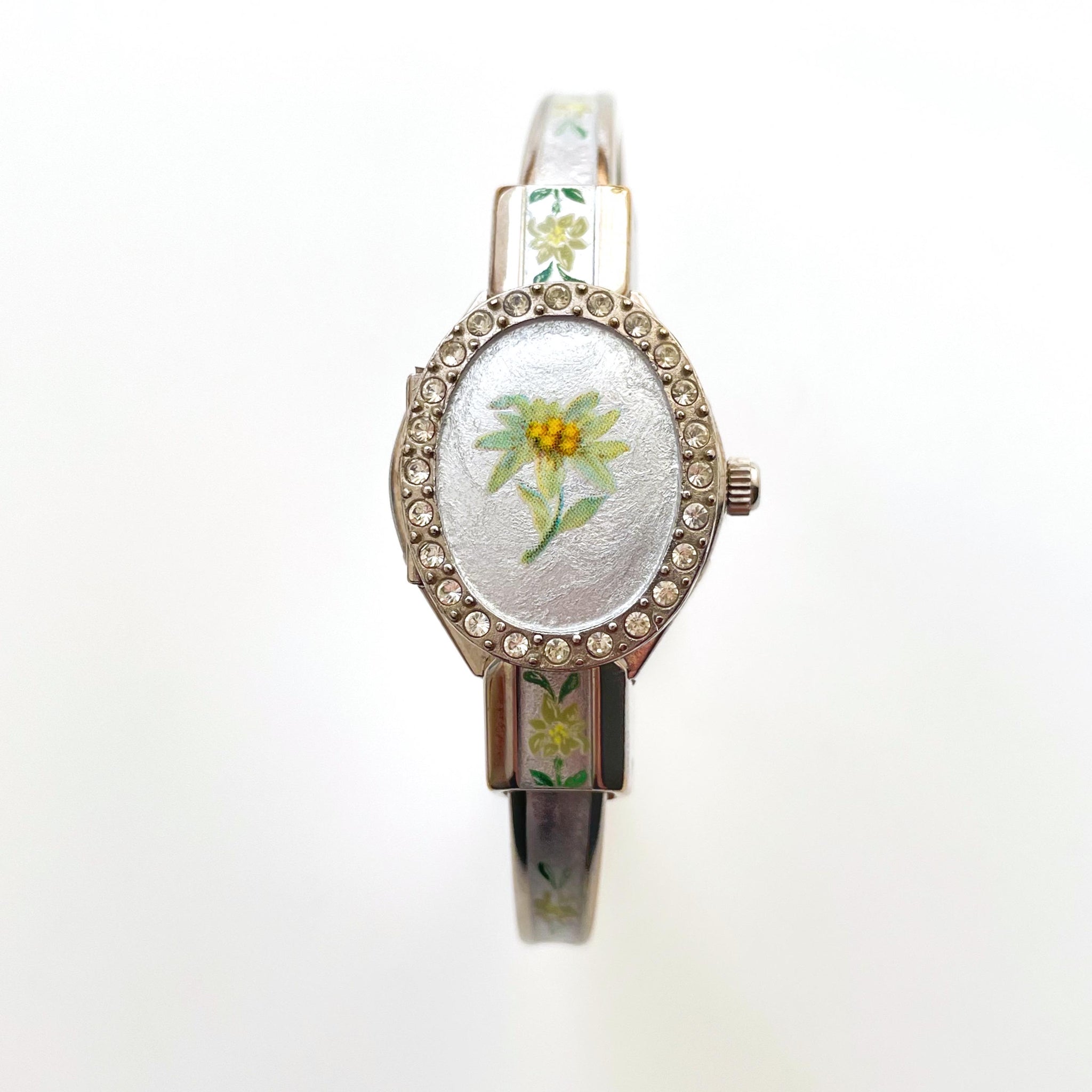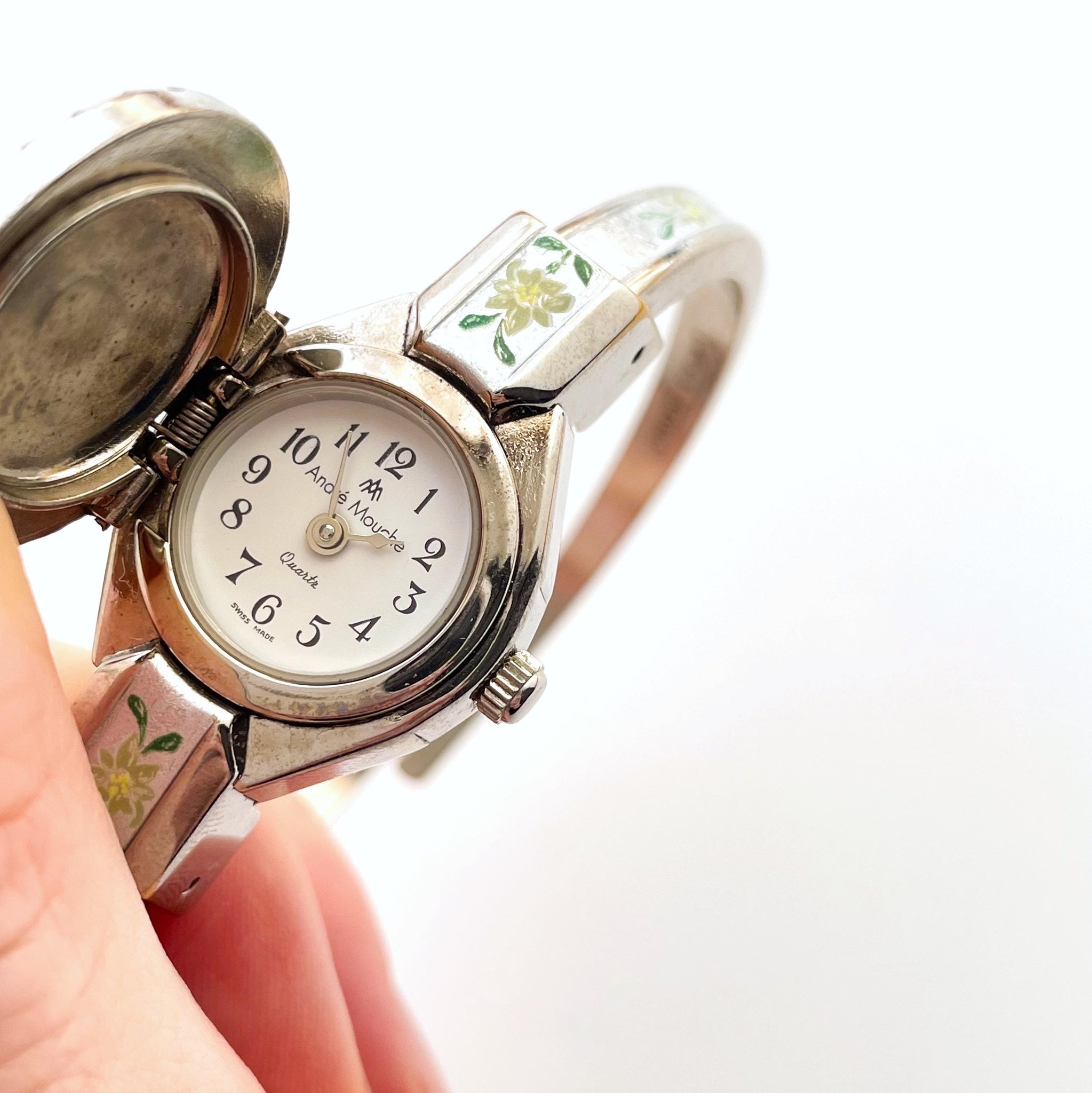 Dainty vintage André Mouche peek-a-boo cocktail watch, with concealed white dial and stainless steel bangle bracelet. Beautiful floral design painted on silver enamel background. Crystal-set bezel. A feminine and elegant piece that combines a typically vintage style with the practicality of a battery-operated quartz movement.