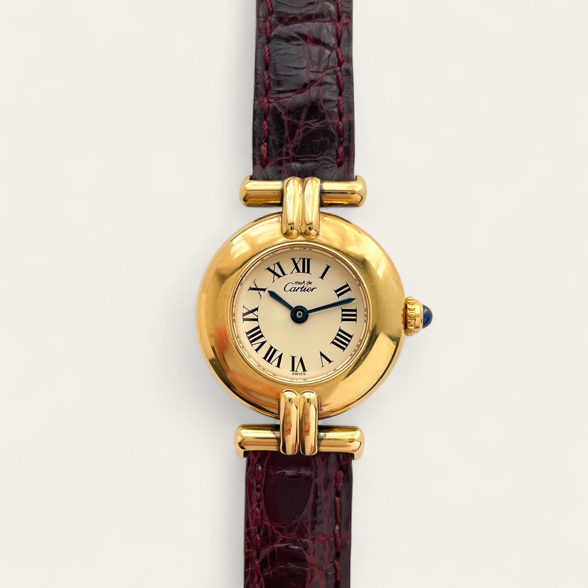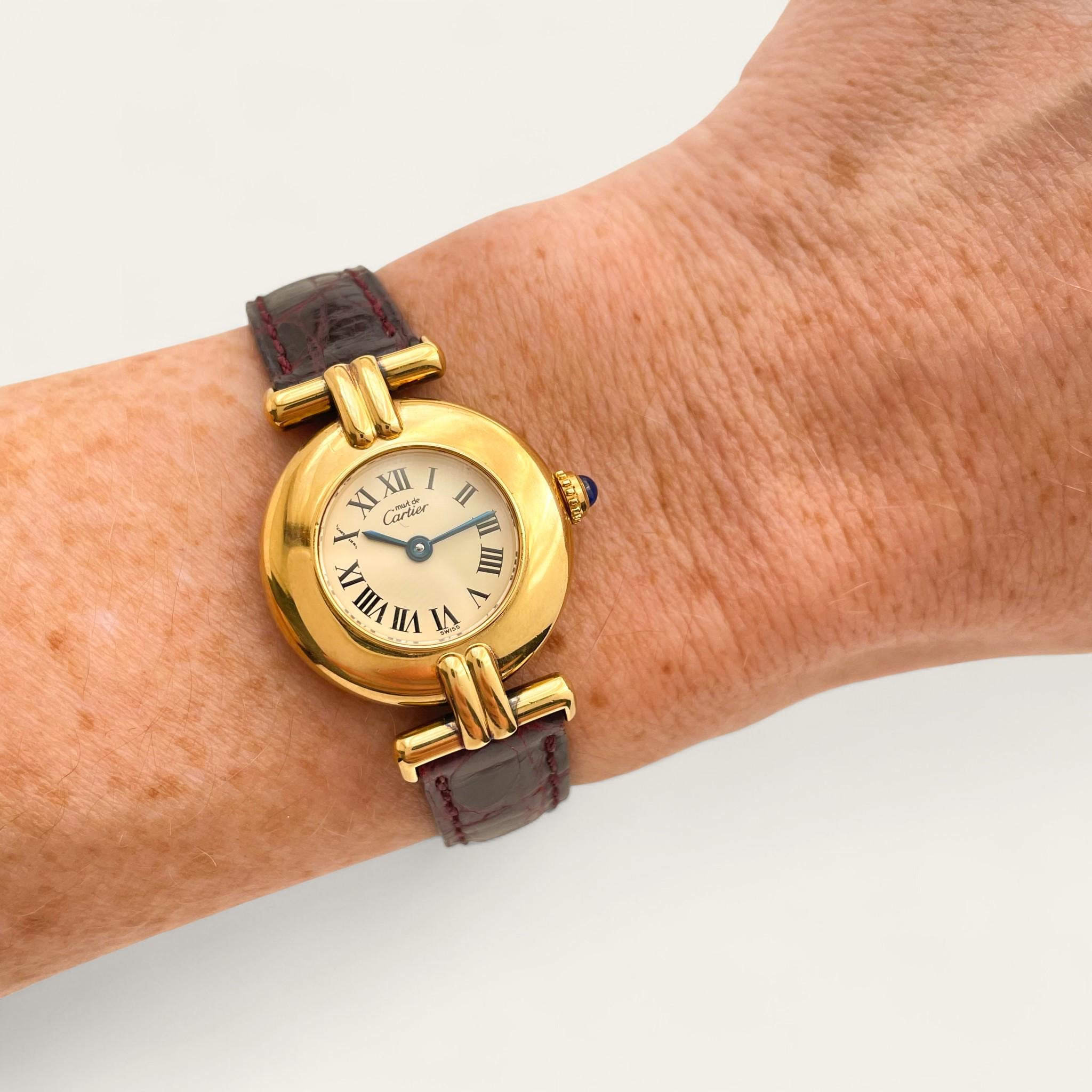 Vintage ladies' Must de Cartier Colisée Vermeil, with beige dial, Roman numerals and brown leather strap with tang buckle. 20 microns 18ct gold-plated 925 silver. Blue cabochon crown. A mythical piece from the French luxury brand.