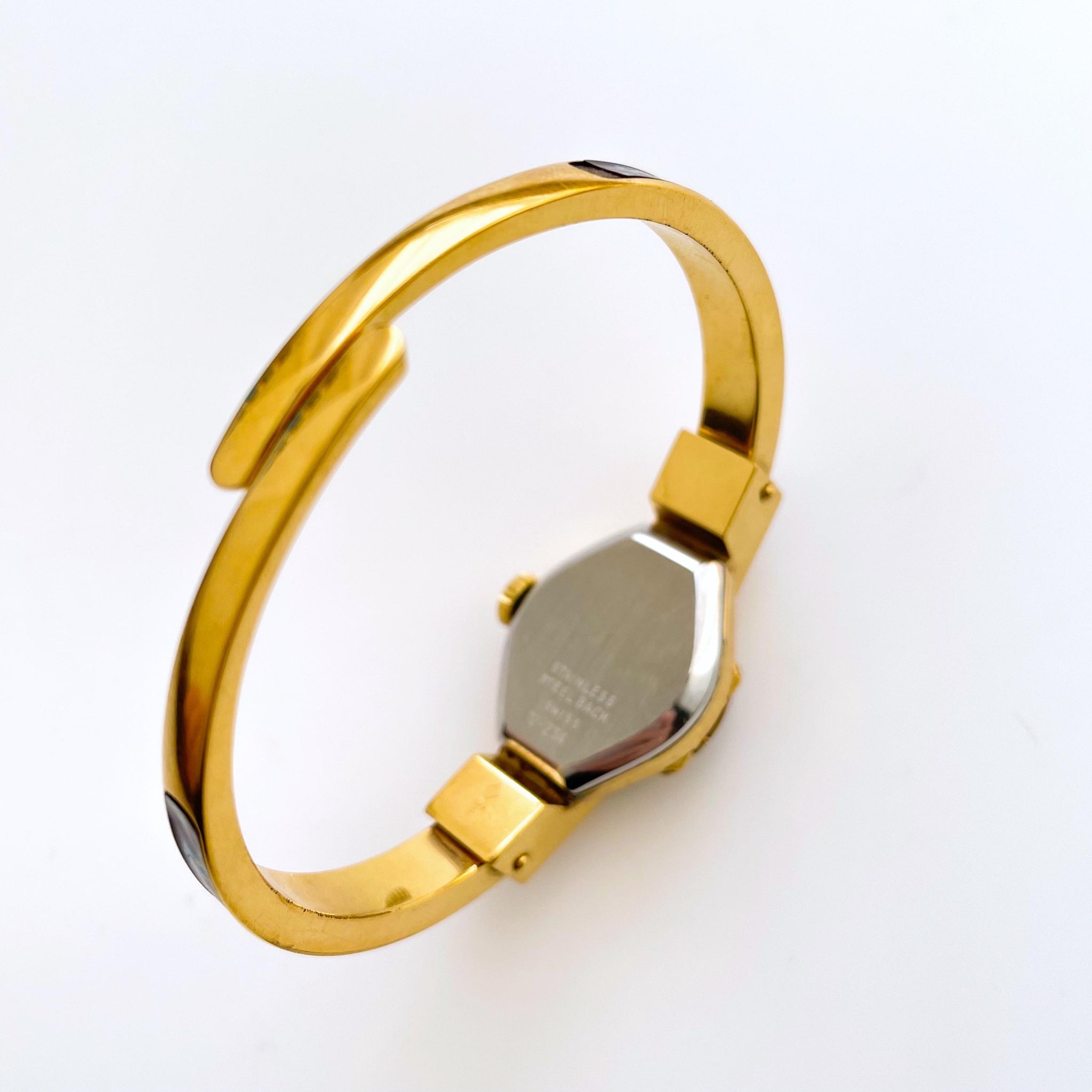 Dainty vintage Chandler peek-a-boo cocktail watch, with concealed gold dial and 10 micron gold-plated bangle bracelet. Beautiful purple floral design painted on black enamel background. A feminine and elegant piece.