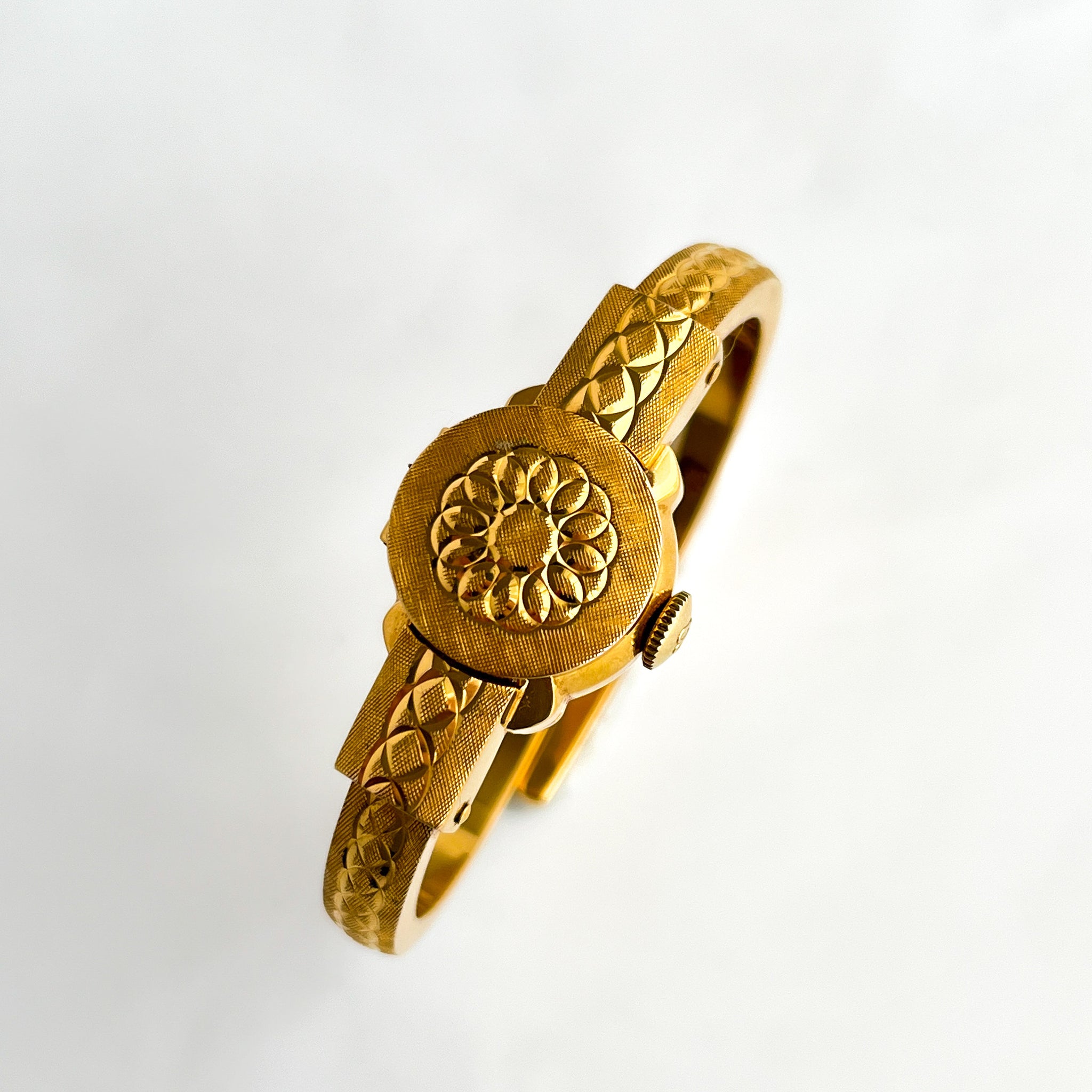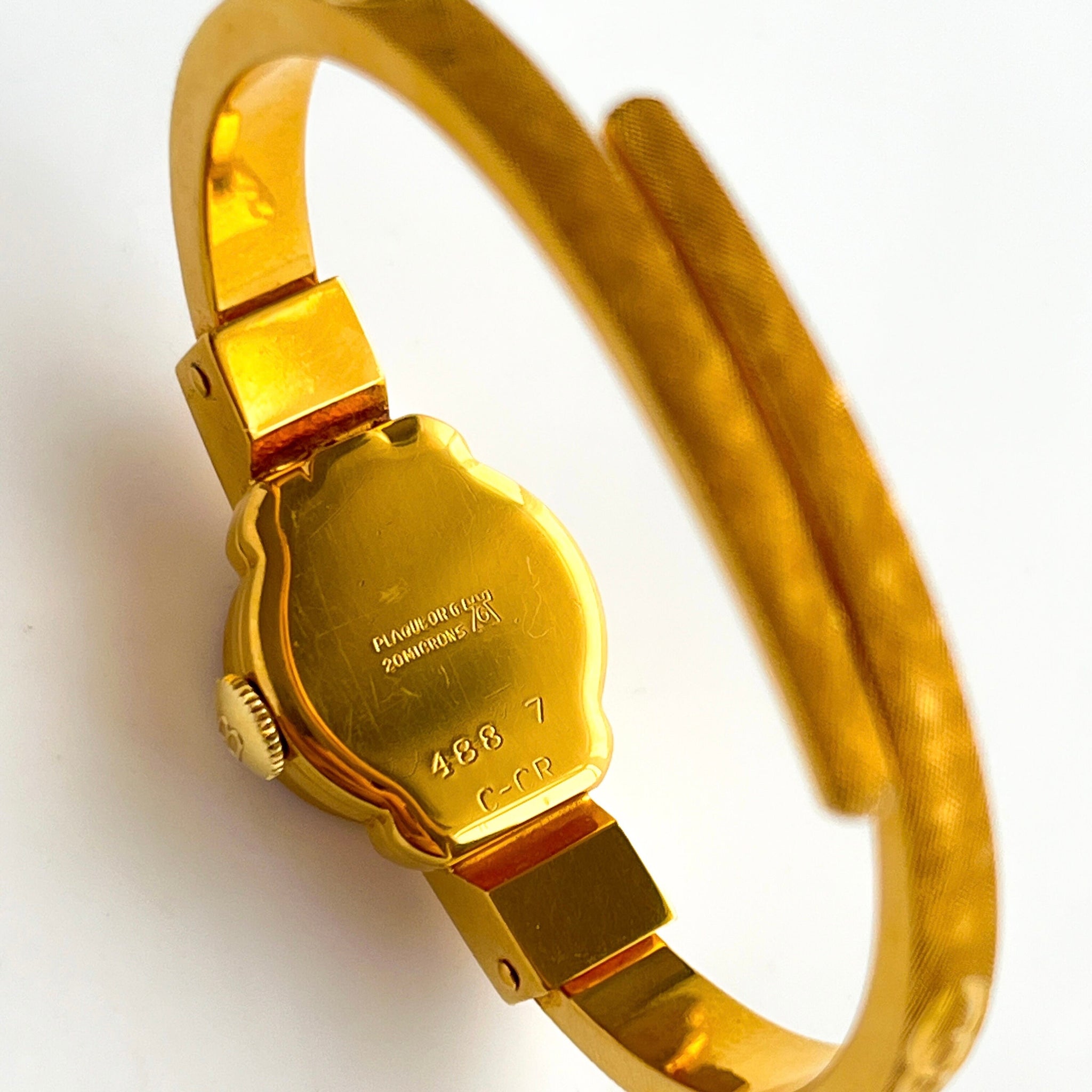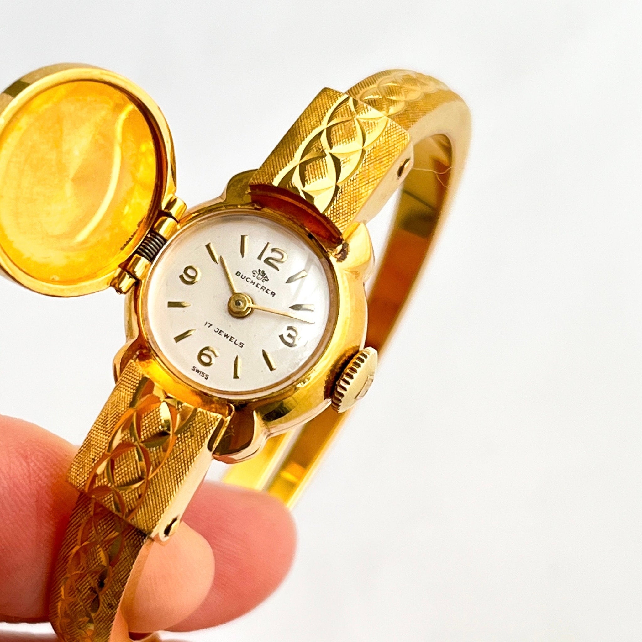 Elegant vintage 20 micron gold-plated Bucherer Swiss bangle watch with hidden dial