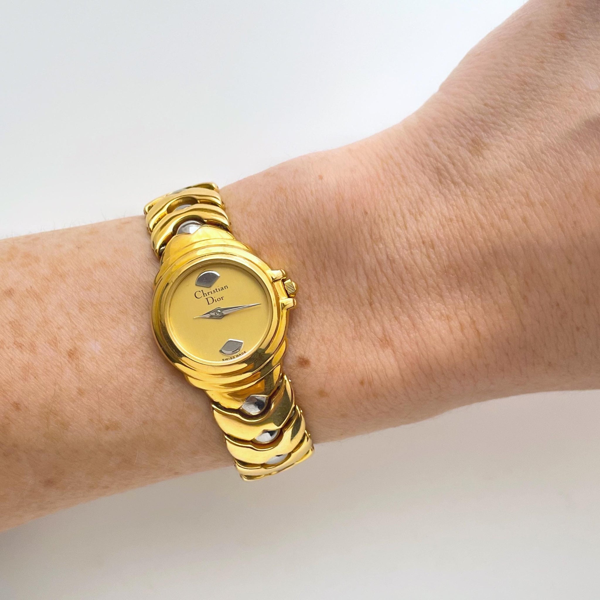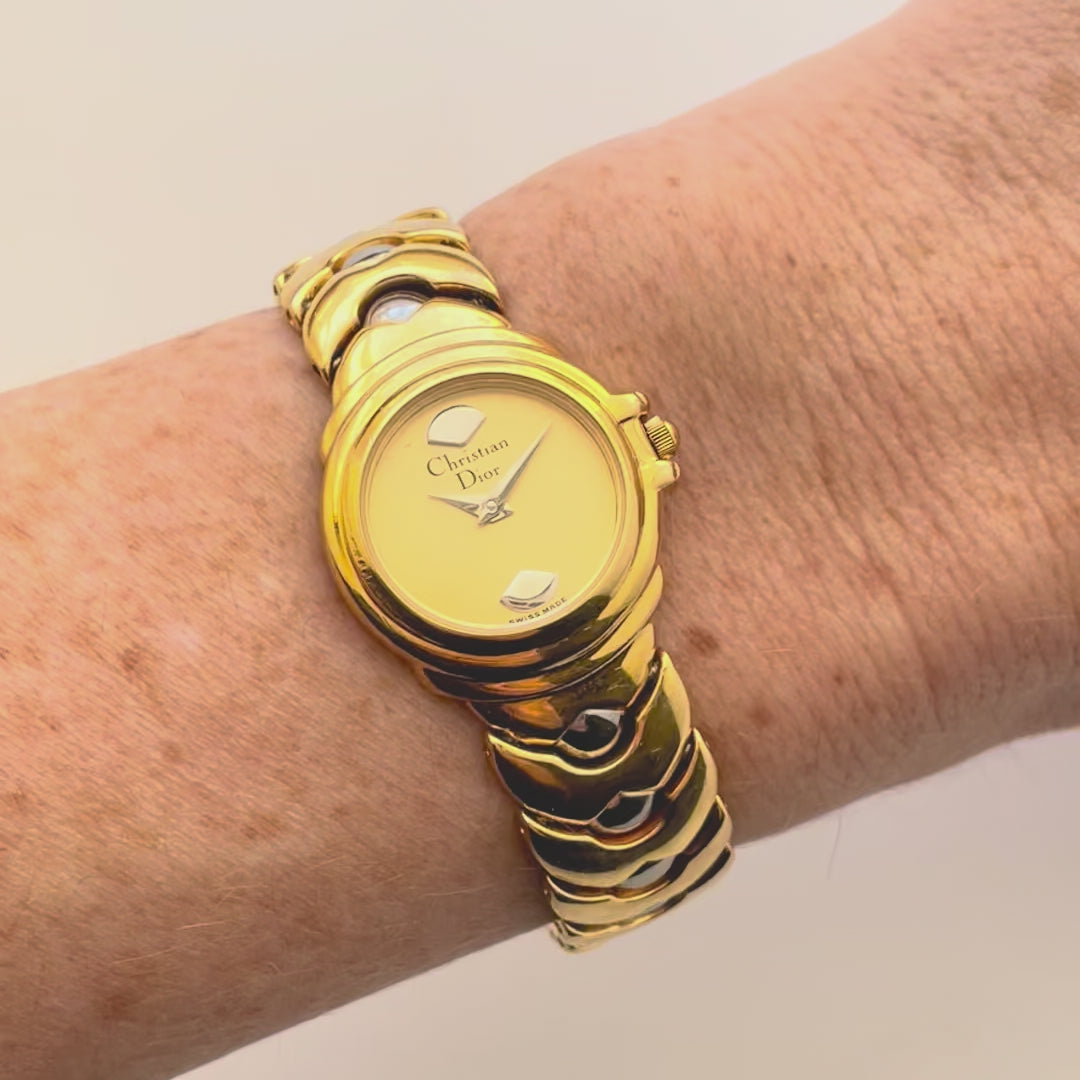 Ladies' gold-plated Christian Dior 90s watch with silver accents and butterfly (hidden) clasp. A unique and elegant piece from the French designer.