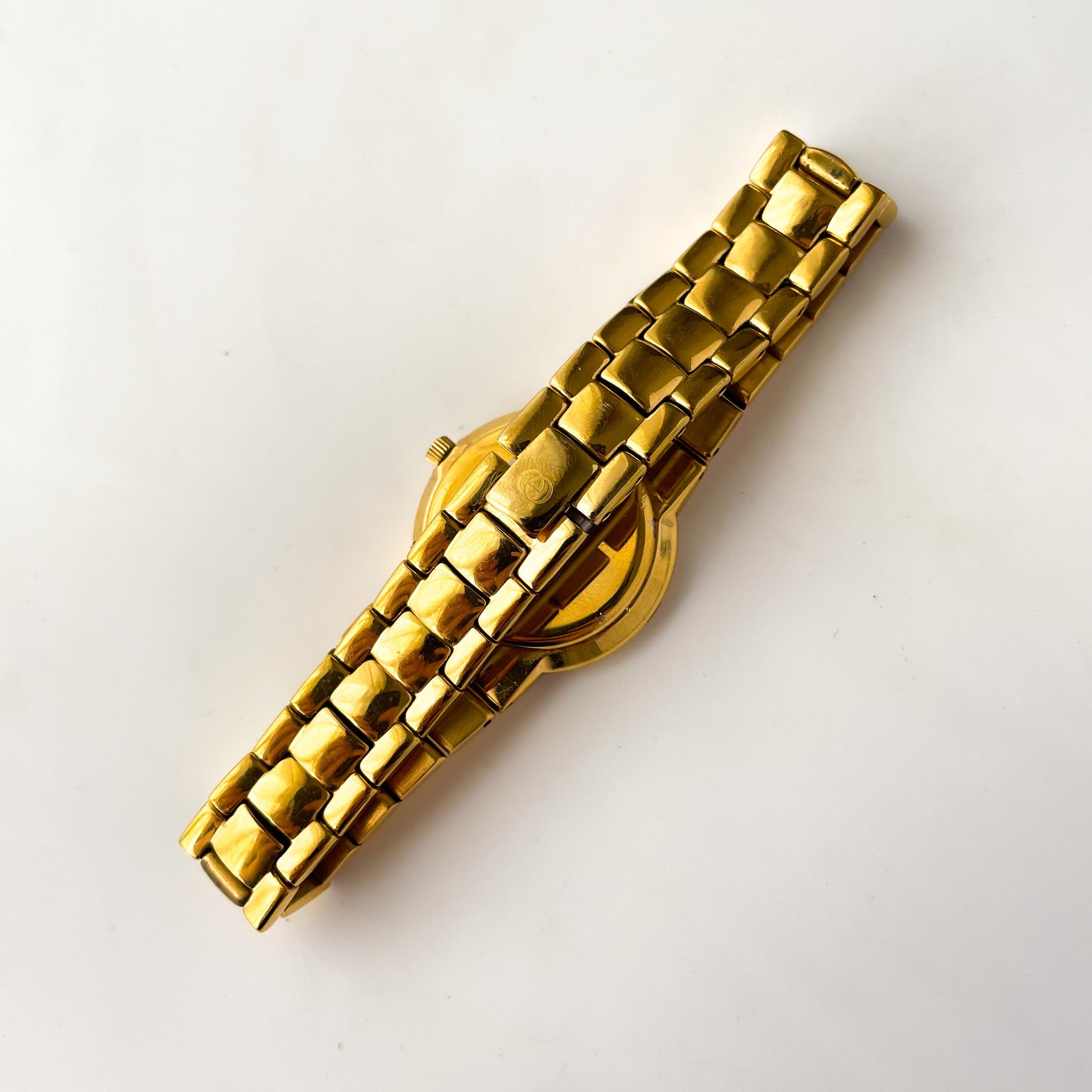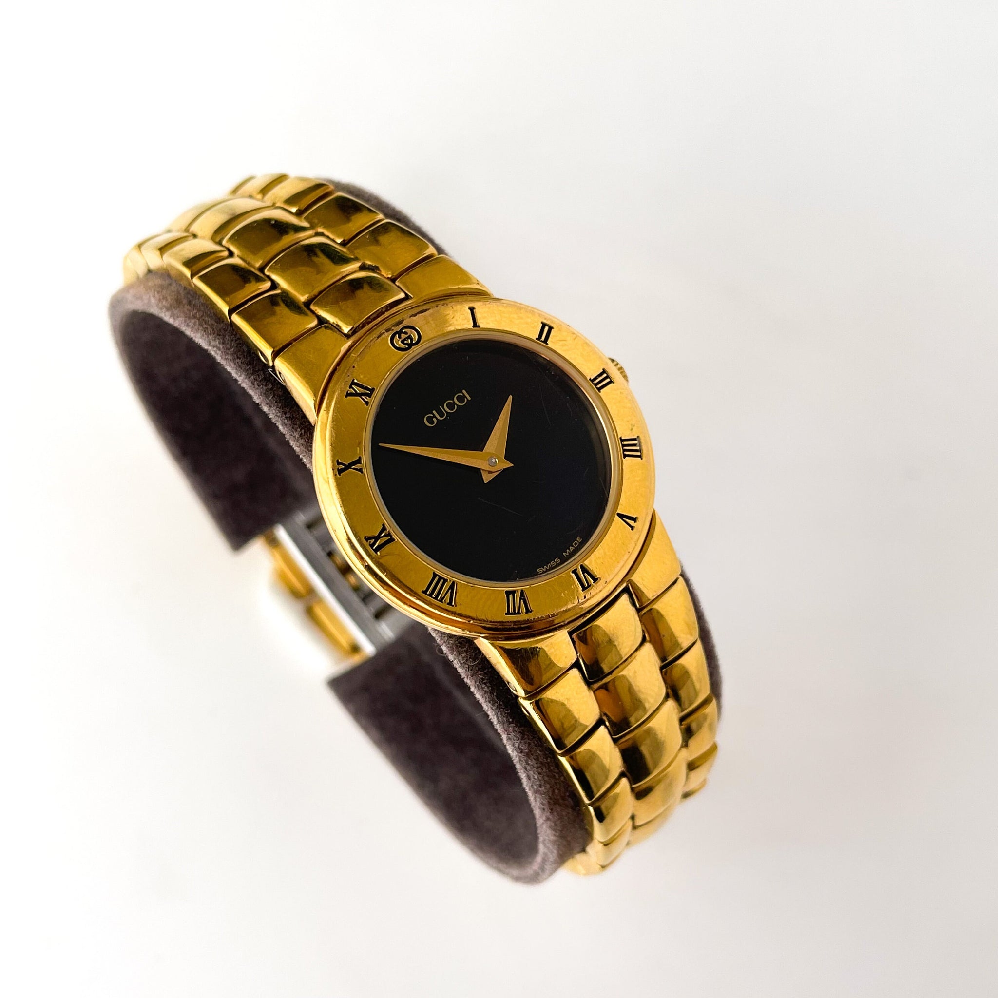Dainty ladies' Gucci watch, with black dial and Roman numerals around the bezel. Logo engraved on the crown and on the clasp. Gold-plated bracelet with butterfly clasp. Overall a very feminine and stylish piece from one of the most renown Italian fashion brands, in very good condition.