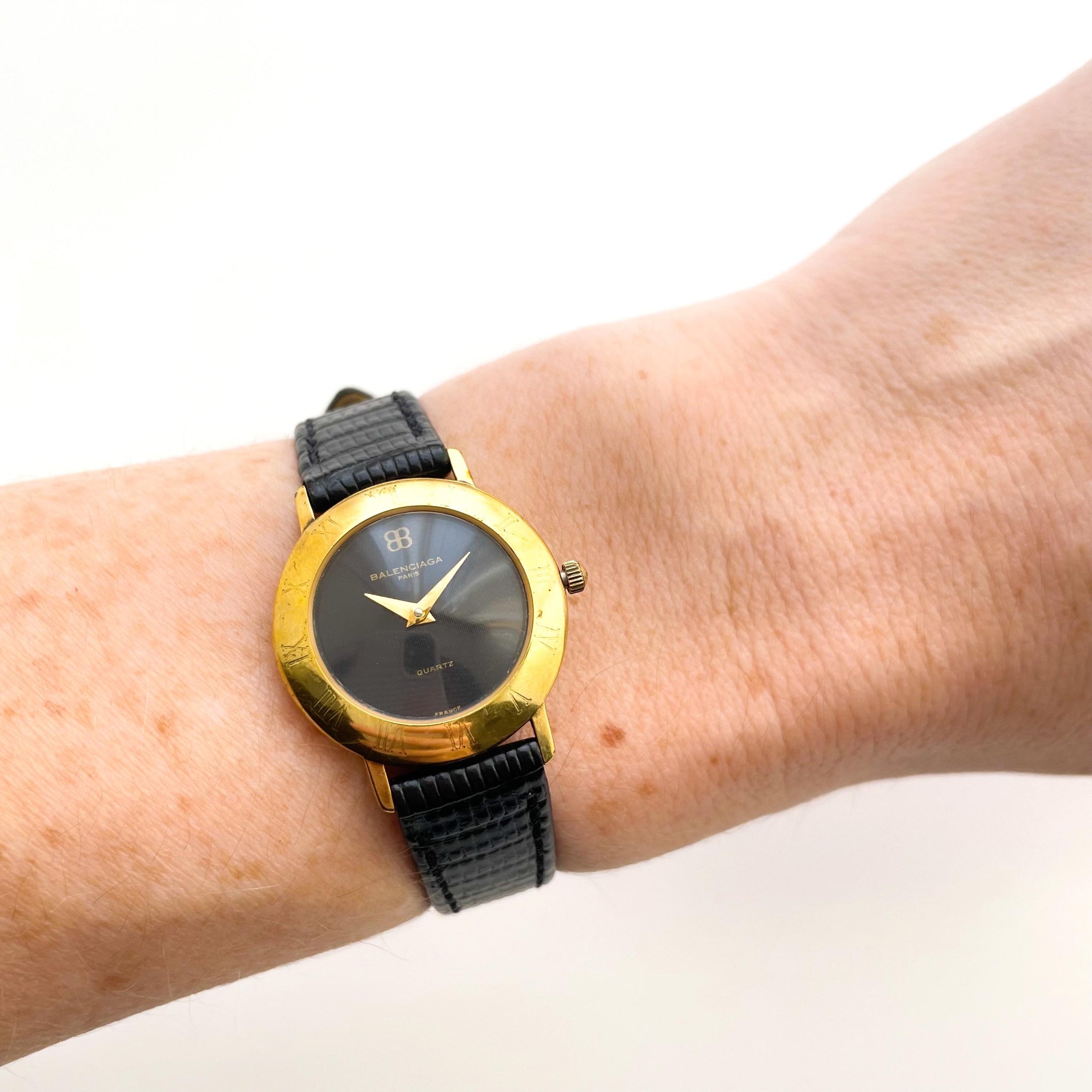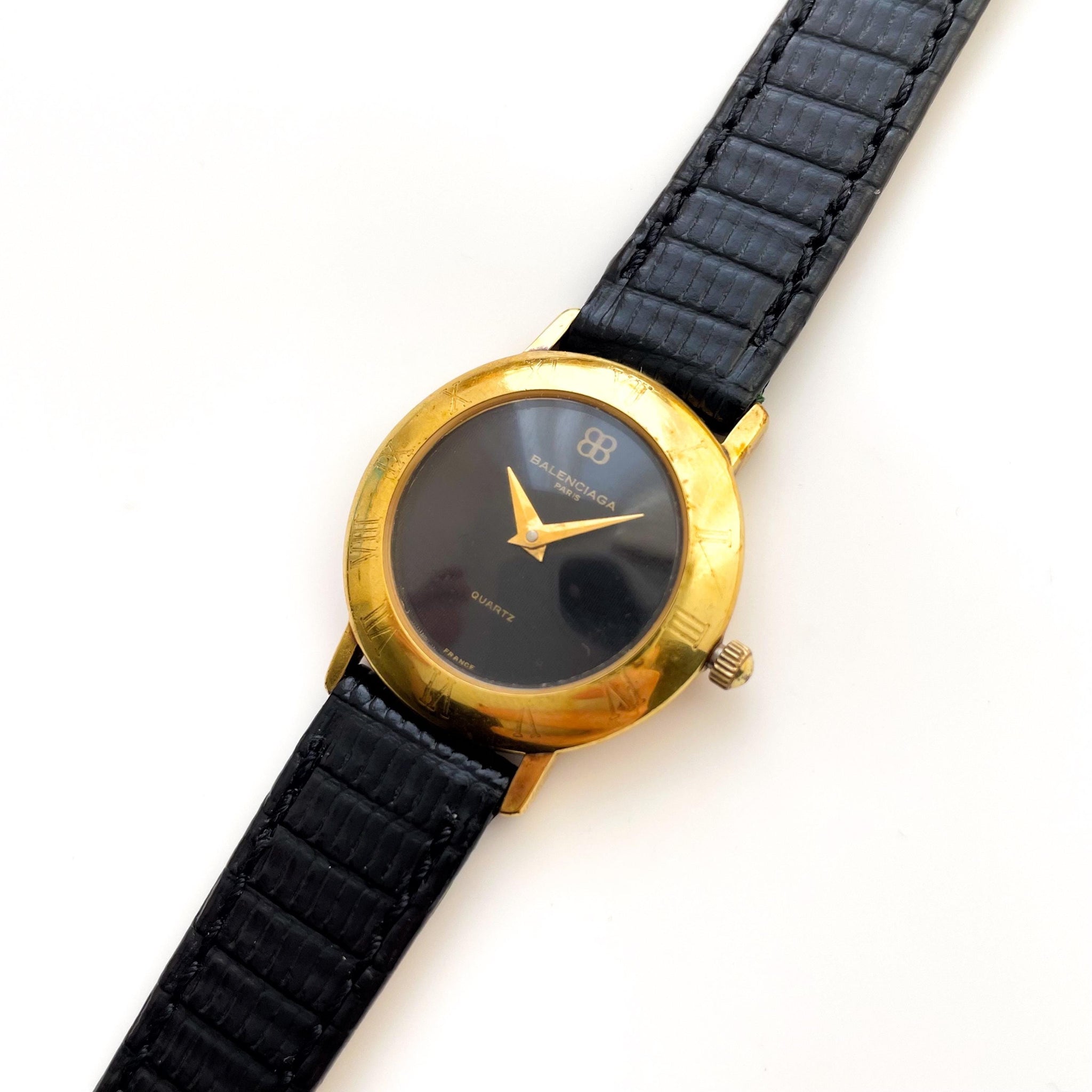Vintage ladies' Balenciaga gold-plated watch with round dial and black leather strap. A very elegant watch from the French designer.