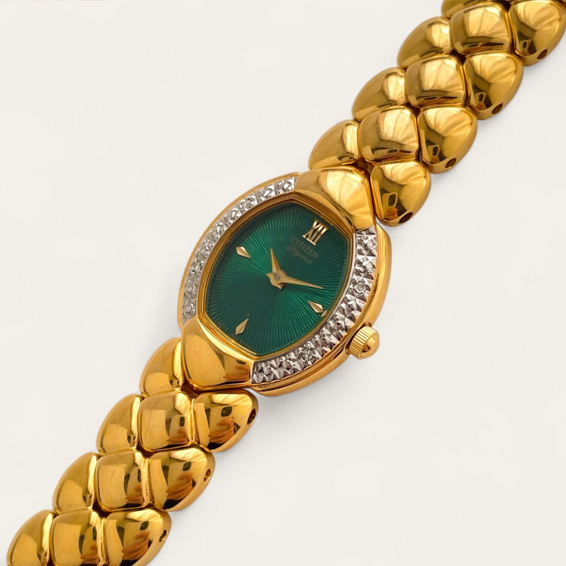 Ladies' 90s gold-plated Citizen Elegance watch with green textured dial and diamond-set bezel. A beautiful and rare vintage model.