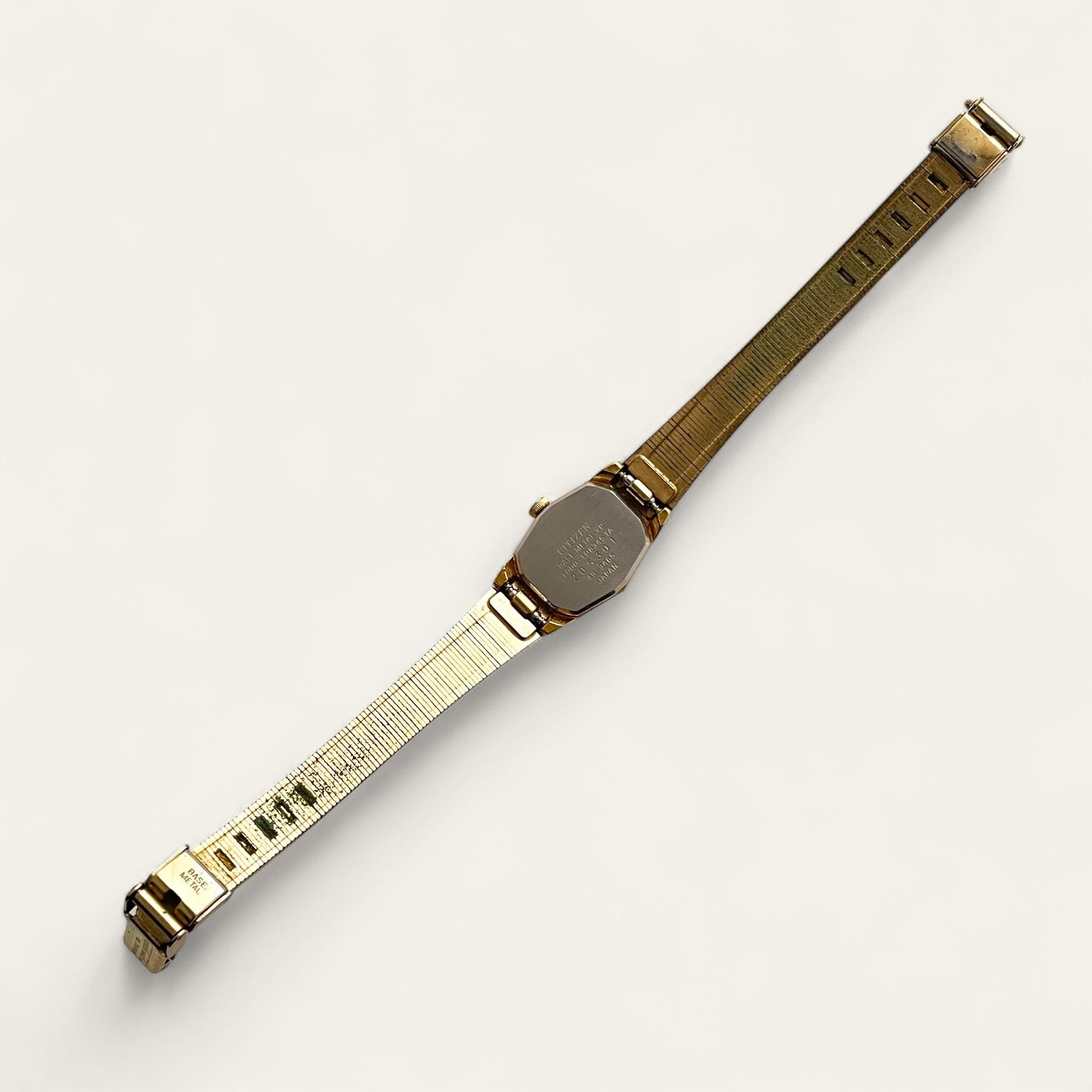 Tiny ladies' gold-tone Citizen watch with black dial and integrated bracelet. A dainty and elegant vintage watch.