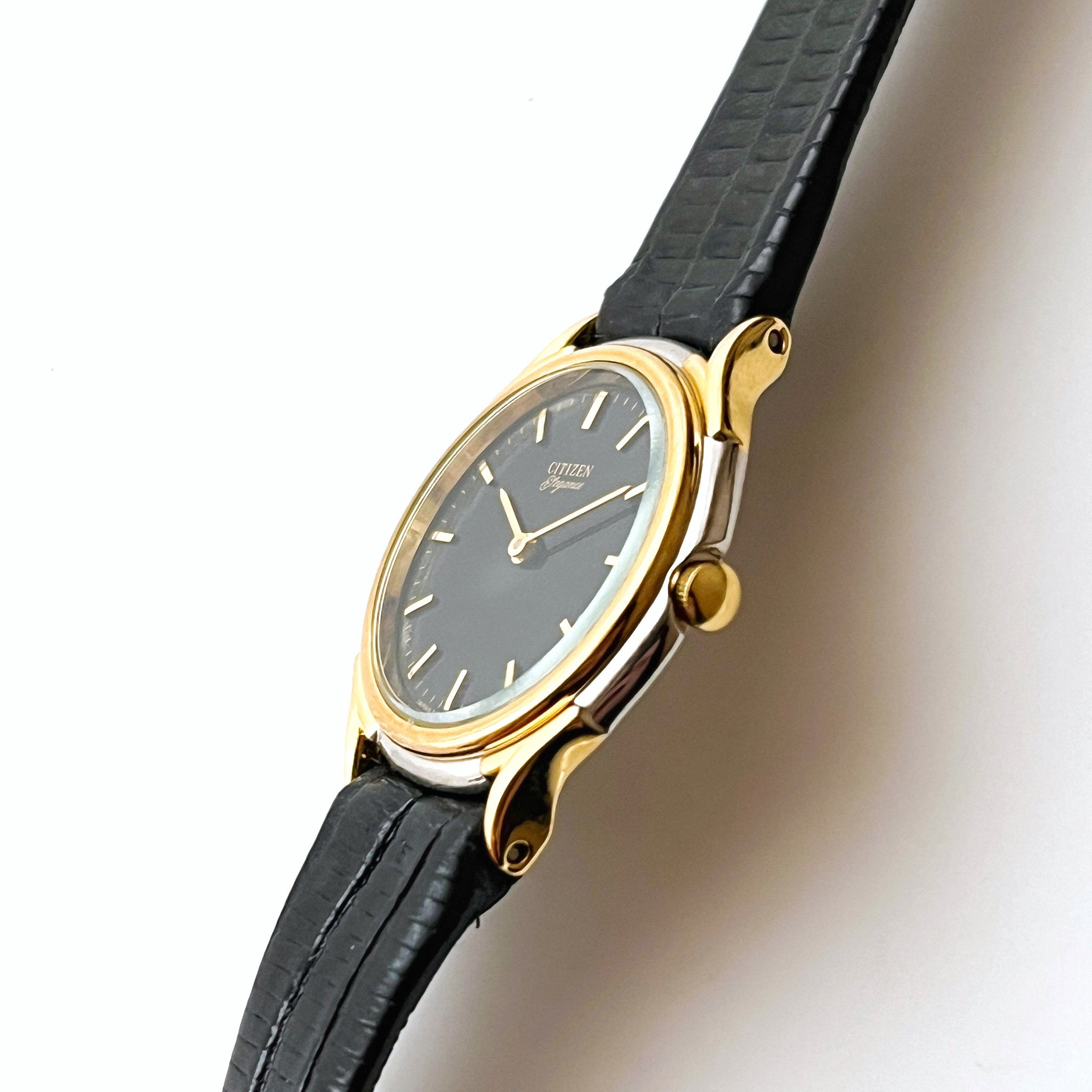 Vintage ladies' Citizen Elegance gold-plated watch with round dial and black leather strap. New old stock, unworn, label still attached. All original including strap.