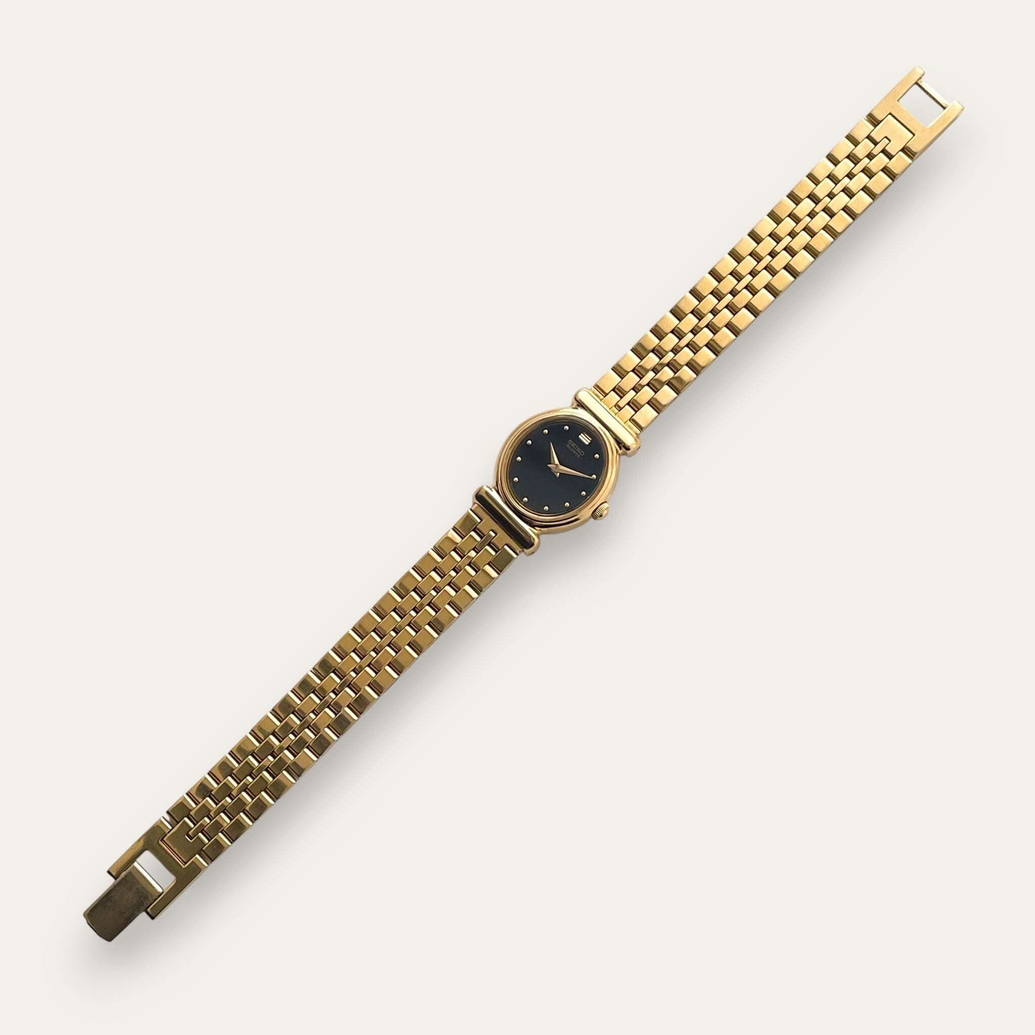 Dainty ladies' Seiko watch, with black oval dial and gold-tone bracelet. An elegant vintage piece from the cult Japanese watchmaker.