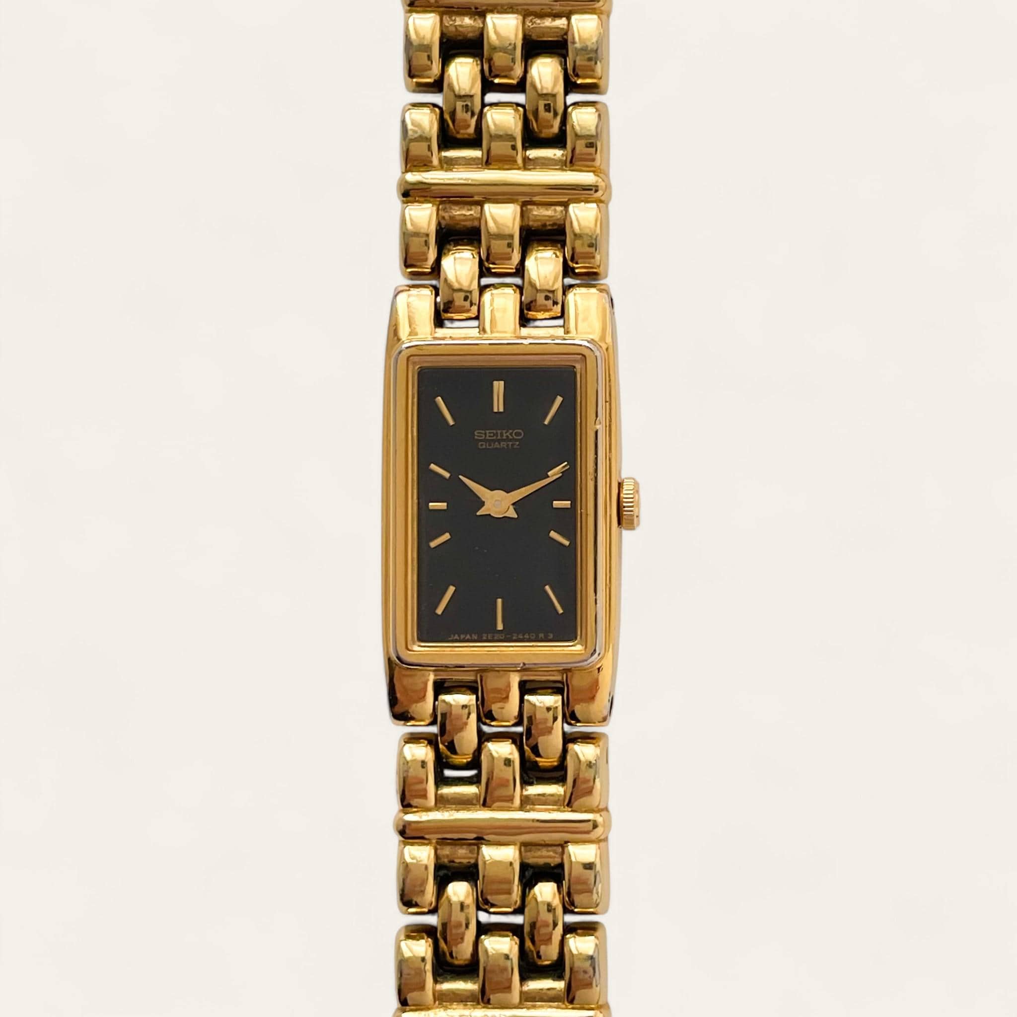 Dainty ladies' Seiko watch, with rectangular black dial and gold-tone bracelet. An elegant vintage piece from the cult Japanese watchmaker.