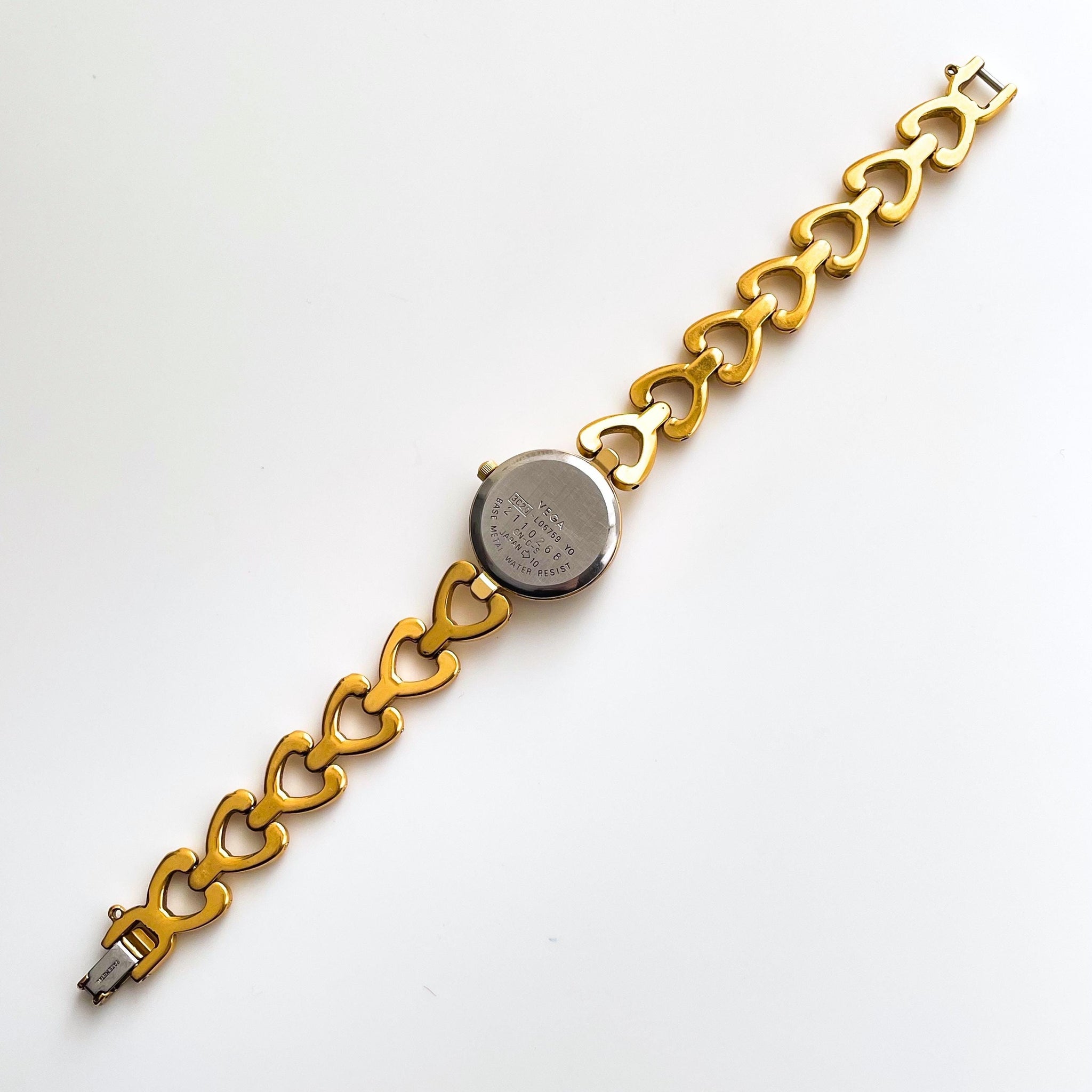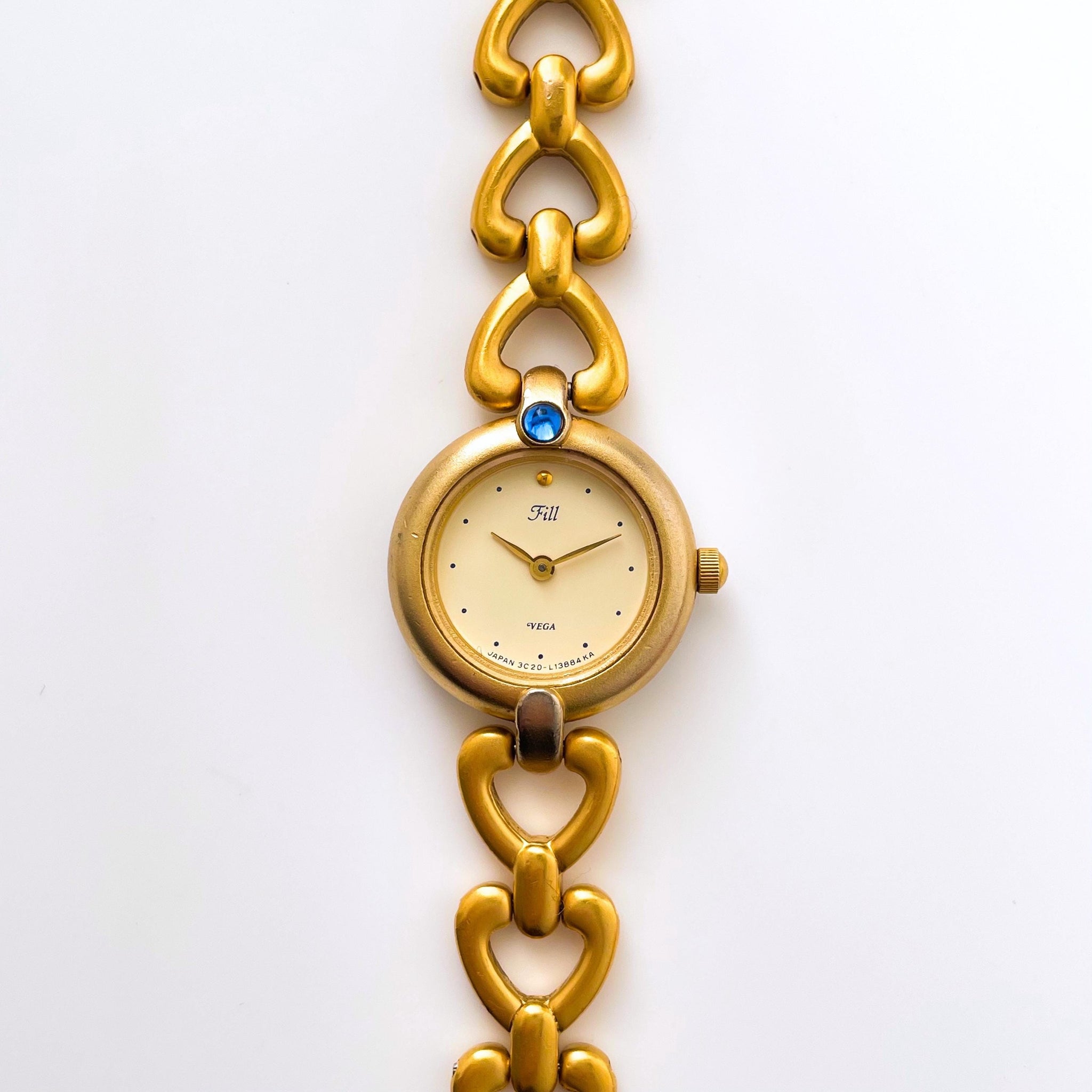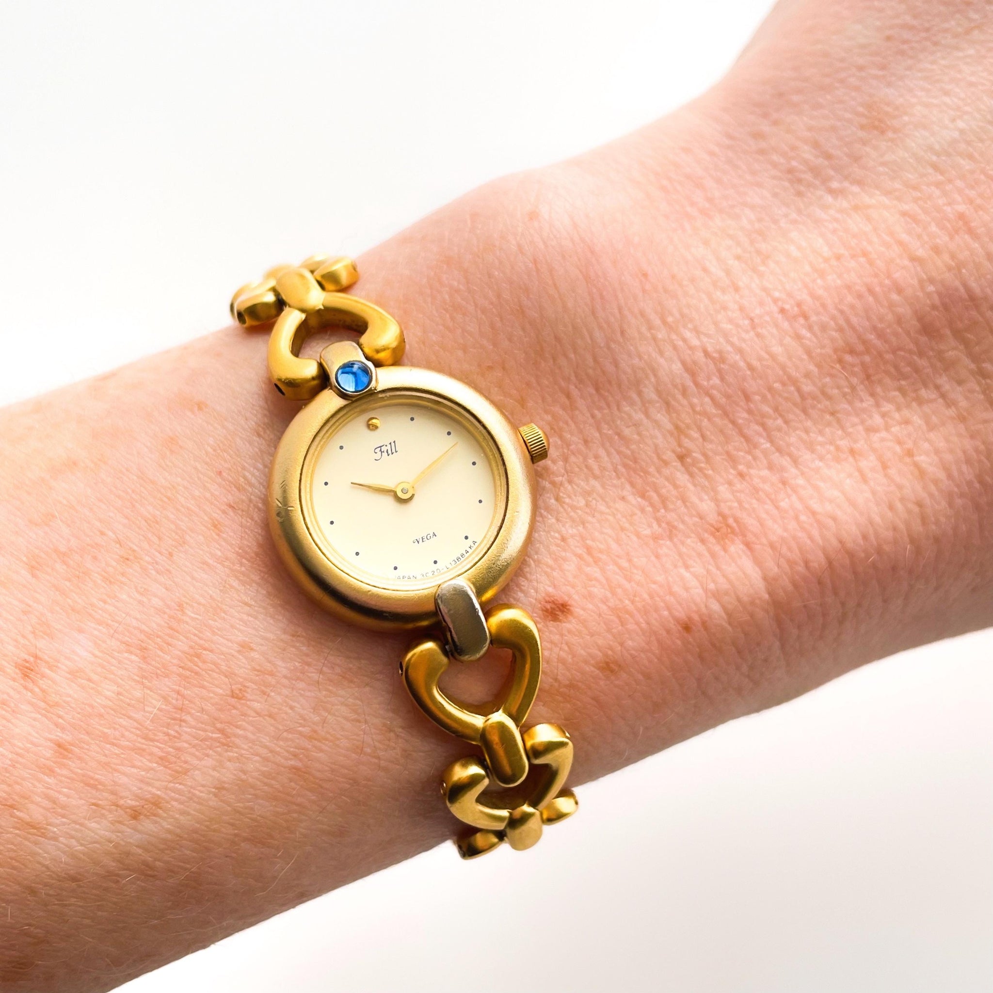 Dainty vintage ladies' Vega (by Citizen) Fill gold-plated watch, with round dial and blue stone above the dial.