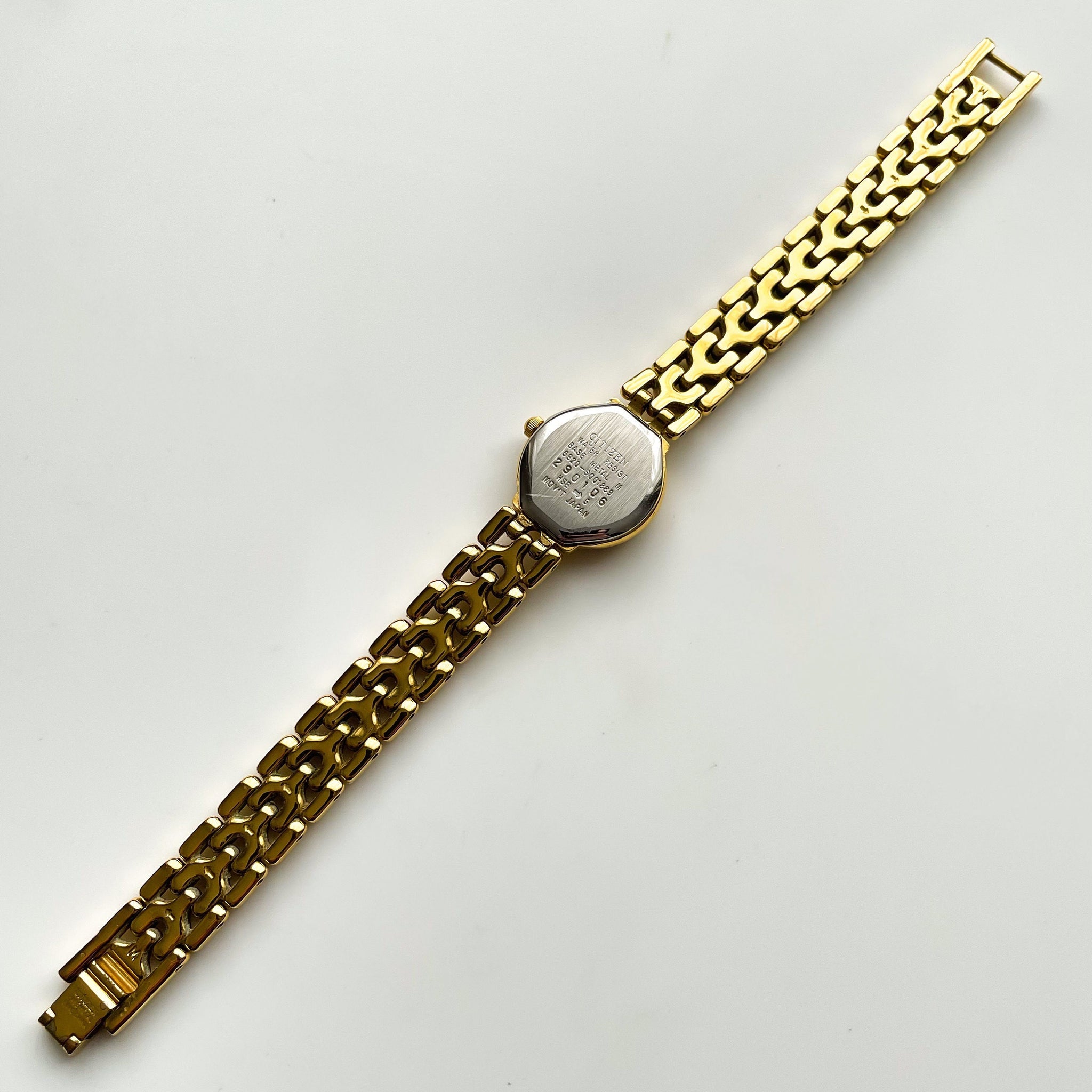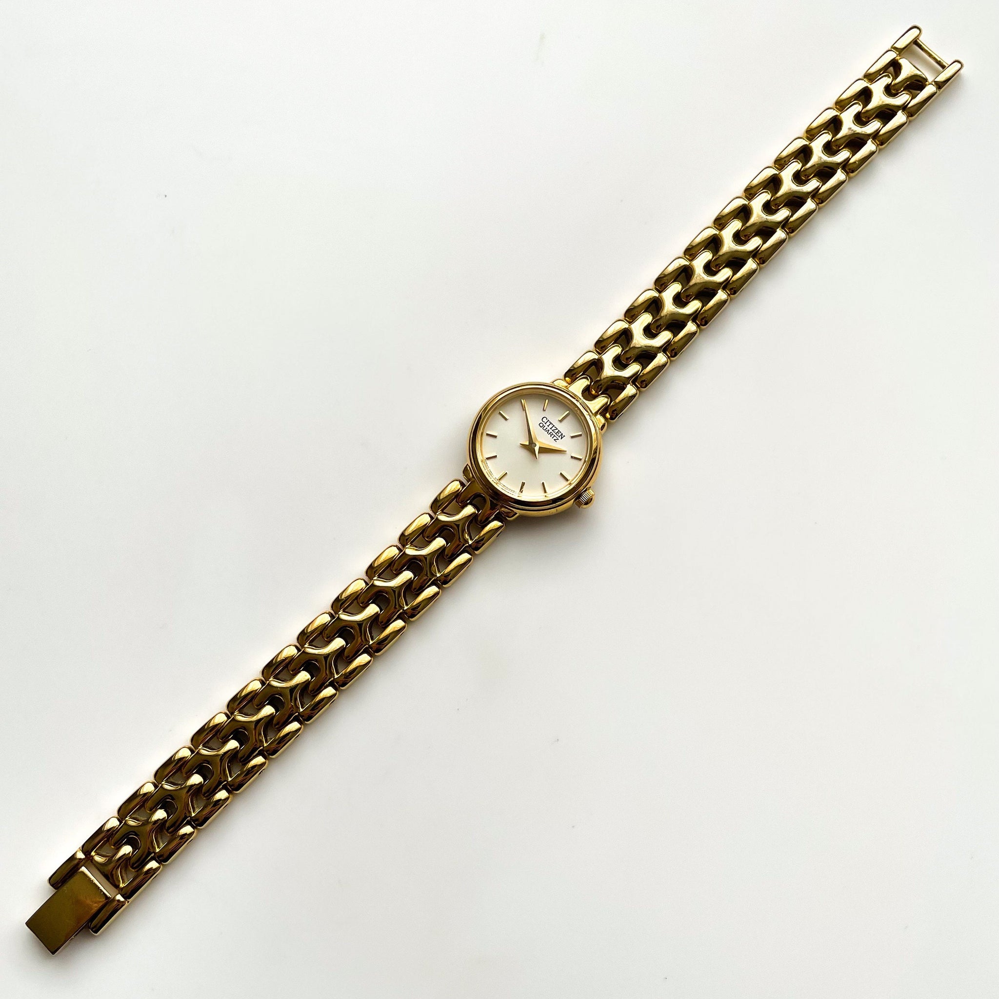 Vintage ladies' Citizen gold-plated watch with small round dial and thin intricate bracelet. A dainty and feminine watch from the Japanese watchmaker.