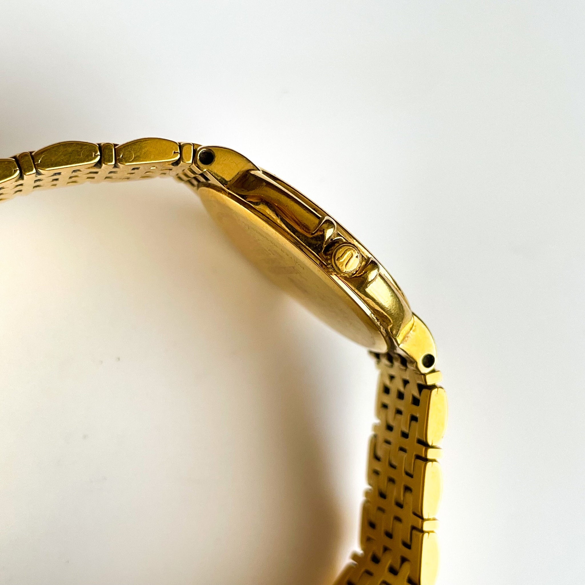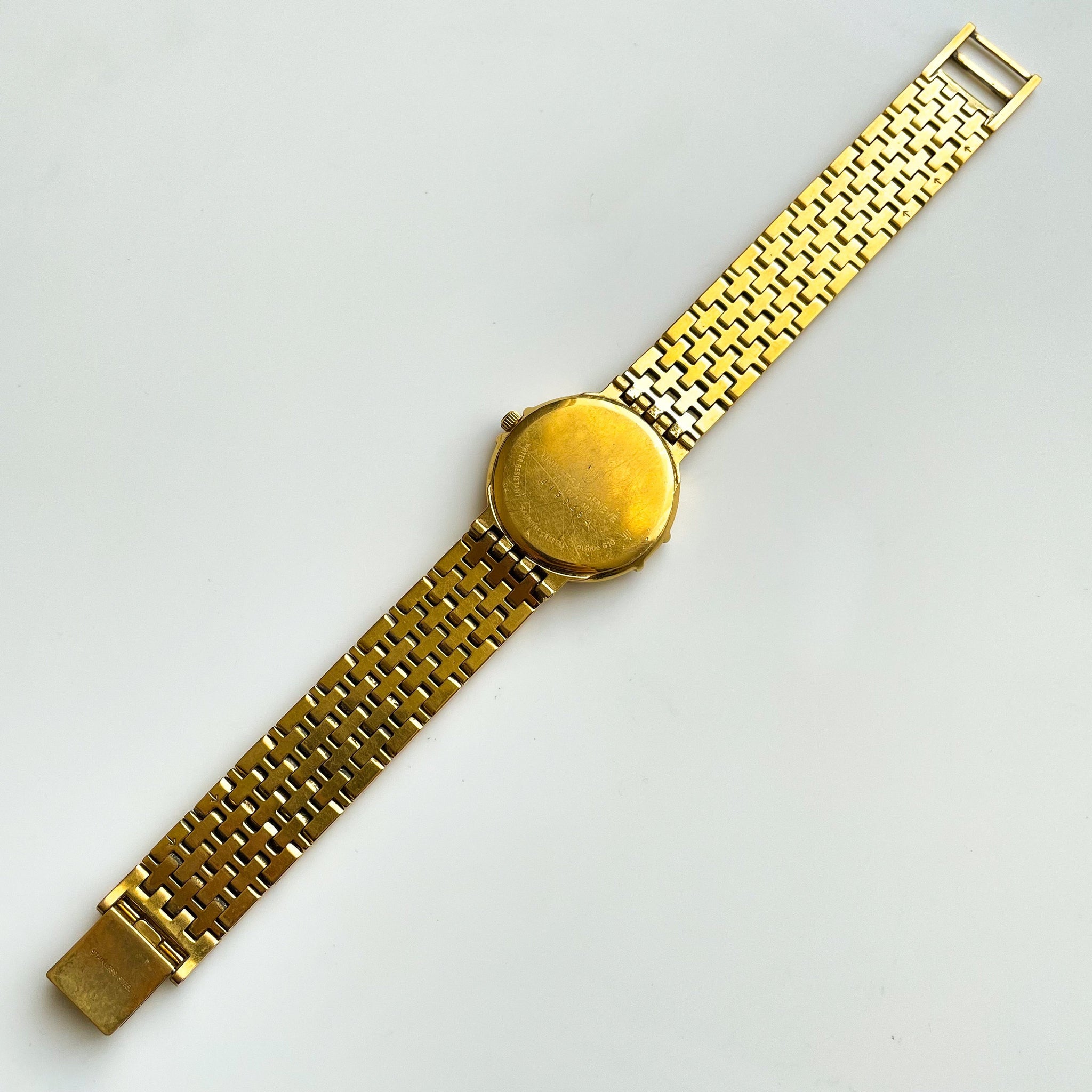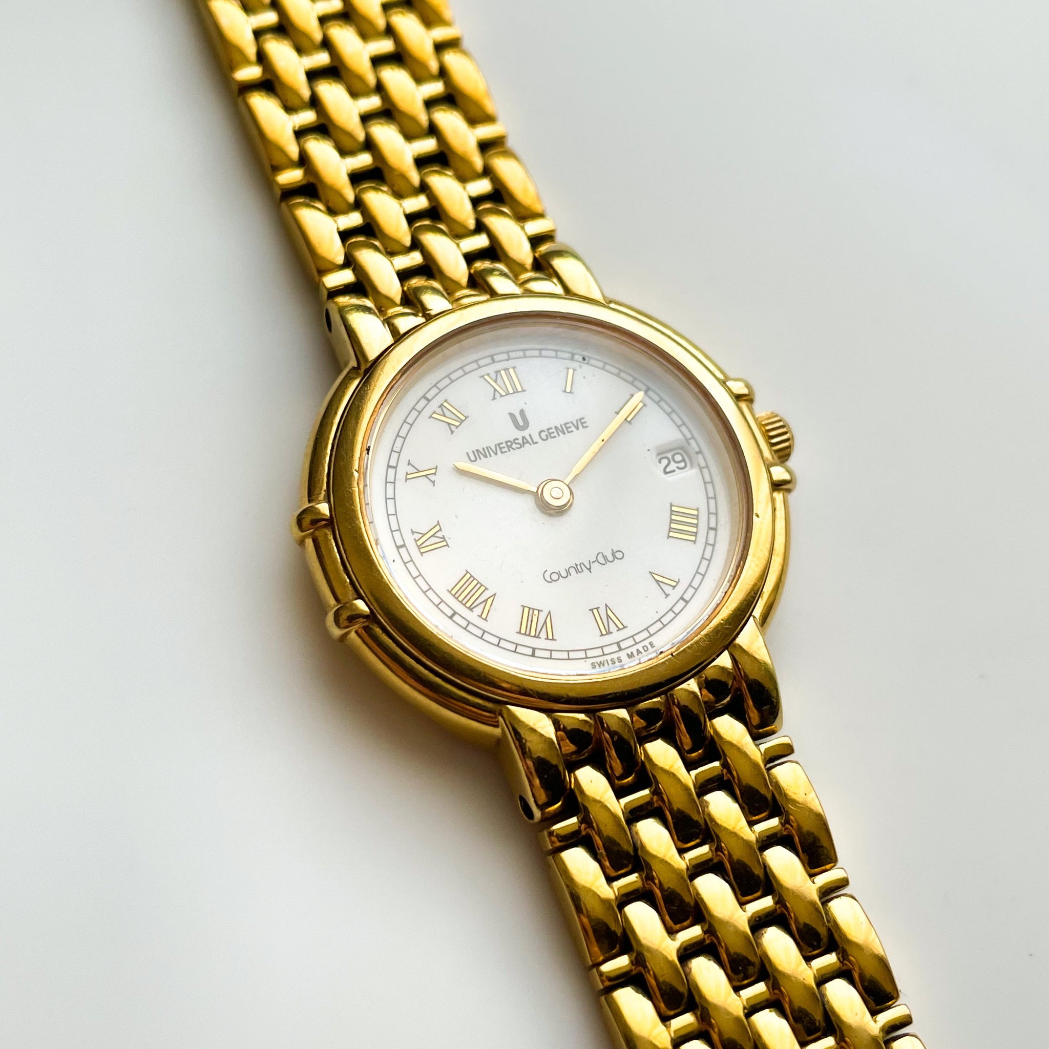 Elegant 90s gold-plated Universal Genève Country-Club watch with beads of rice bracelet and round white dial with gold-tone Roman numerals and date window. A beautiful classic watch by one of the most famous Swiss watchmakers.