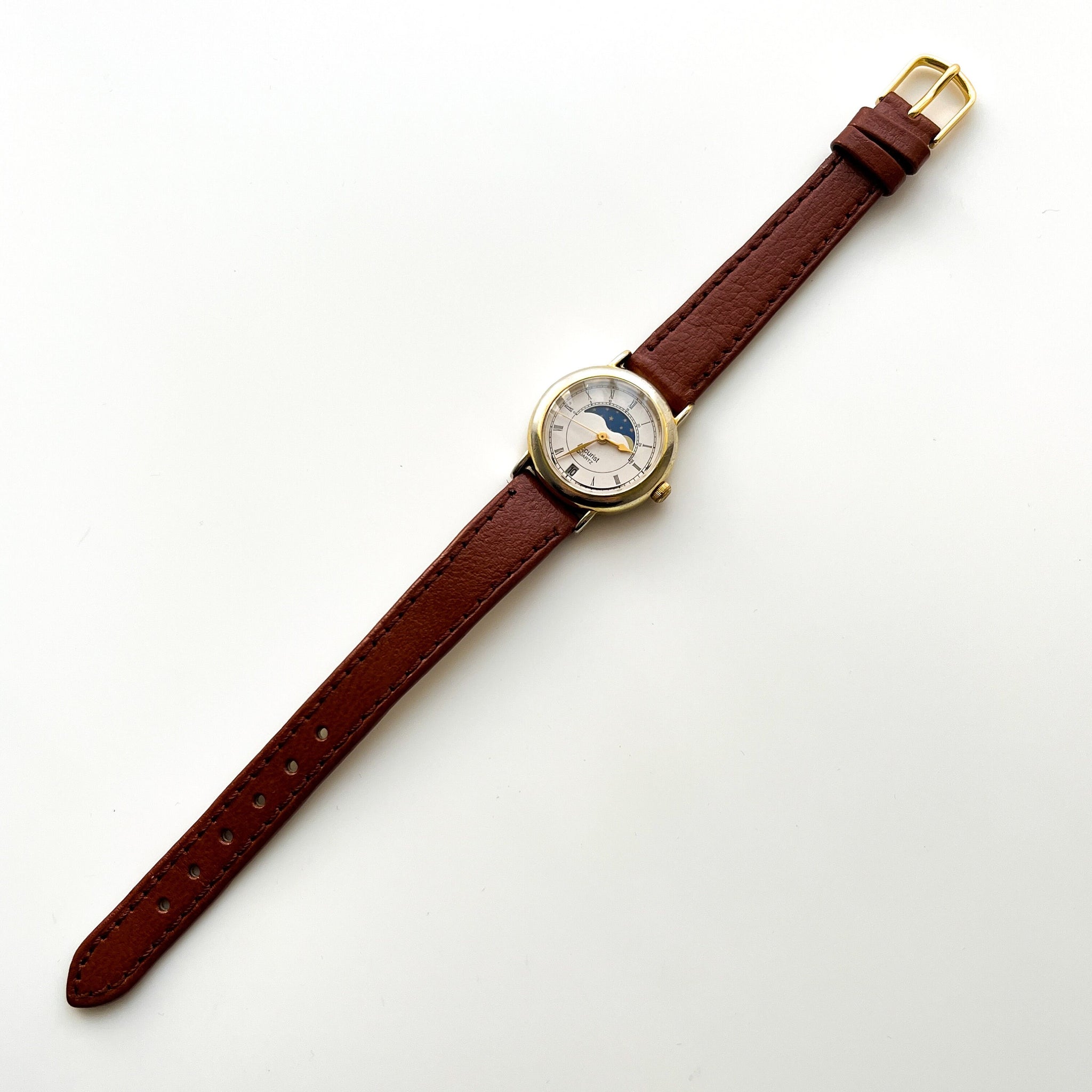 Vintage Accurist moon phase watch with brown leather strap and date window
