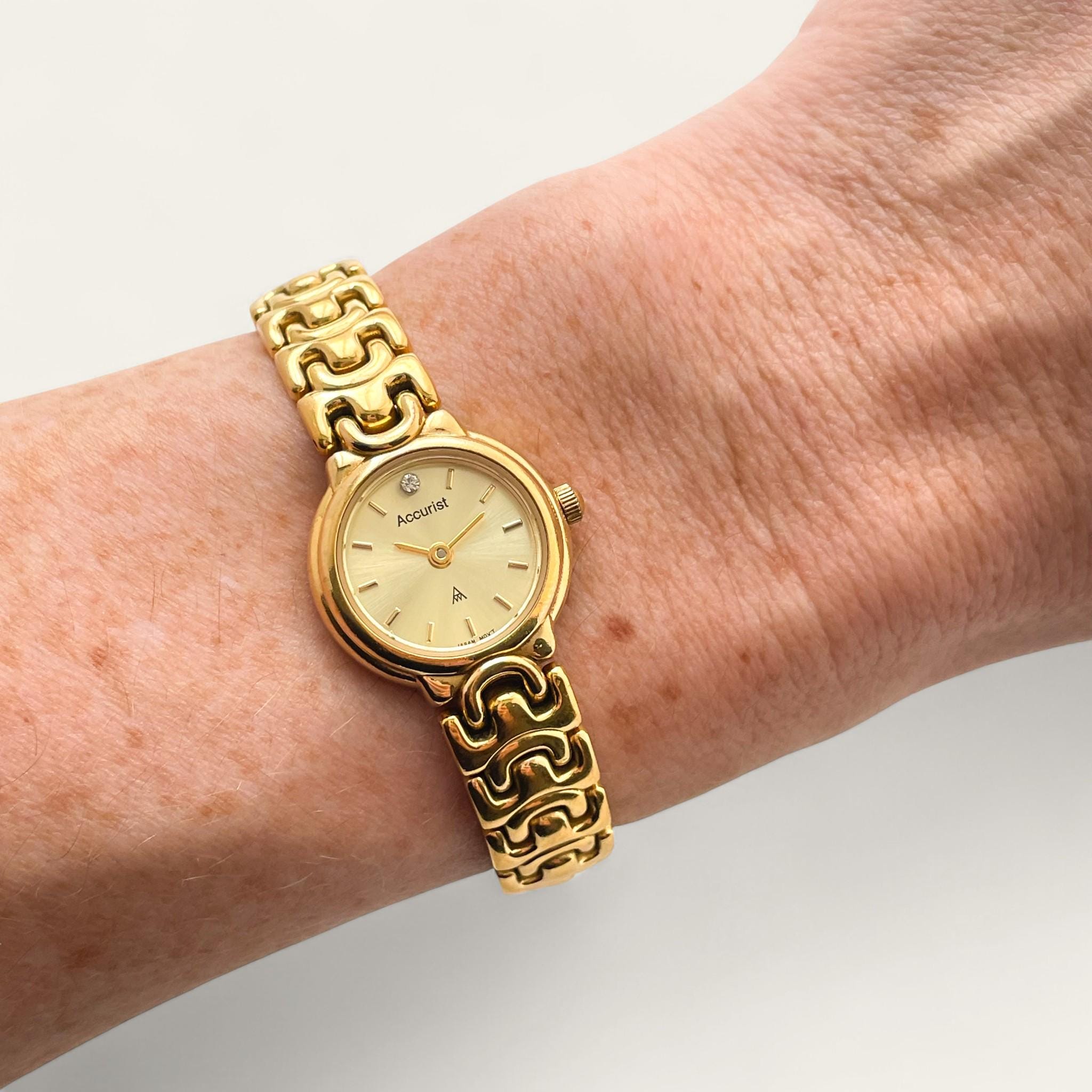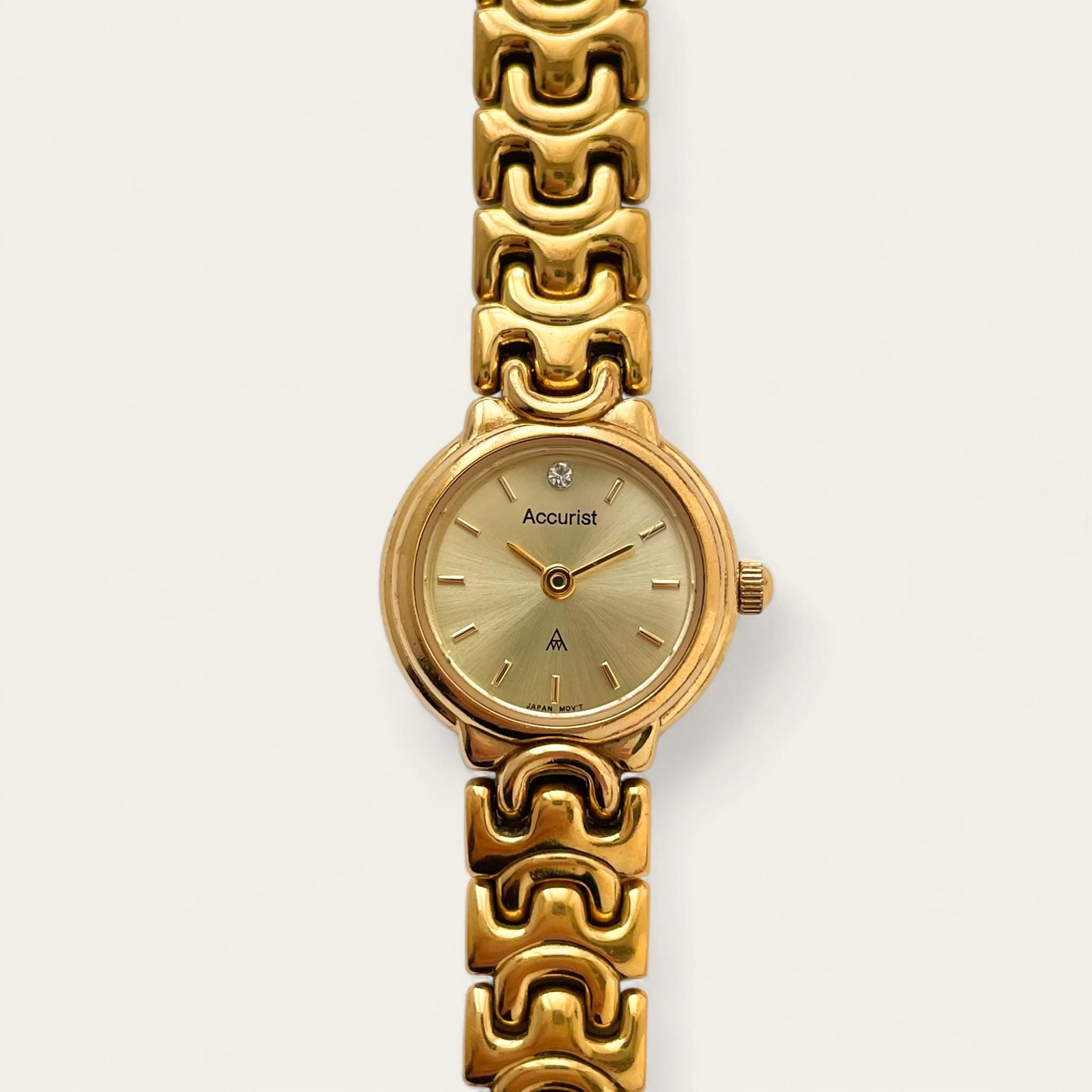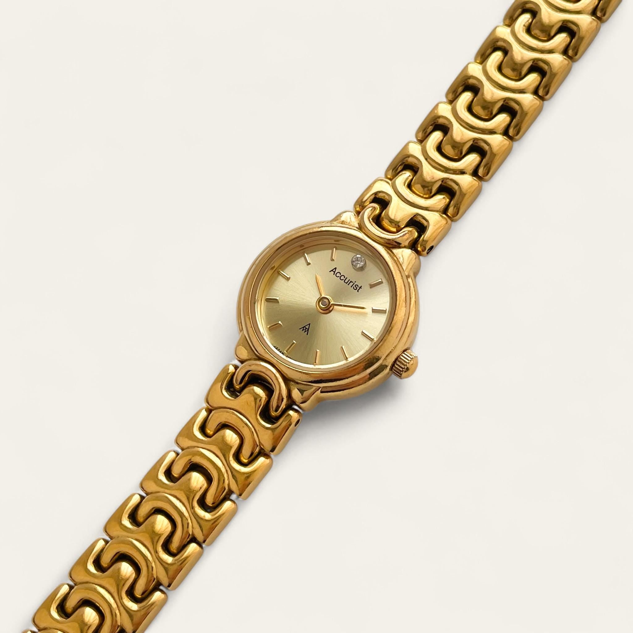Dainty gold-plated Accurist watch, with intricate bracelet and round dial.