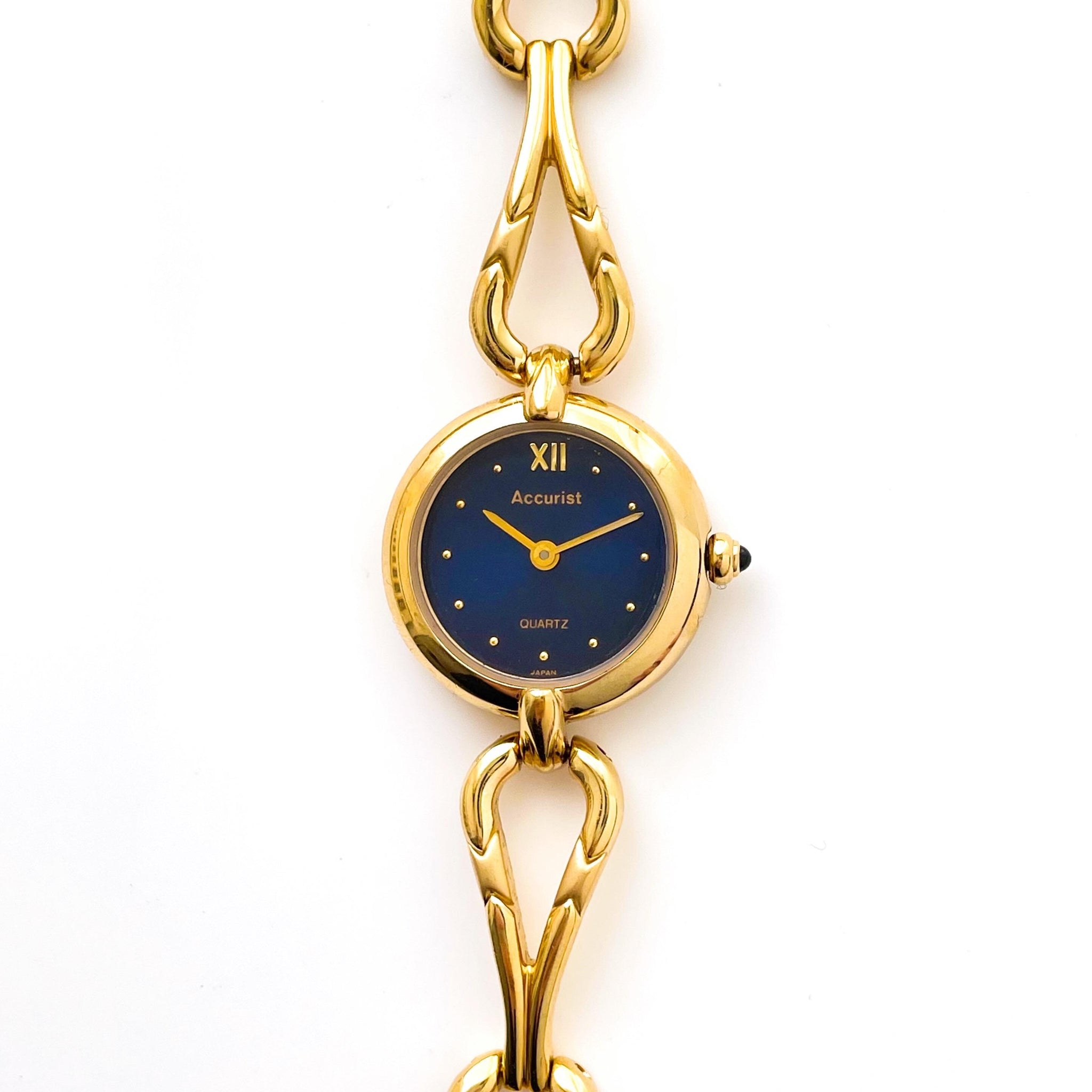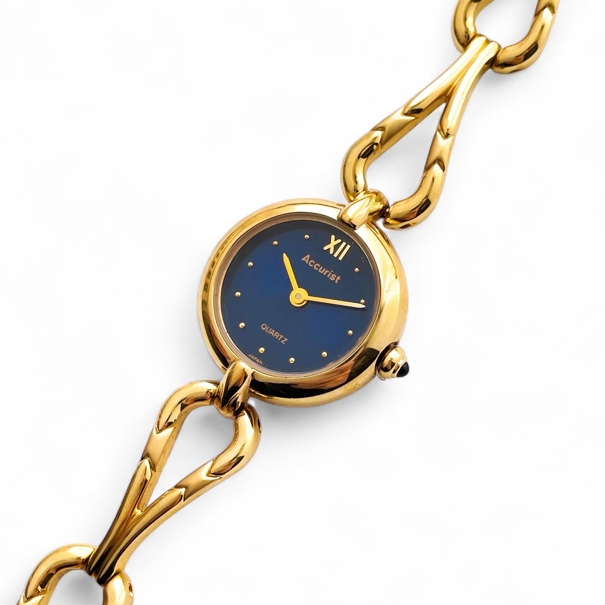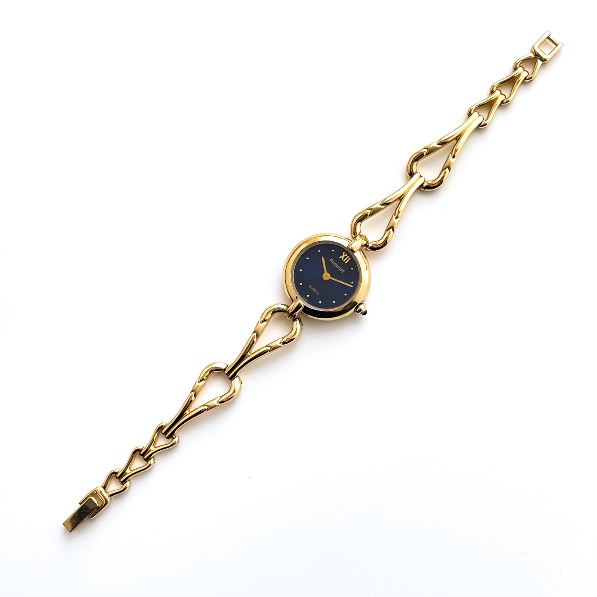 Dainty gold-plated Accurist watch, with intricate bracelet and dark blue metallic dial.