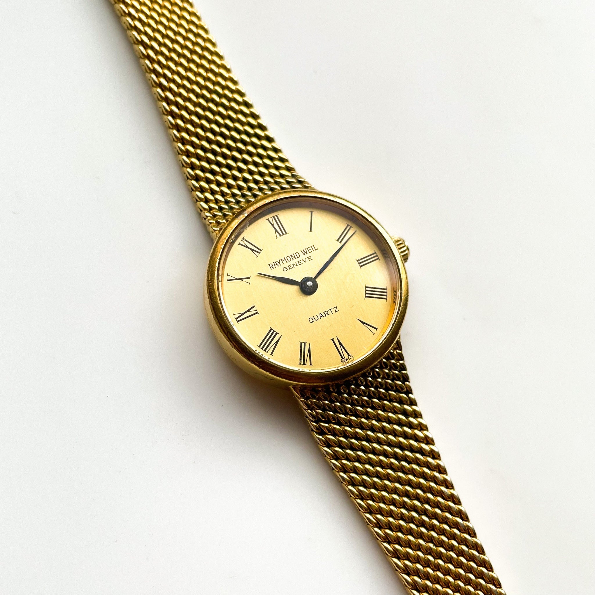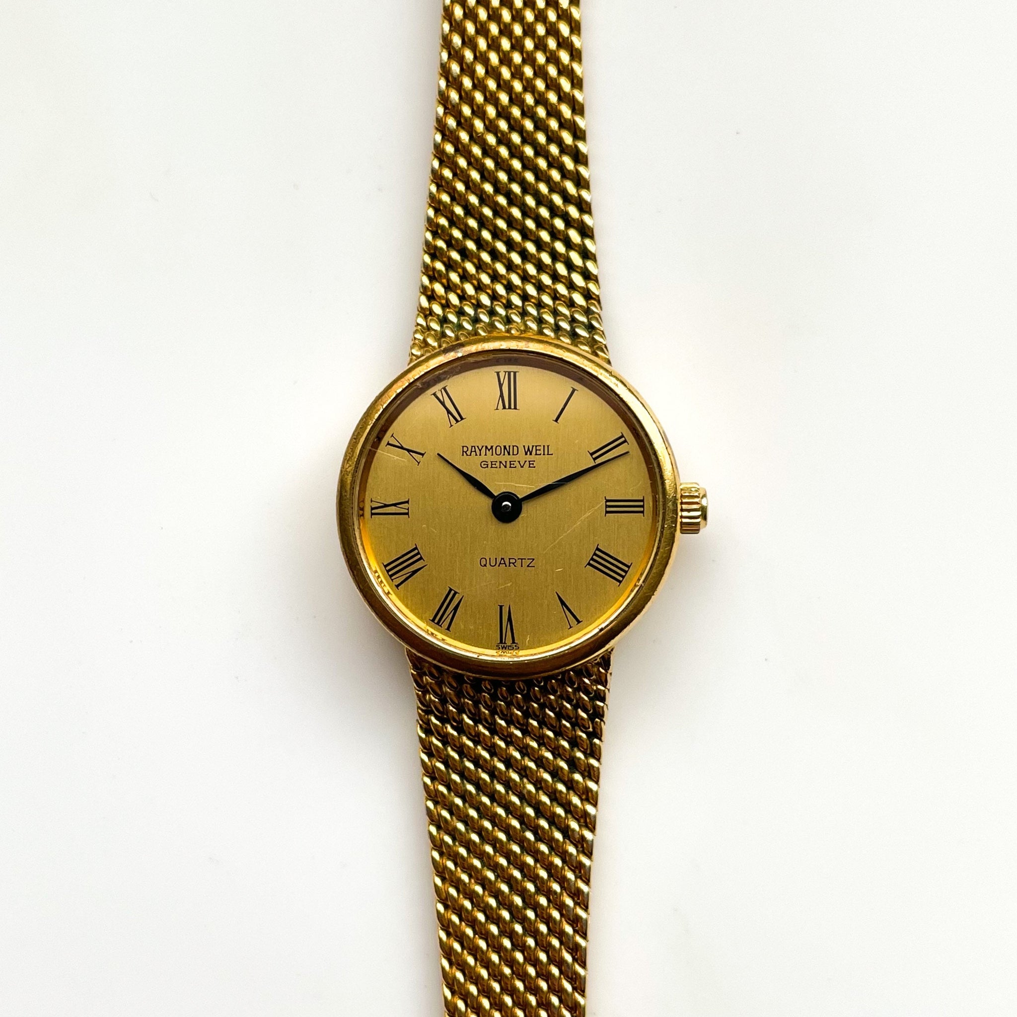 Elegant 18ct gold-plated Raymond Weil watch with mesh bracelet and round dial with Roman numerals. A beautiful and feminine classic watch by the famous Swiss watchmaker.