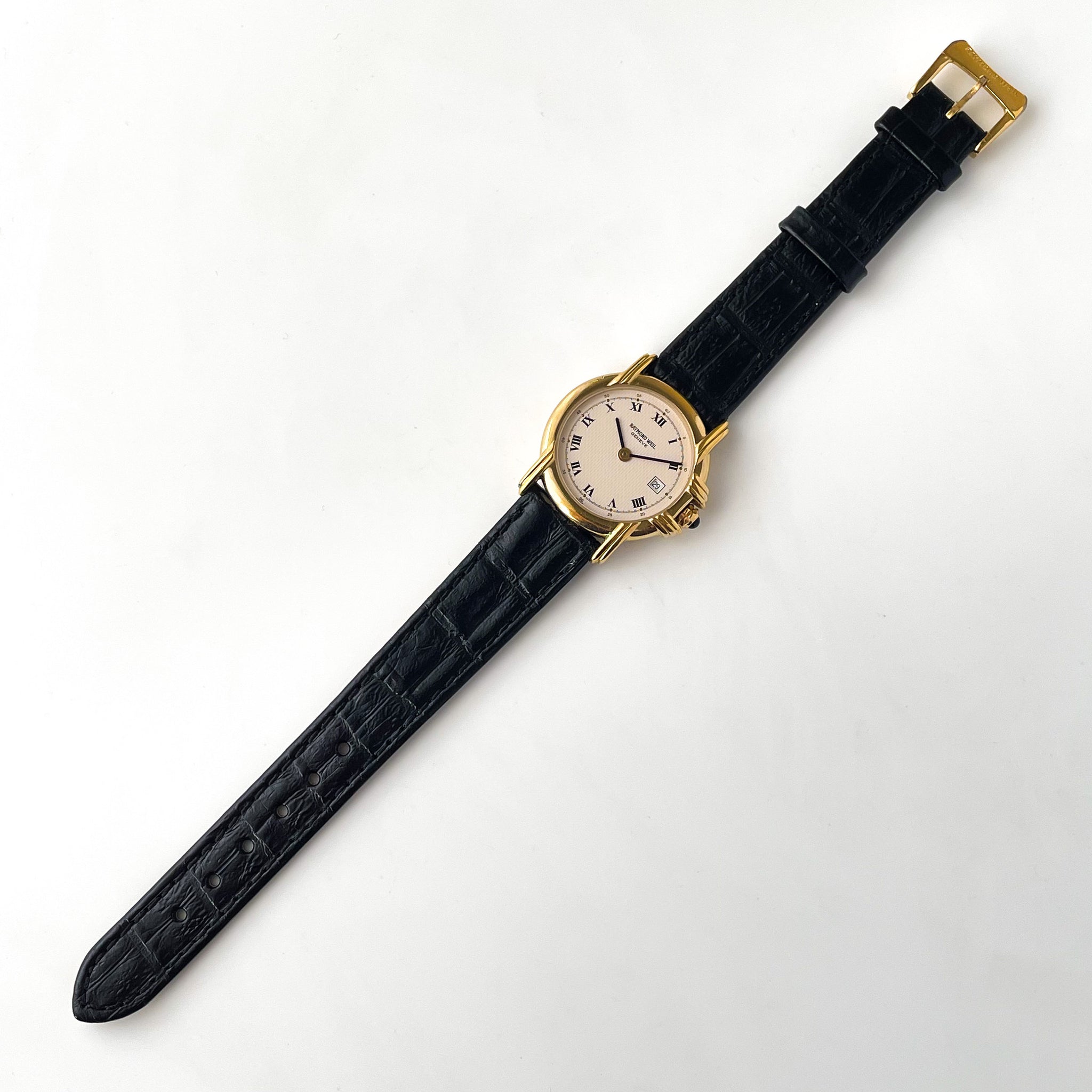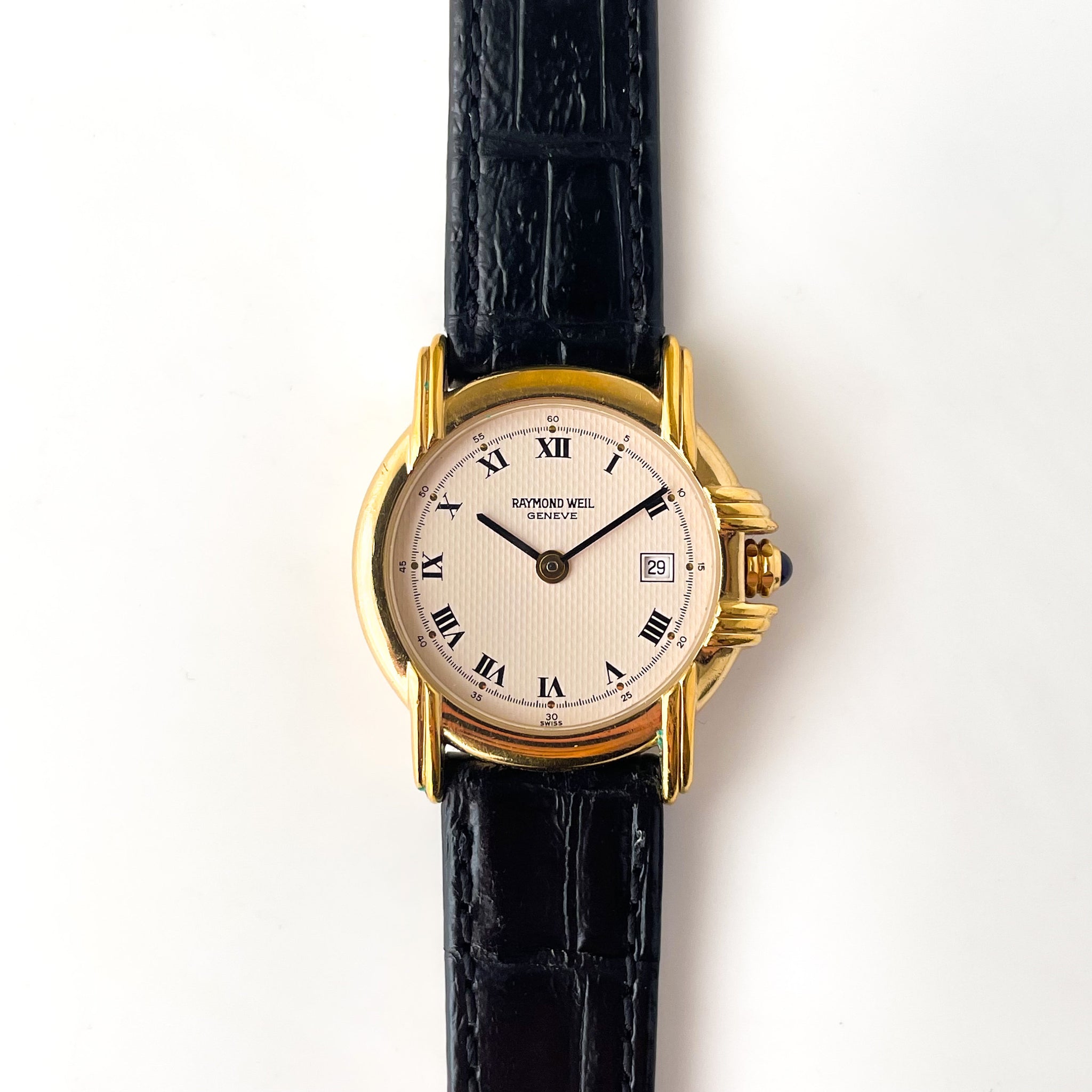 Vintage Raymond Weil watch with 18k gold electroplated case and Roman numerals and date window. It has a black leather strap. A beautiful watch by the famous Swiss watchmaker.