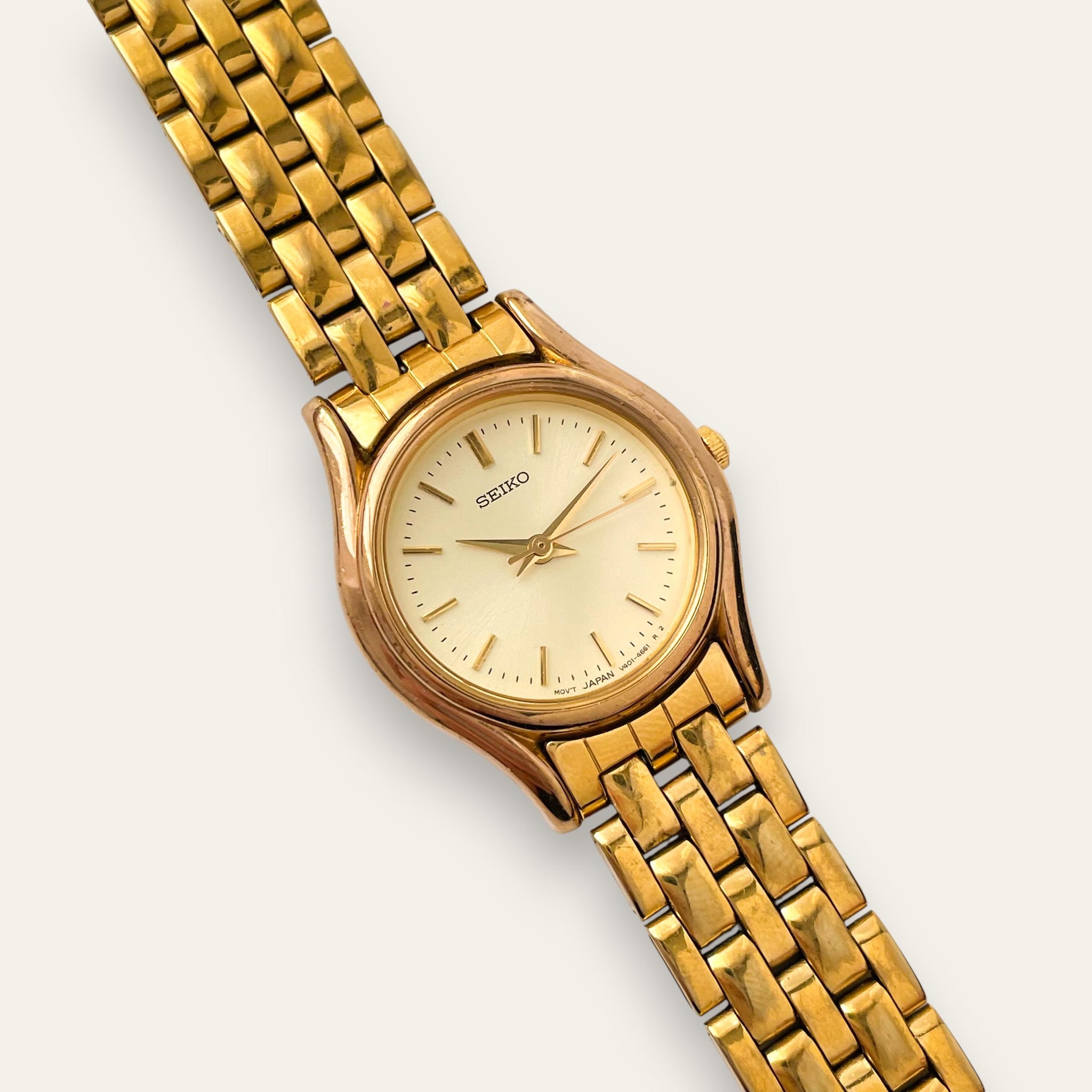 Vintage ladies' Seiko gold-plated watch with round dial and metal bracelet.