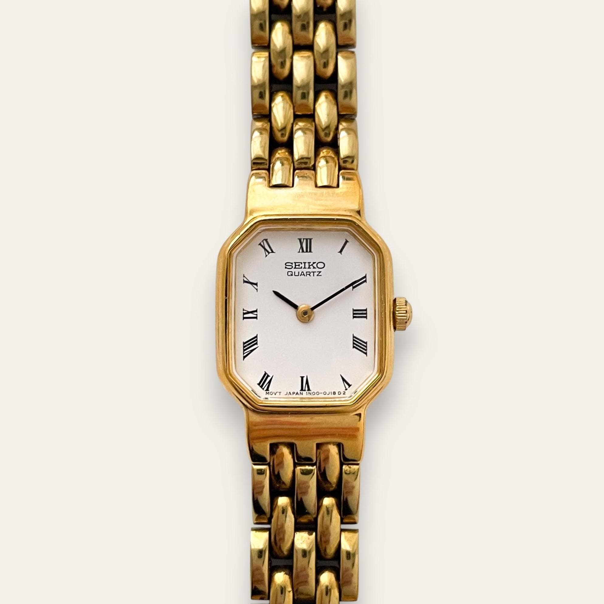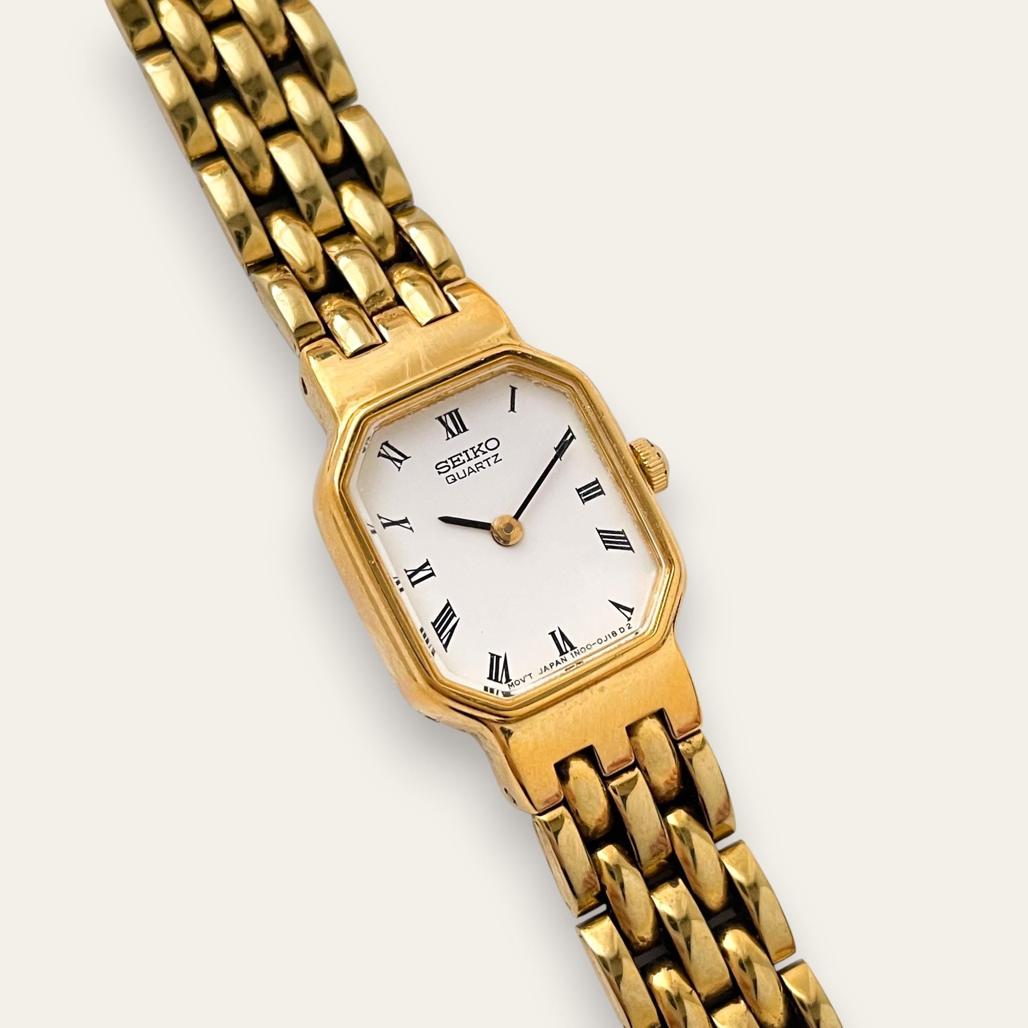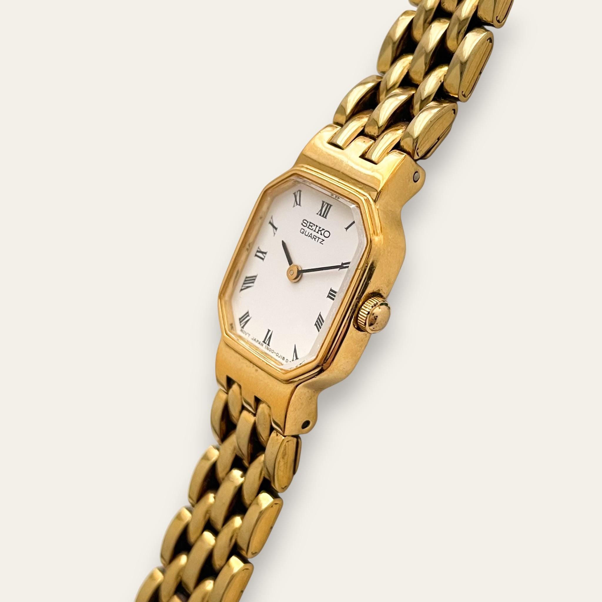Vintage ladies' Seiko watch, with white dial, Roman numerals and gold-tone bracelet. An elegant vintage piece from the cult Japanese watchmaker.
