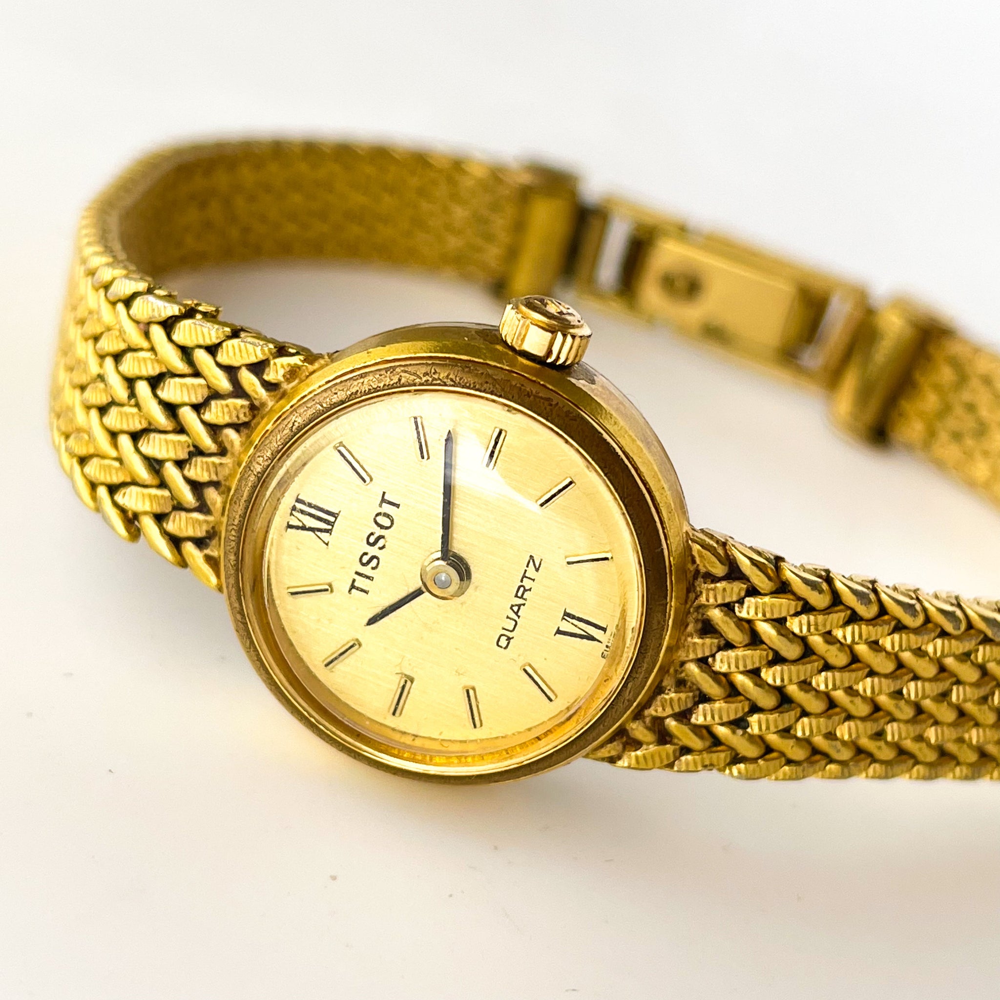 Dainty Tissot ladies' watch with braided gold-plated bracelet and jewellery clasp. Tissot logo on the clasp. A beautiful watch for every day wear and special occasions alike by the renowned Swiss watchmaker.
