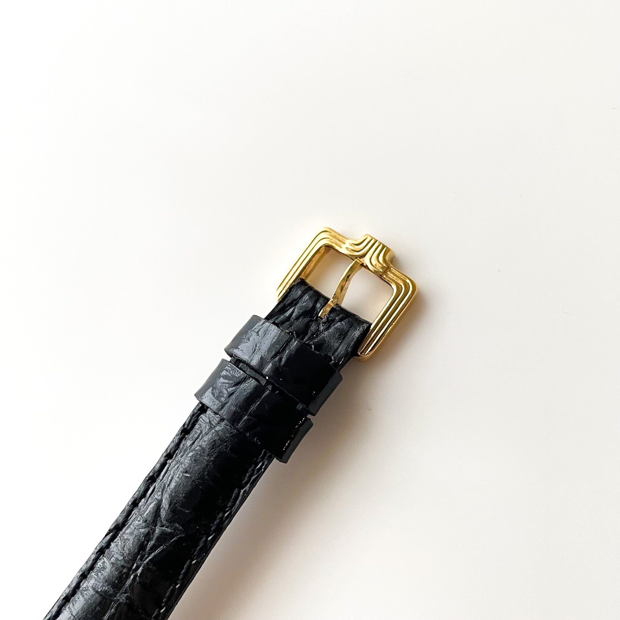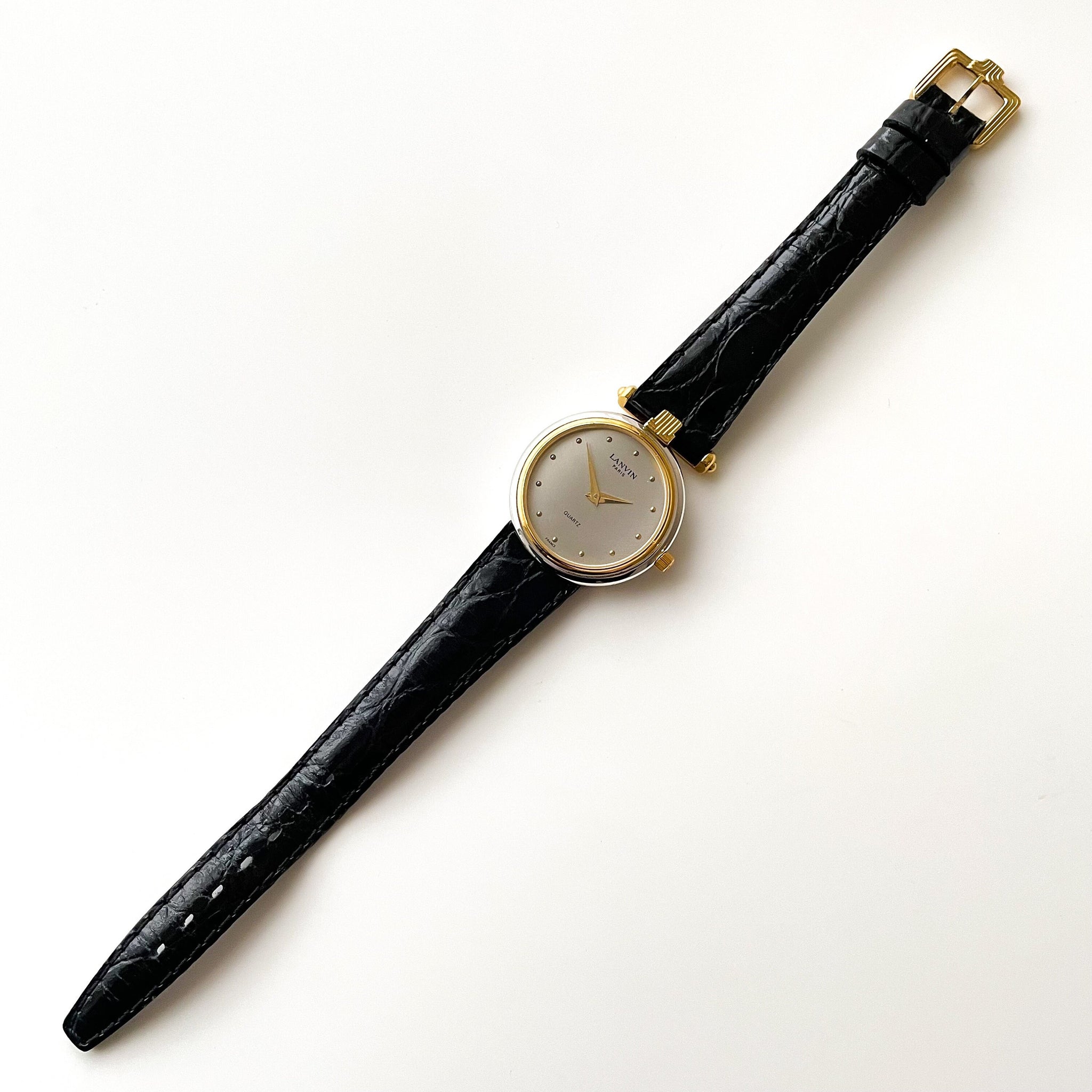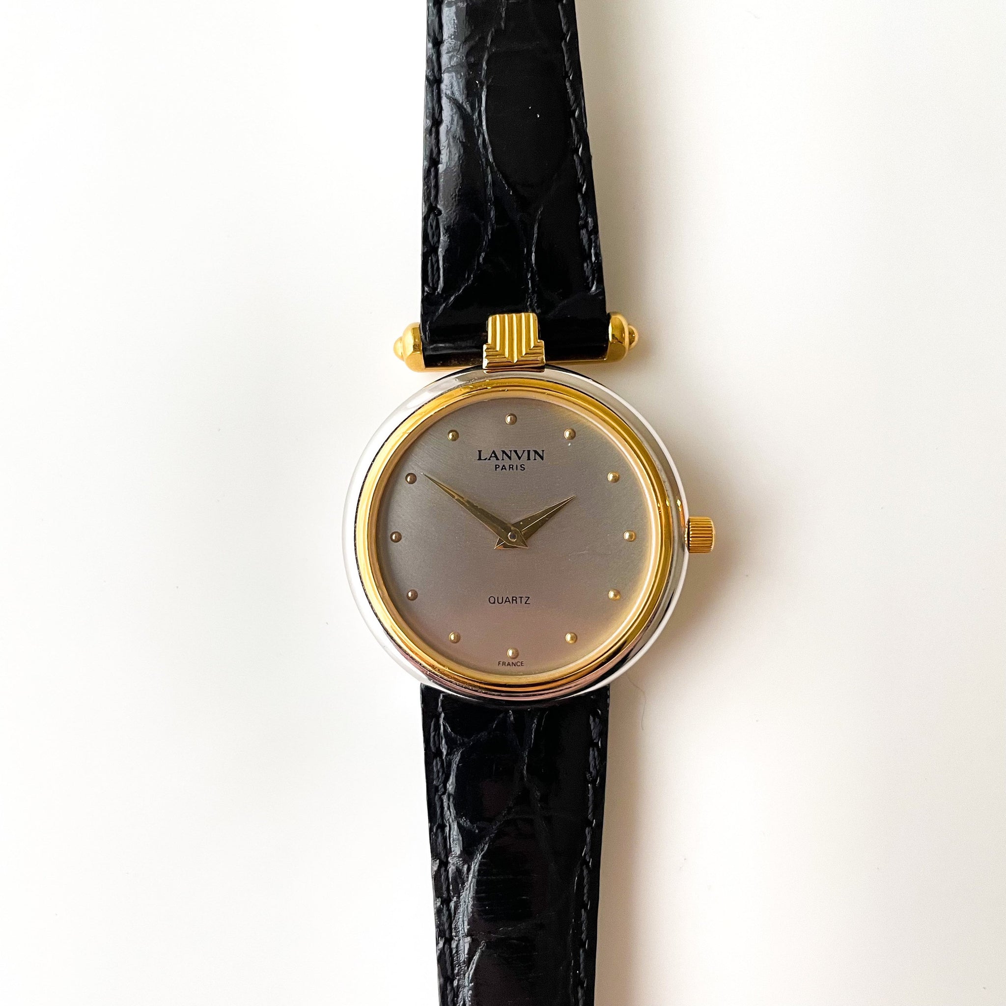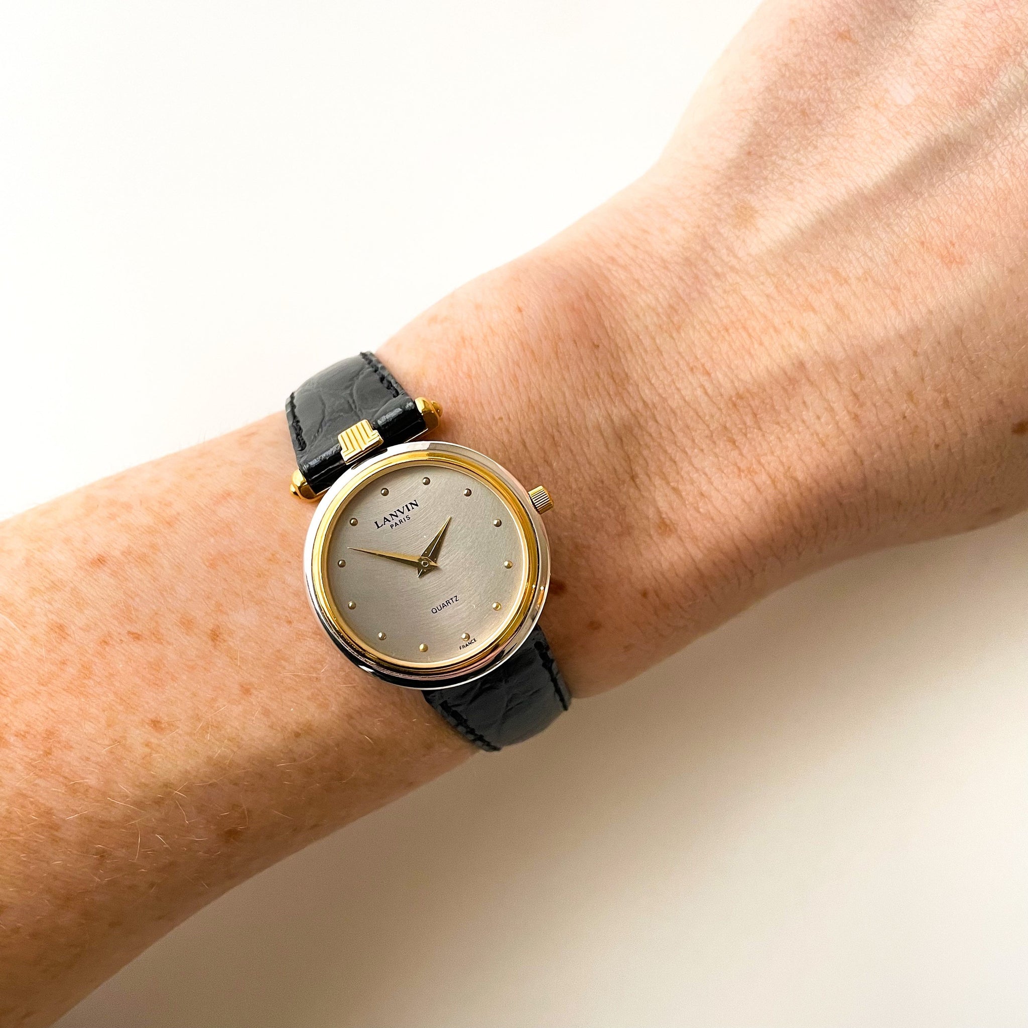 Gorgeous ladies' gold and silver-tone Lanvin watch, with round dial and black leather strap. Logo engraved on the crown. Very unusual and elegant asymmetrical strap design. Overall a very feminine, dainty and stylish piece from one of the most renown French designers.