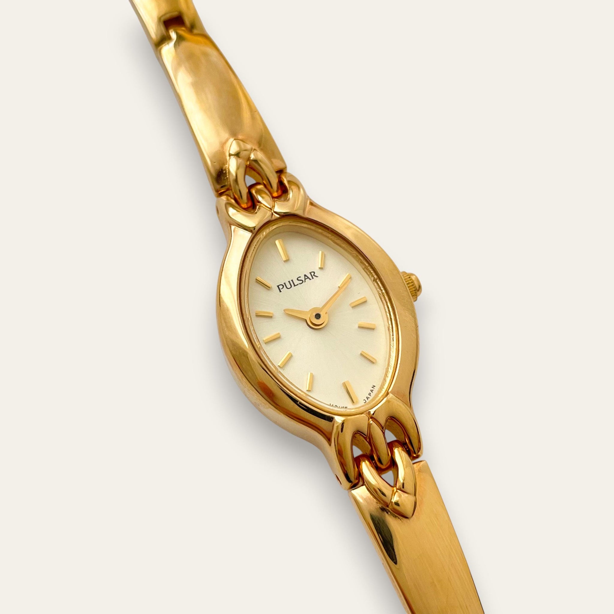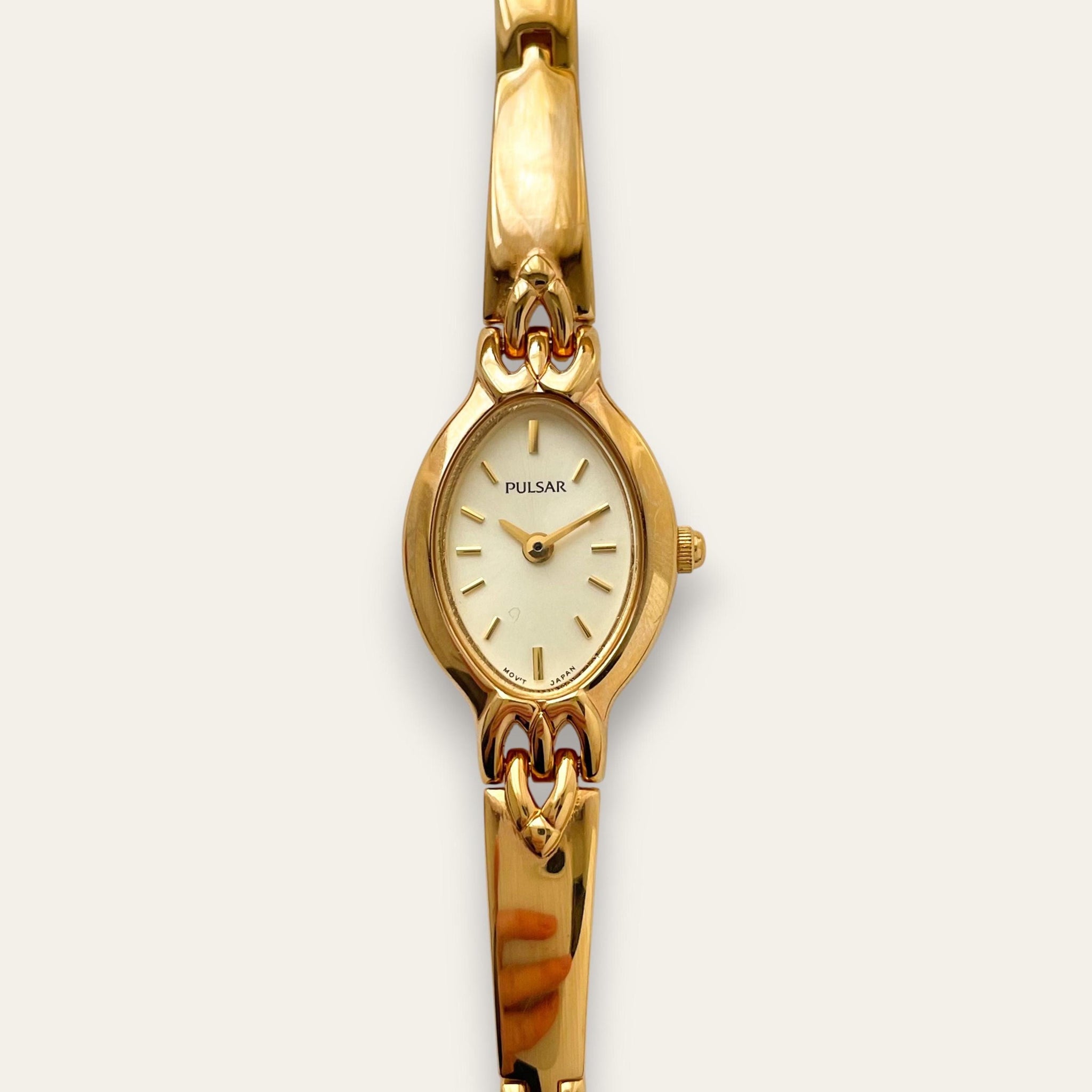 Thin ladies' Pulsar (by Seiko) gold-plated watch with metal bracelet and oval dial. An elegant and feminine piece.