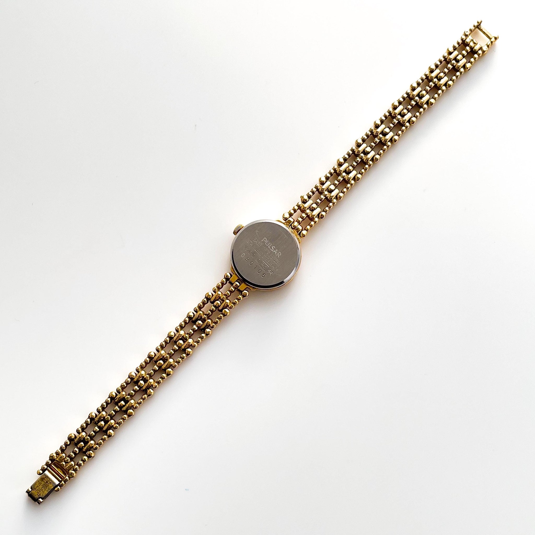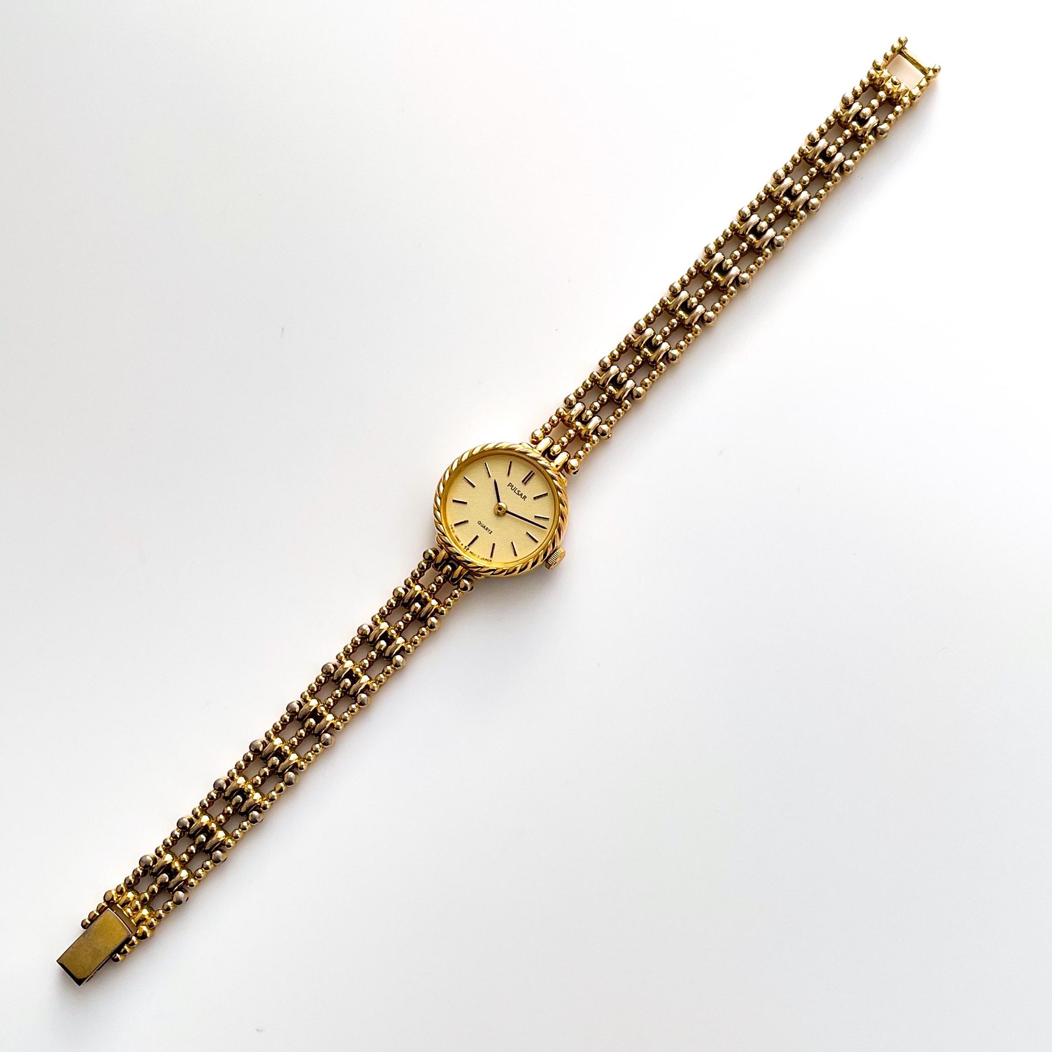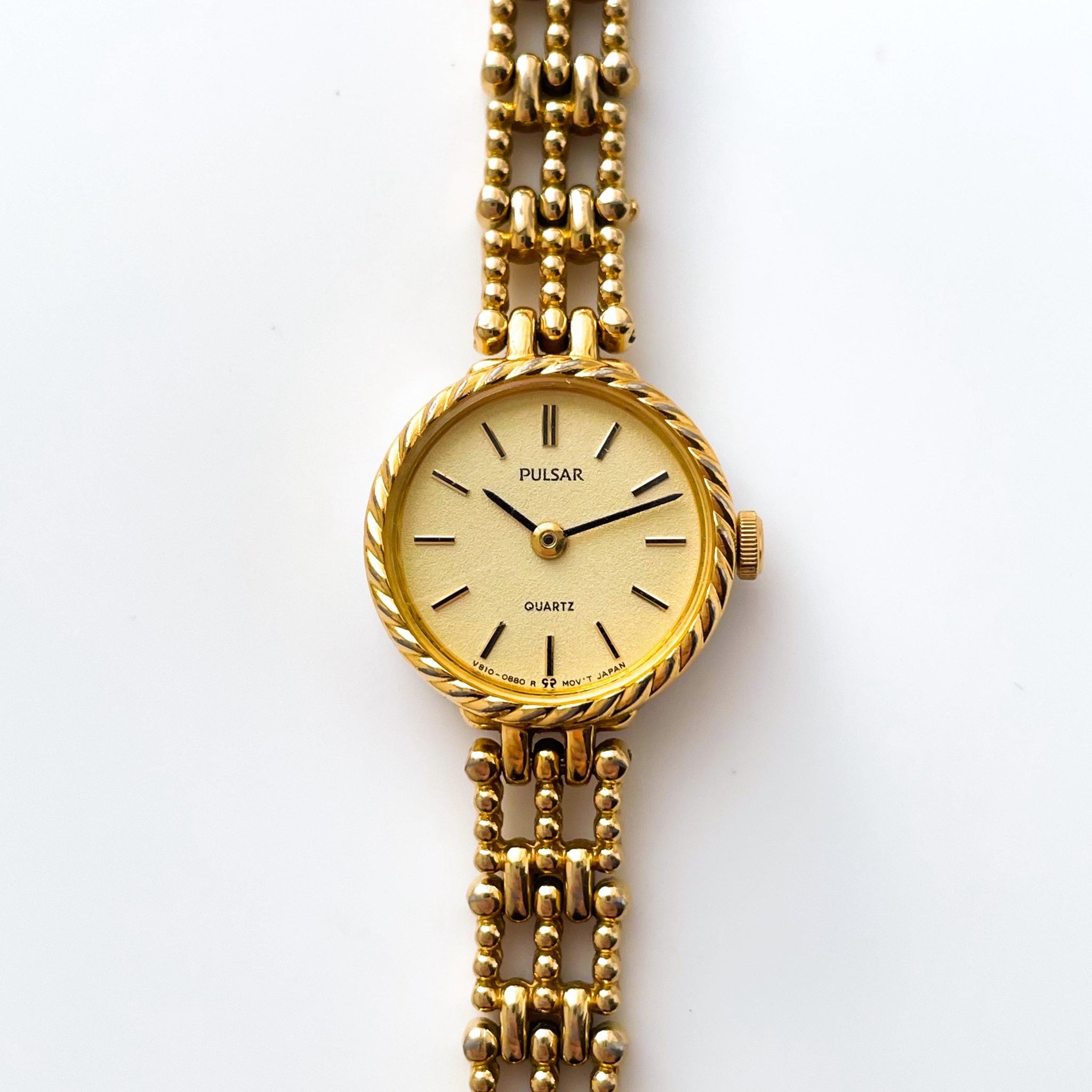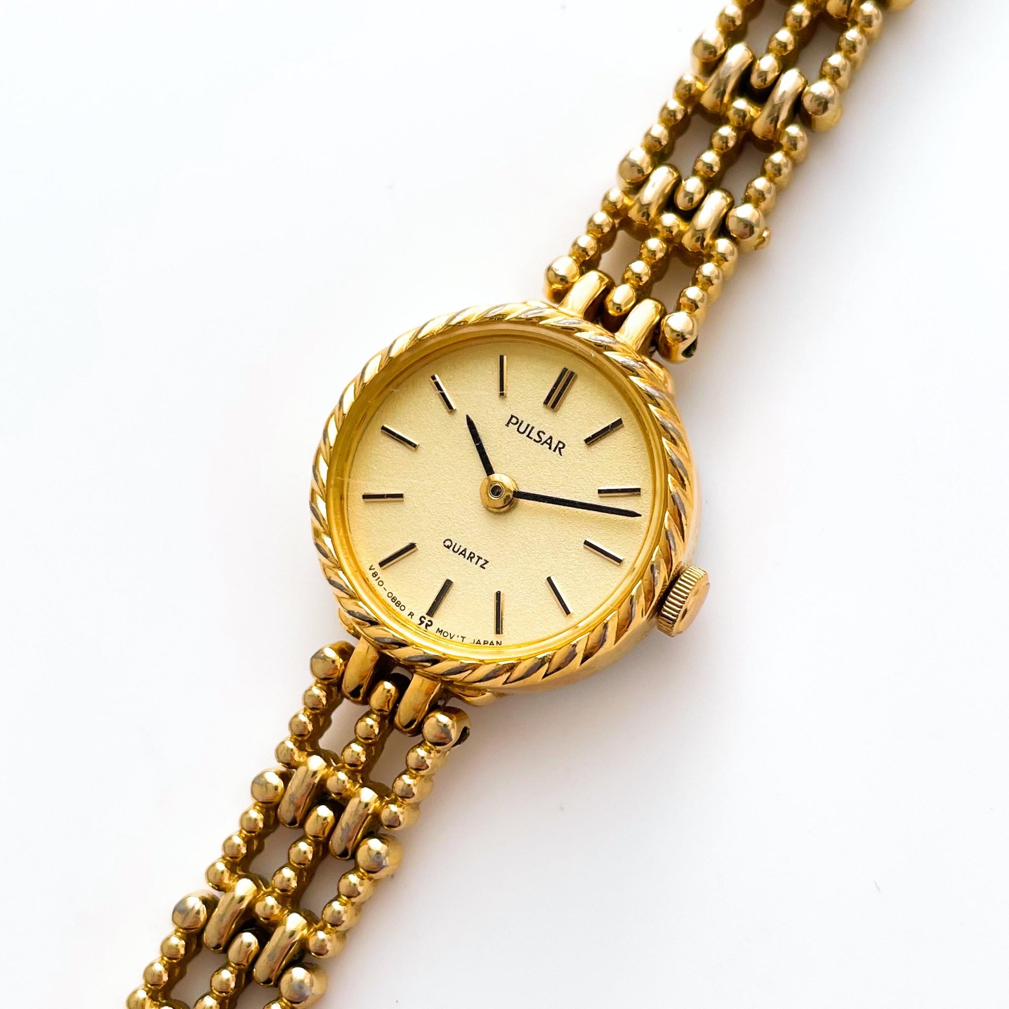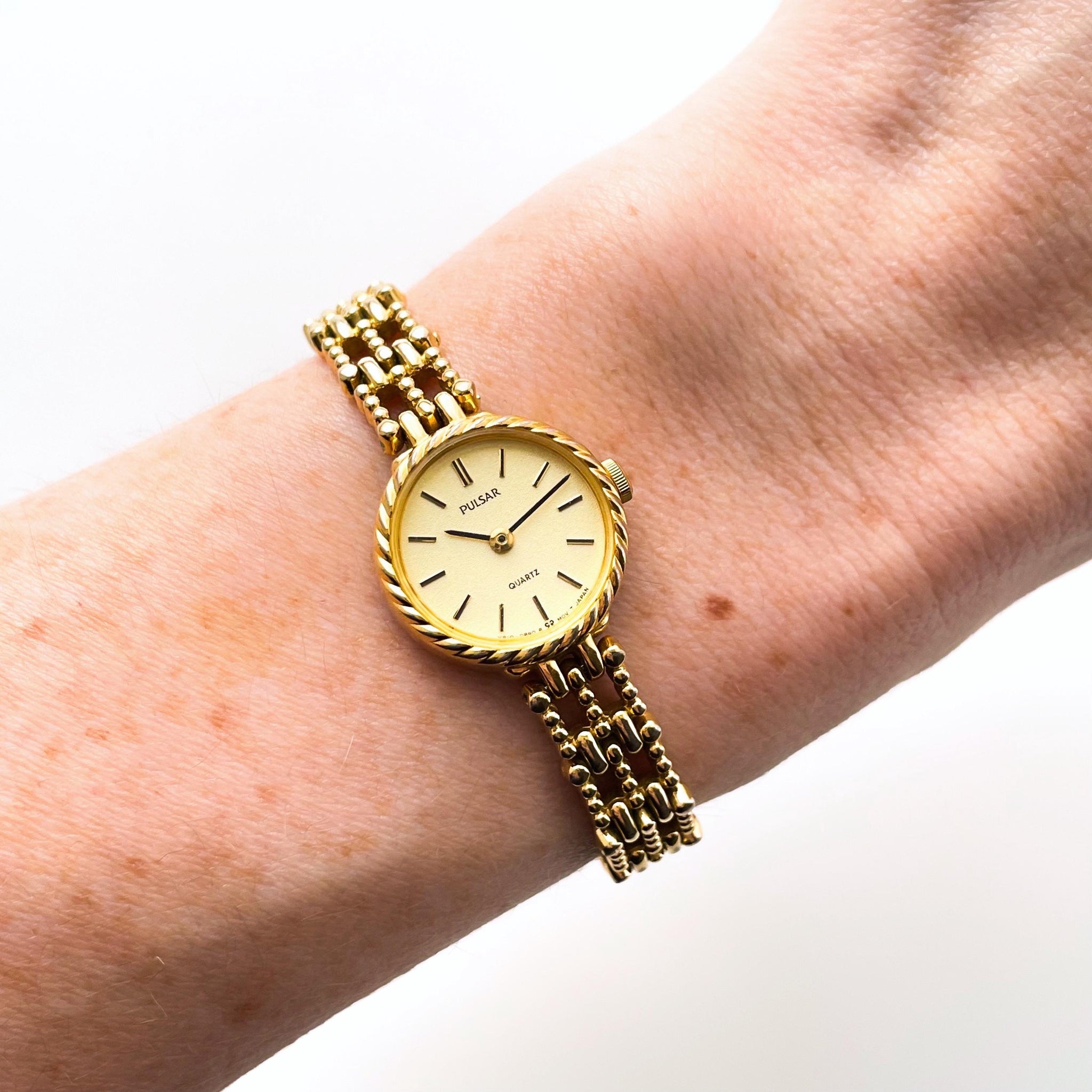 Thin ladies' Pulsar (by Seiko) gold-plated watch with intricate bracelet and round dial. A very elegant and feminine piece.
