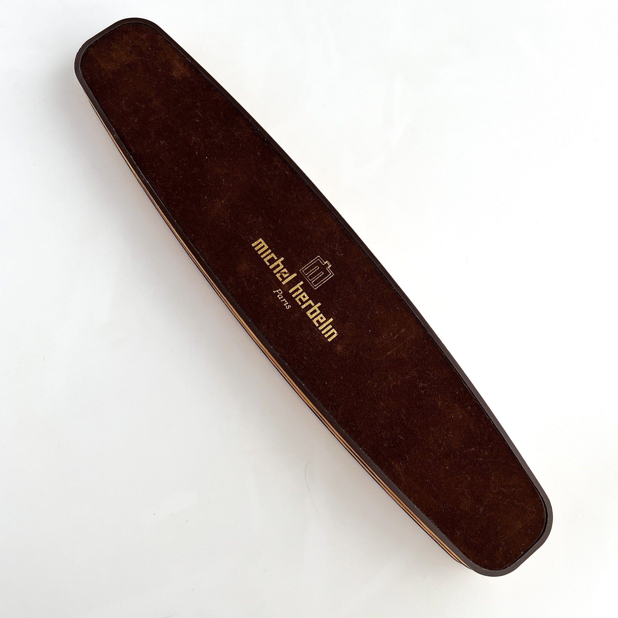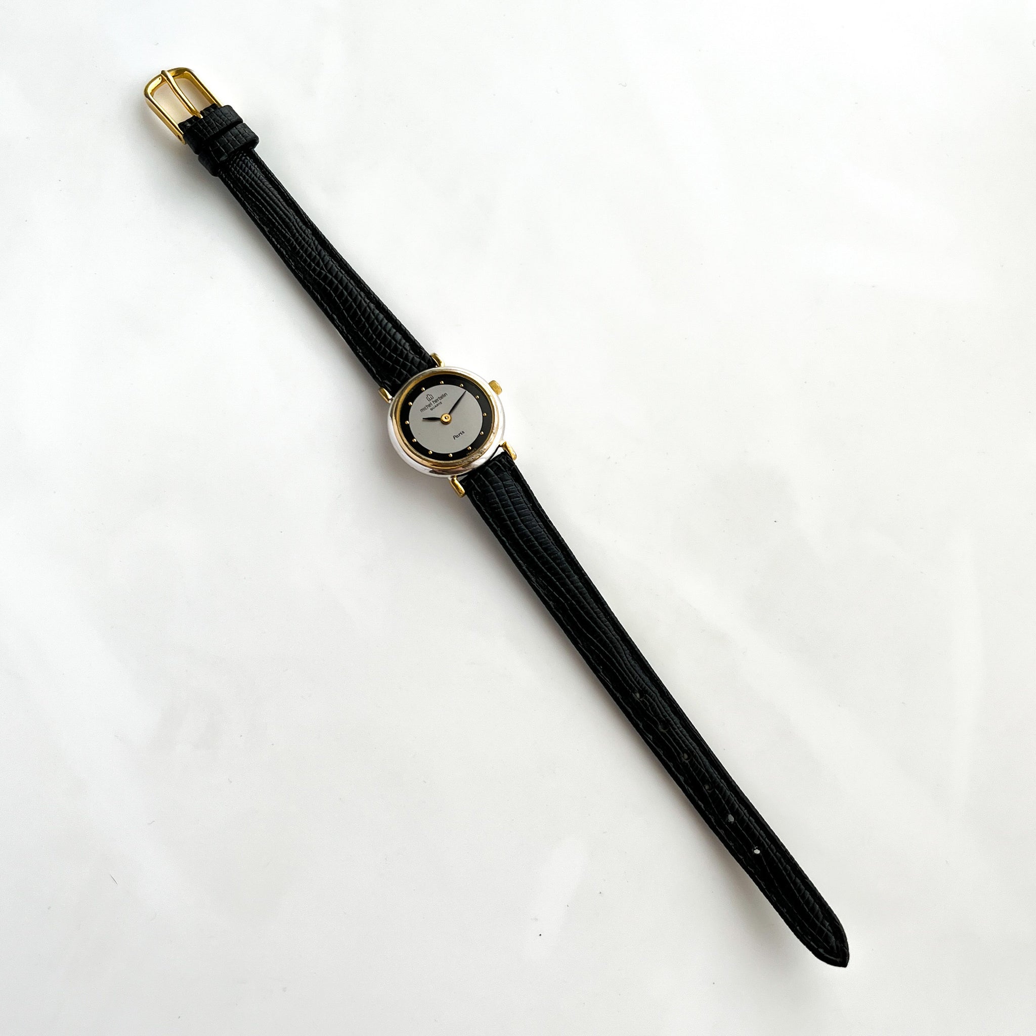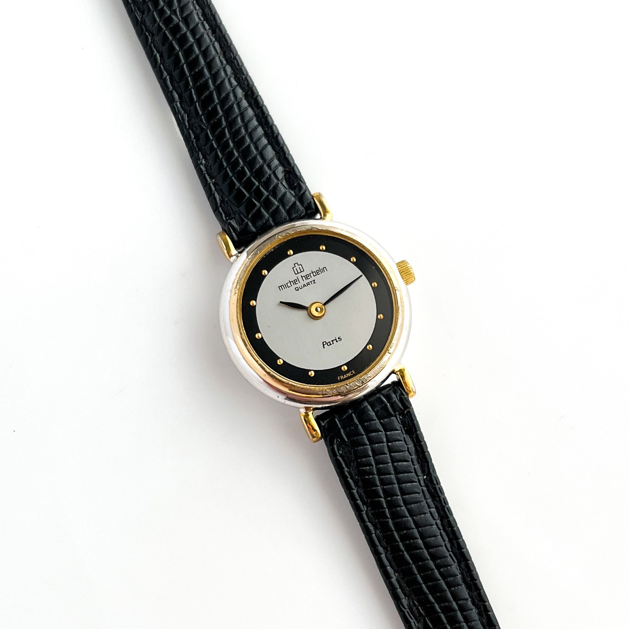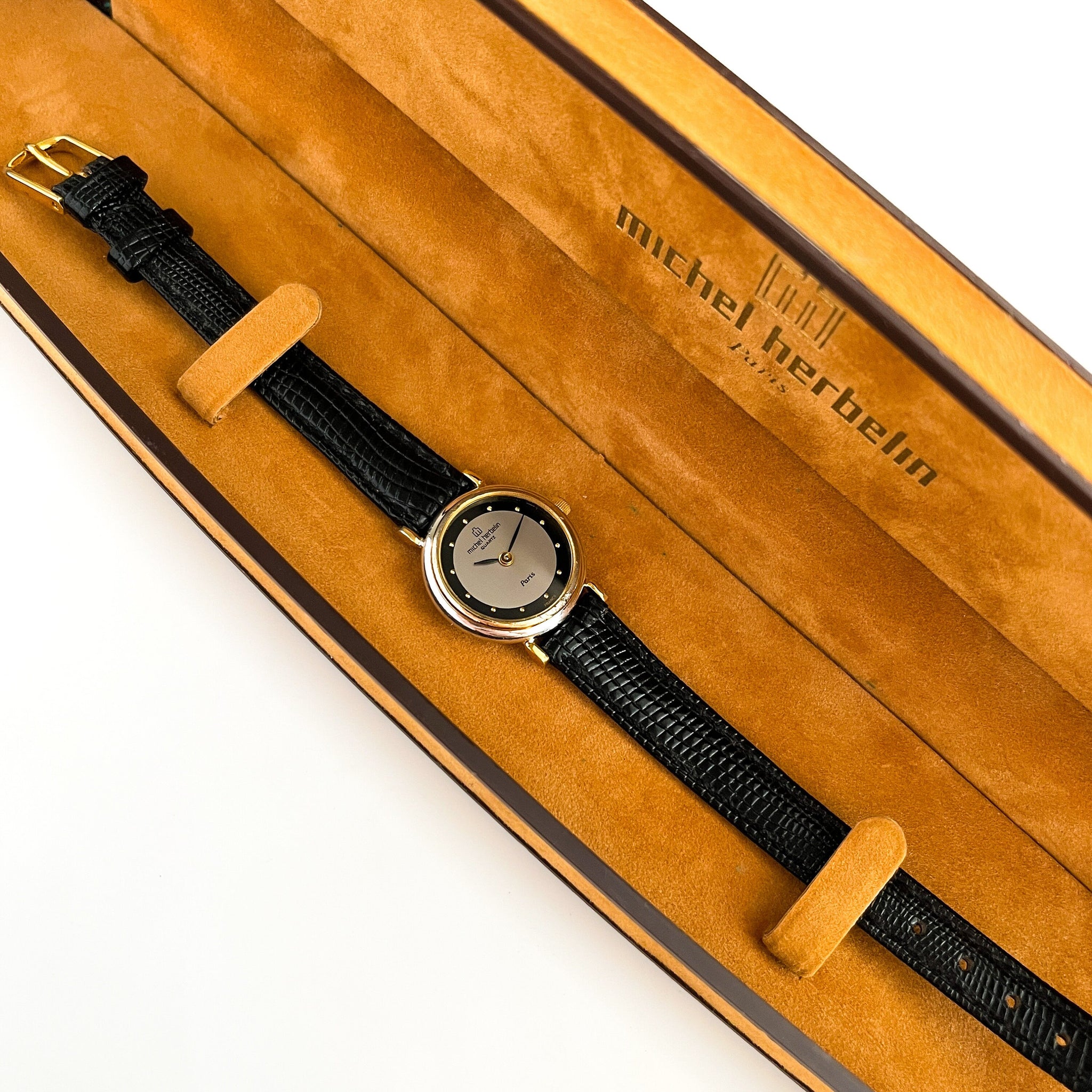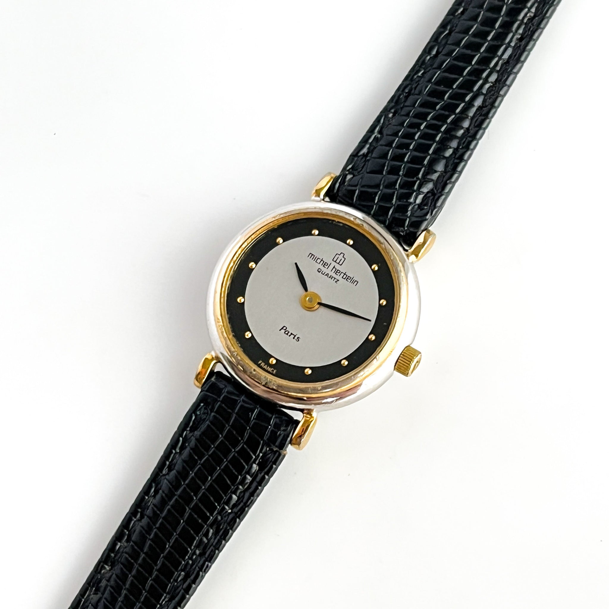 Tiny Vintage Michel Herbelin ladies' watch with silver and black dial, gold-tone indexes and two-tone case. It has a black leather strap. A dainty and elegant watch by the French watchmaker.
