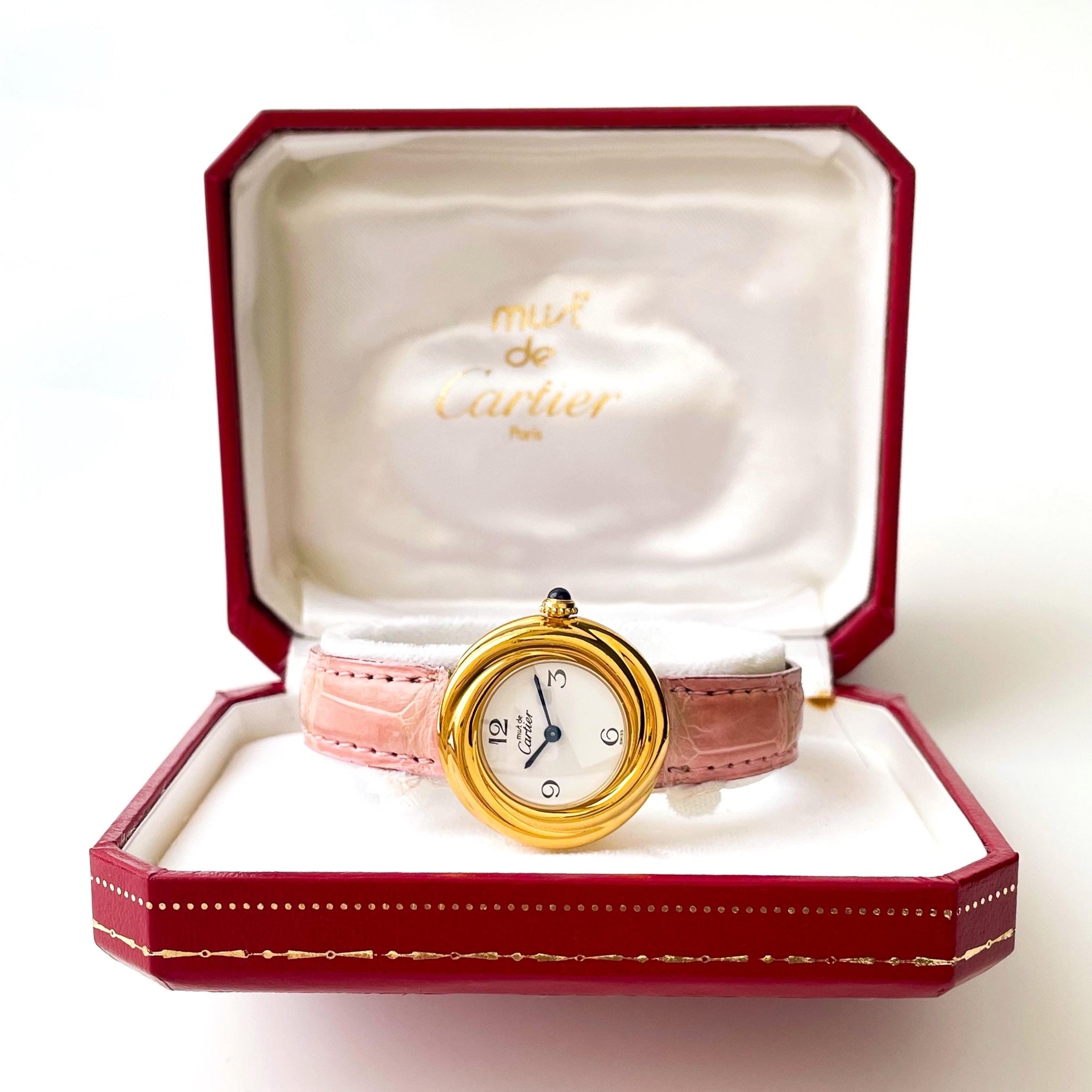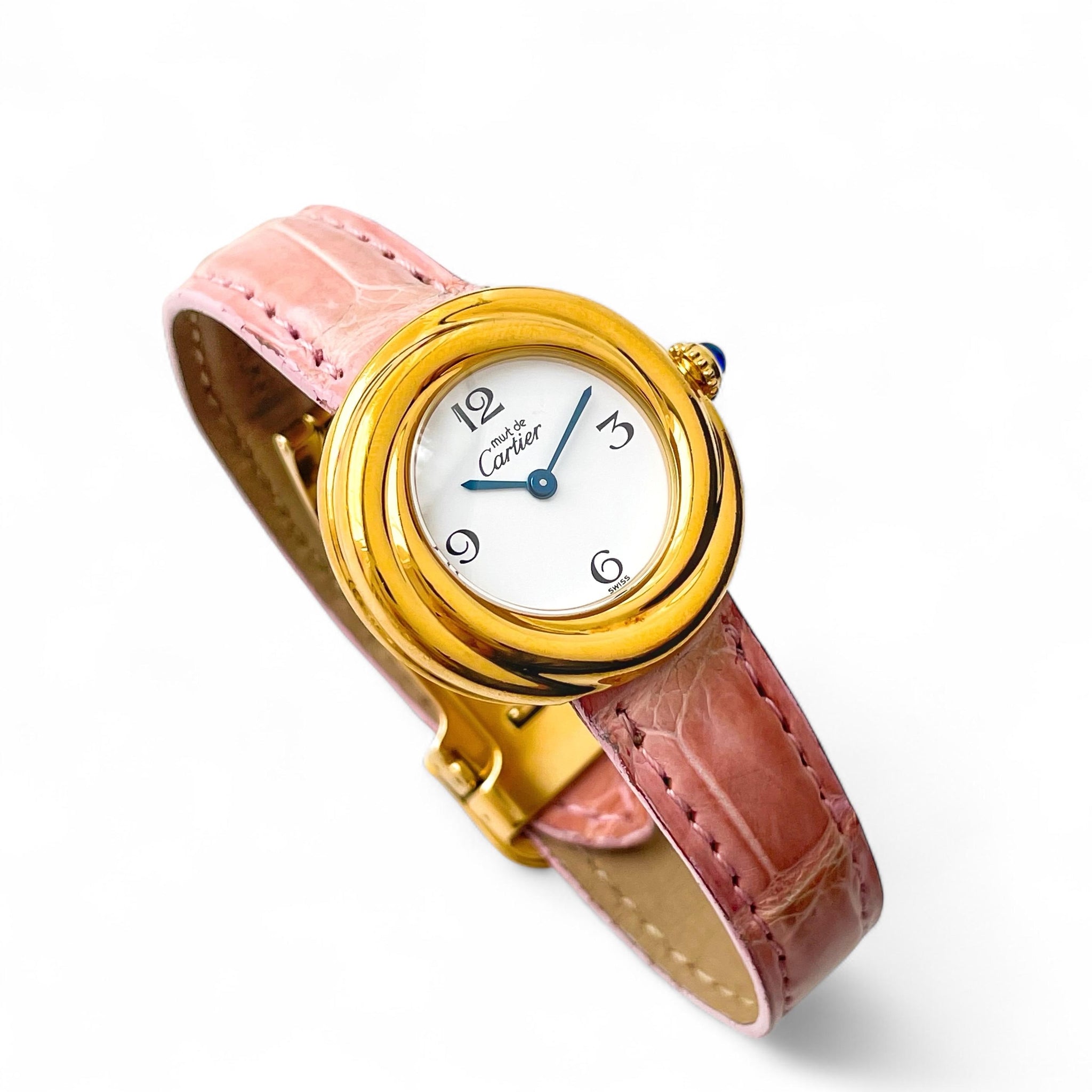 Vintage ladies' Cartier Must Trinity Vermeil, with white dial, light pink leather strap, fold-over clasp and classic blue cabochon crown. Solid 925 silver, plated with 20 microns 18ct gold. A stunning piece from the French luxury brand.