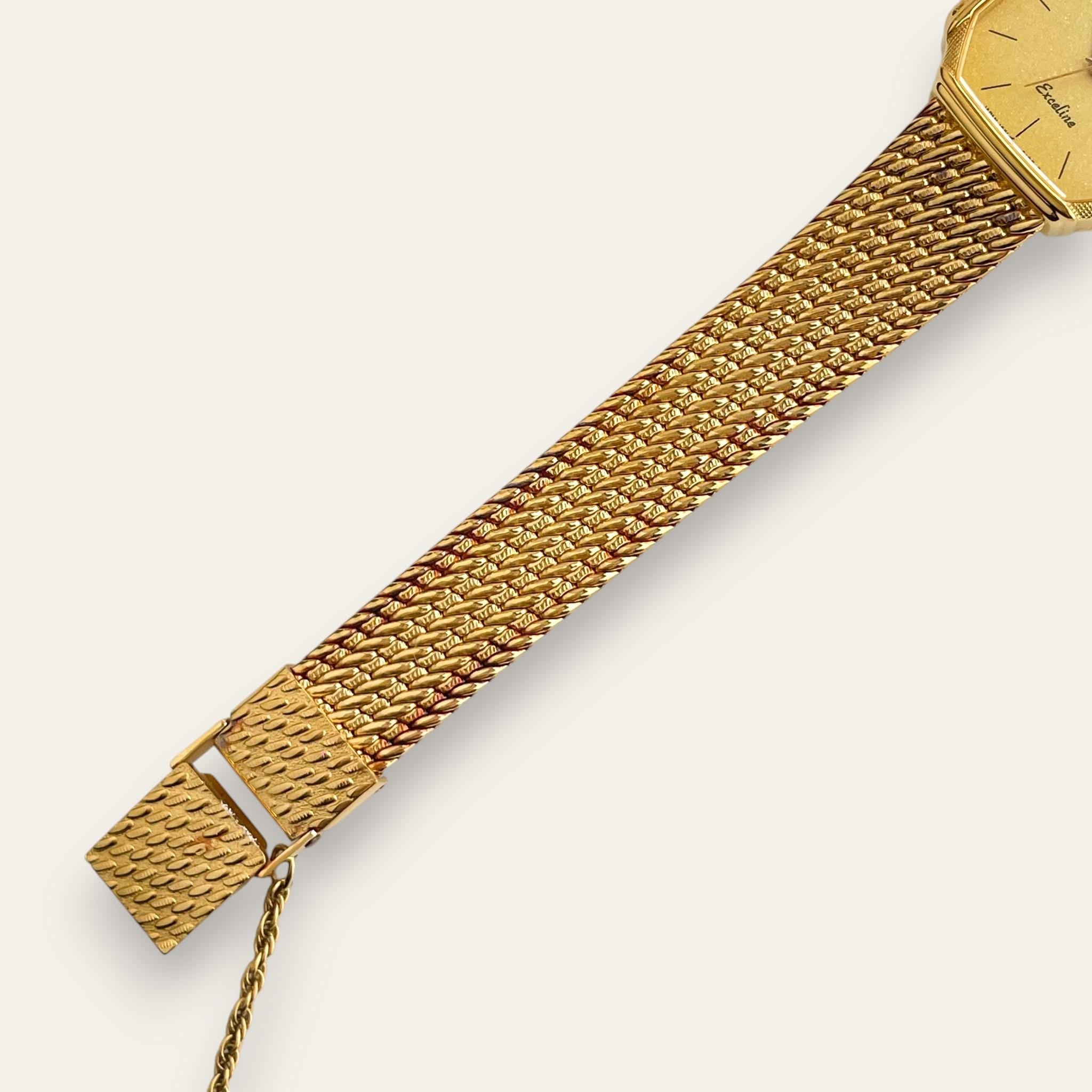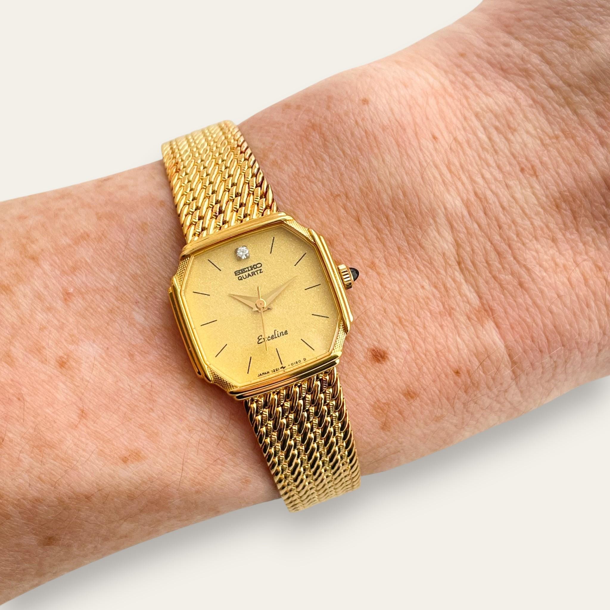 A Seiko Exceline dress watch from the early 1980s, from the brand's premium ladies' line. The octagonal gold-plated case carries a single diamond set at twelve, sitting against a champagne dial with no numerals. The wide braided mesh bracelet, entirely in warm gold tone, gives it the substantial presence of a fine jewellery piece. The case back retains its original sticker.