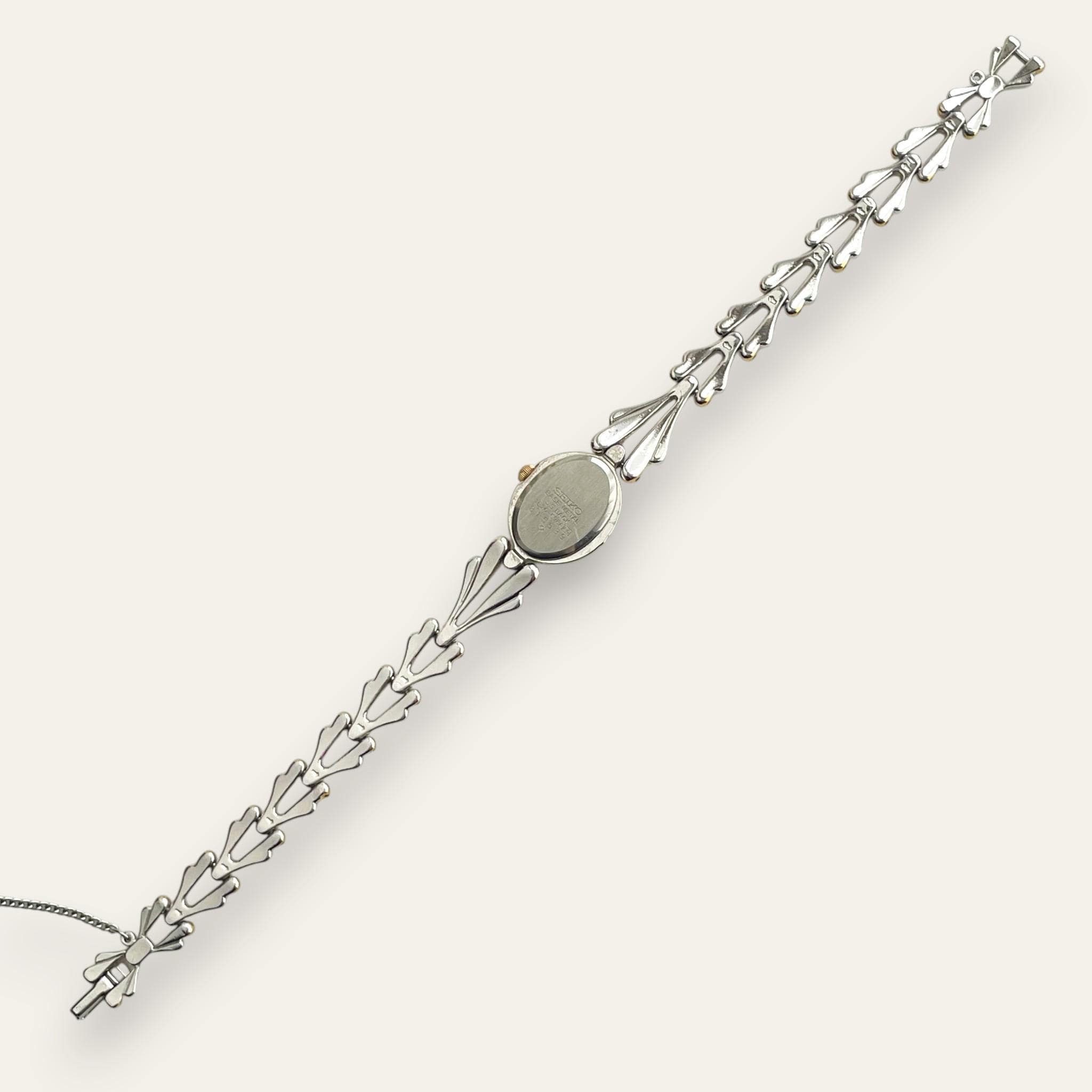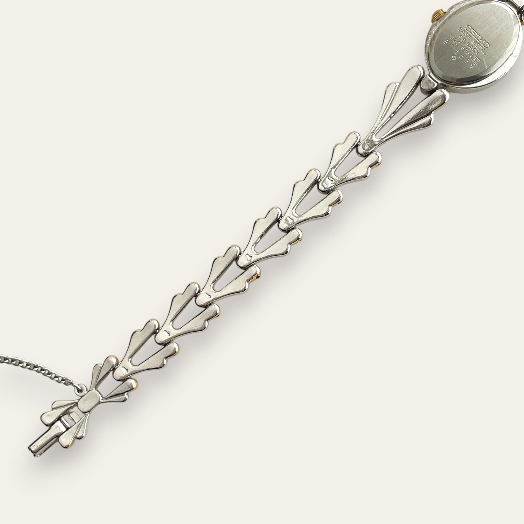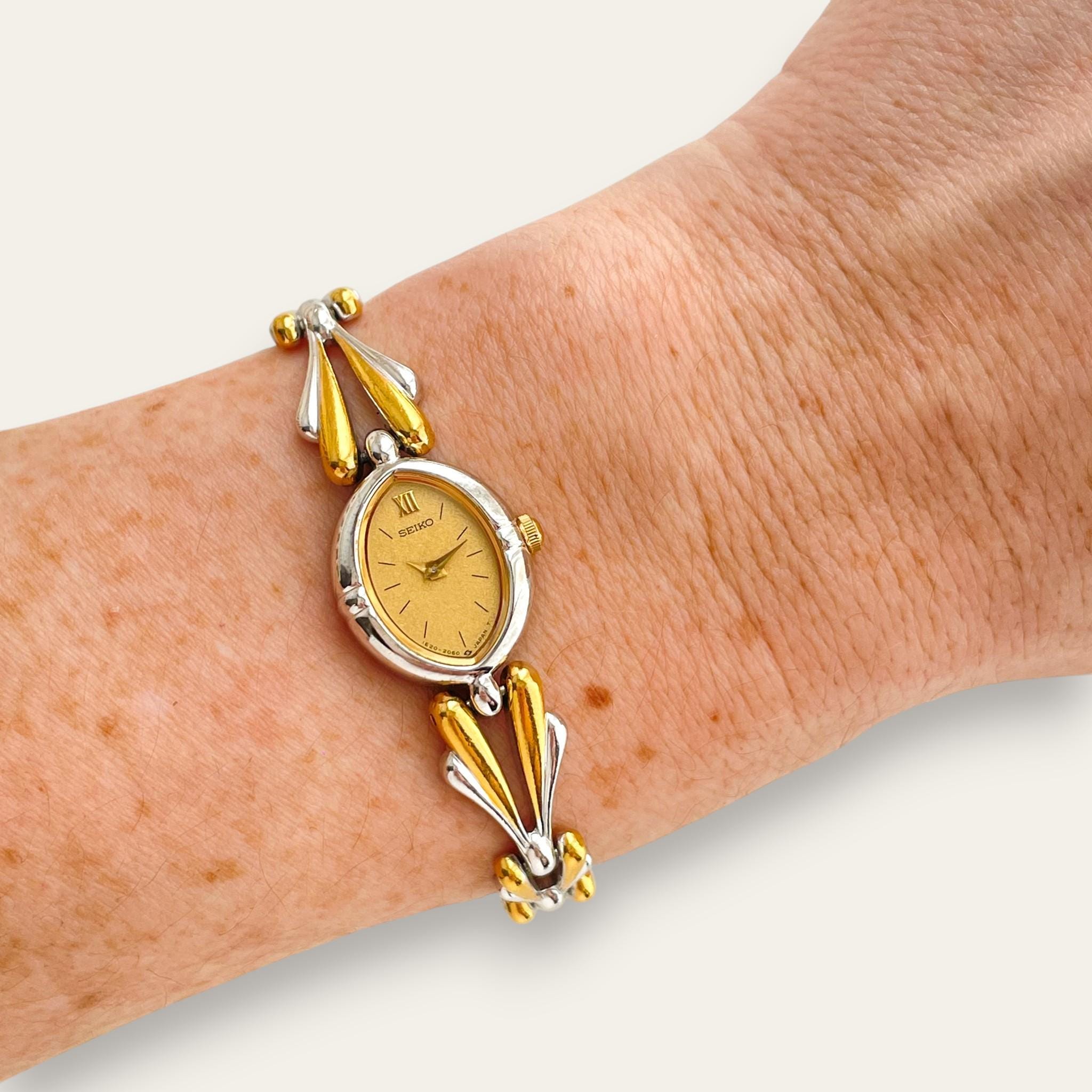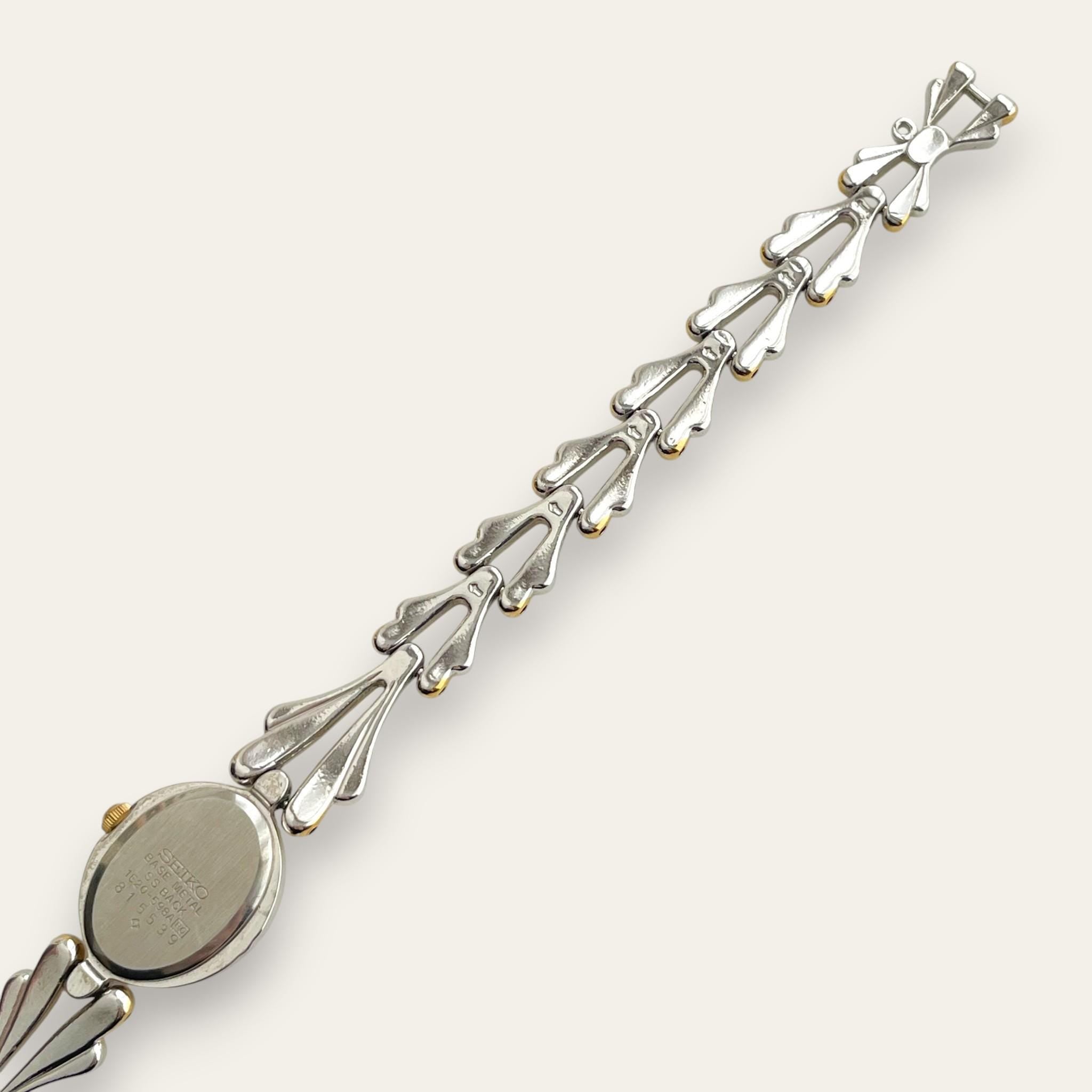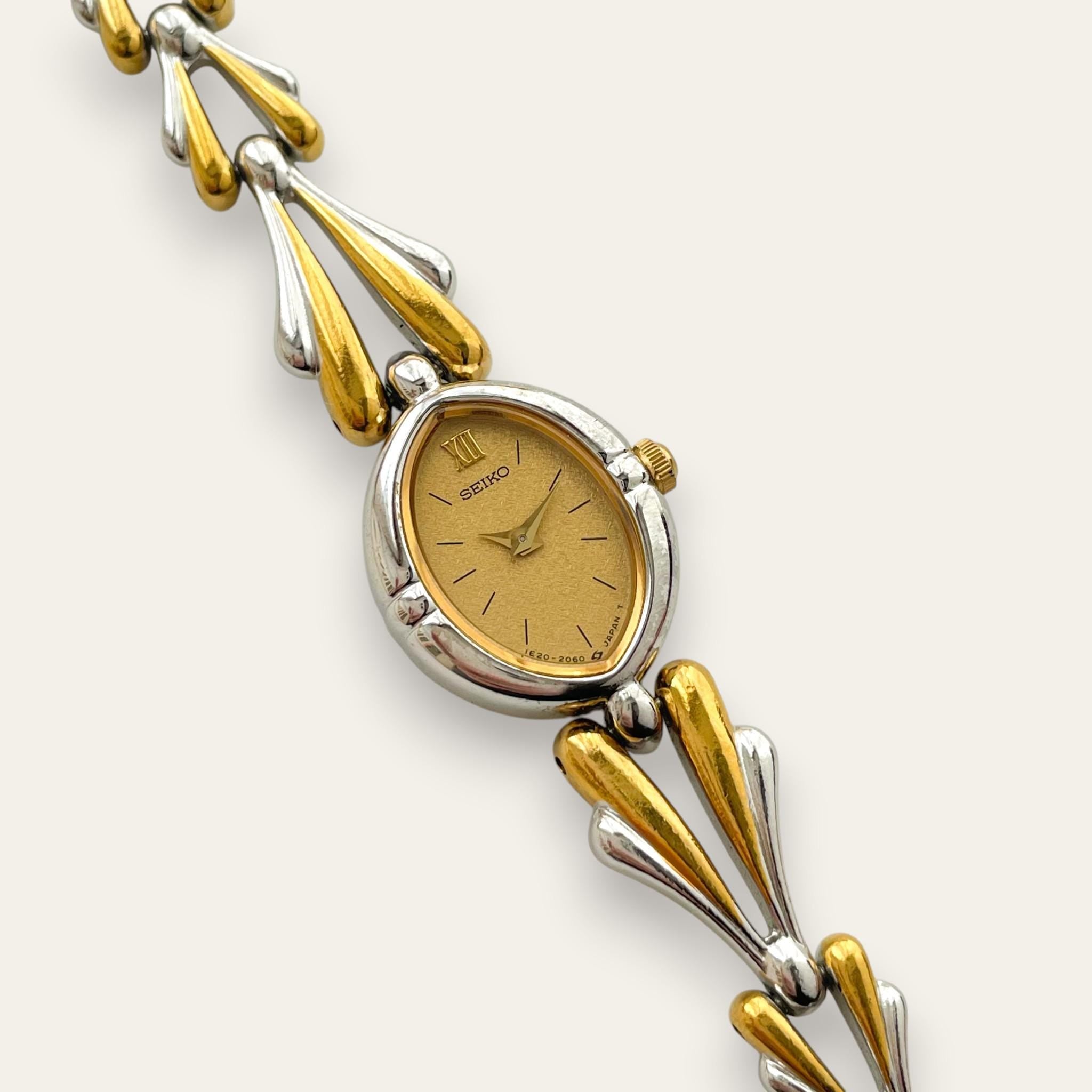 A Seiko dress watch from the early 1980s with an unusually sculptural bracelet — paired gold and silver teardrop links that give it the weight and presence of a jewellery piece. The oval champagne dial with a single Roman numeral at twelve keeps the face understated against the bracelet's drama.