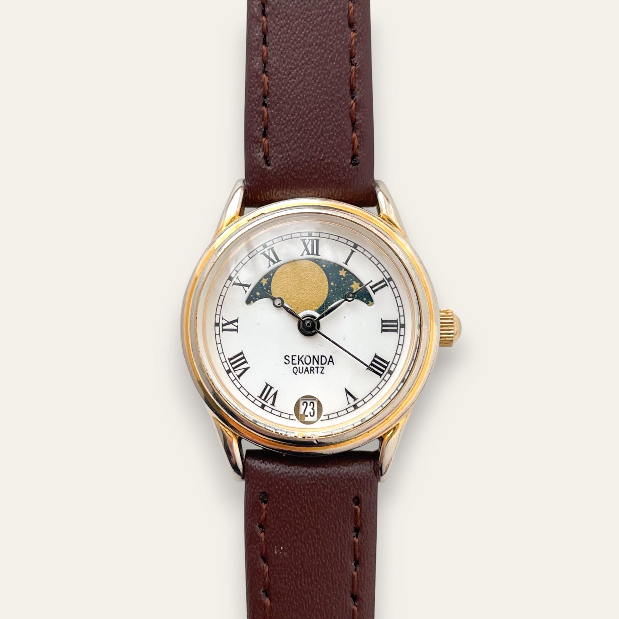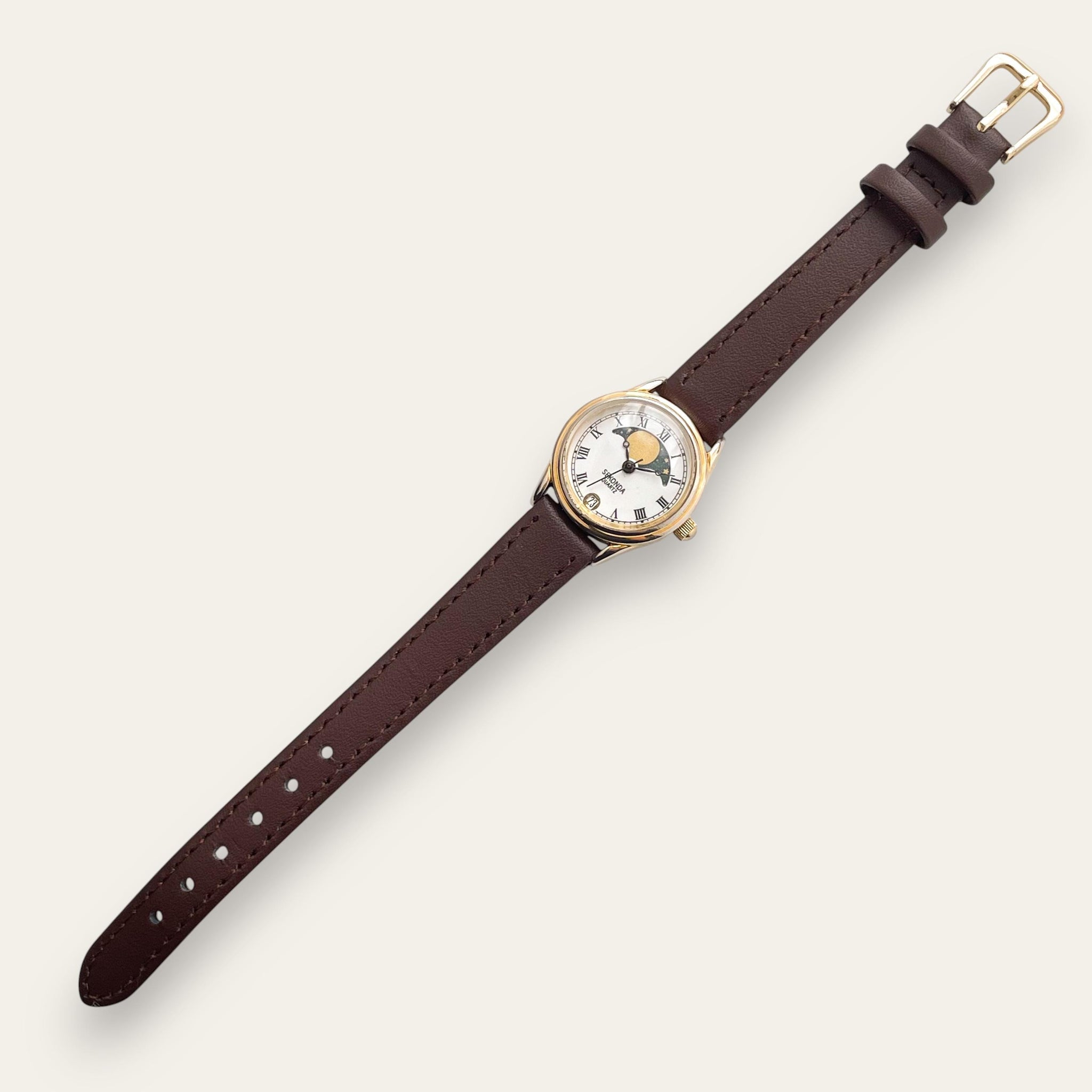 Vintage Imado Sun & Moon Quartz Watch - Brown Leather Strap