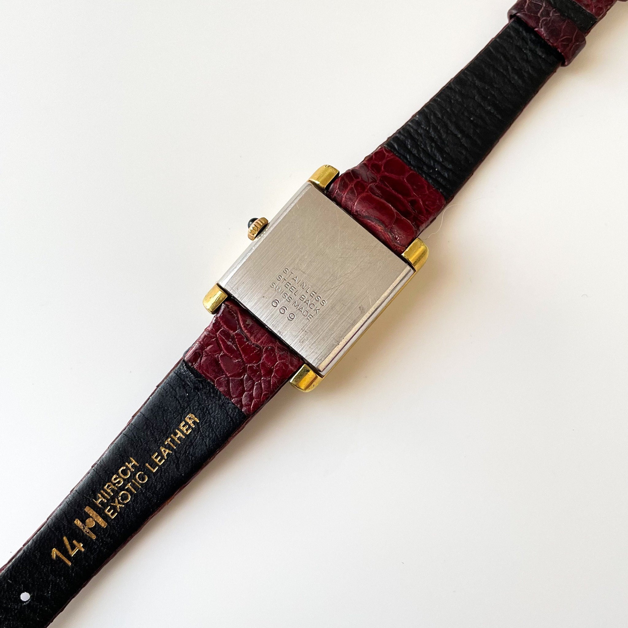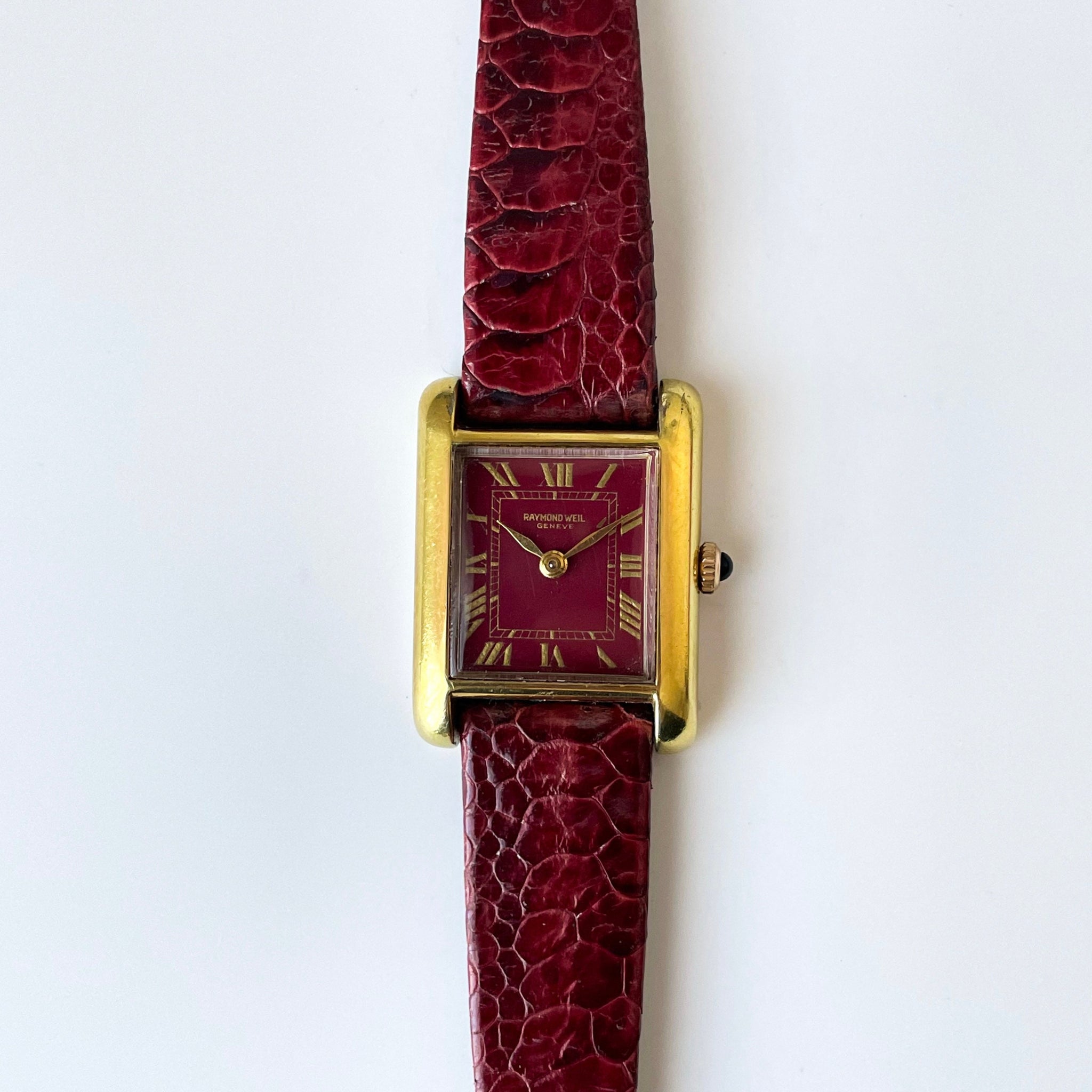 Rare Raymond Weil watch with elegant tank-style design, rectangular dial with Roman numerals, burgundy leather strap and cabochon crown. A classic and elegant vintage watch by one of the most famous Swiss watchmakers.
